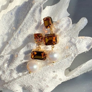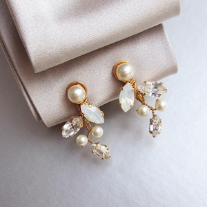 This delicate floral jewelry set is made with beautiful opal and clear Premium European Crystal and white pearls. Available in gold or silver finish and with white or ivory pearls. The earrings measure 1 1/2" long and 1/2" wide at the widest point. The necklace is 18" long.