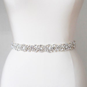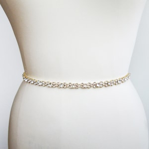 This gorgeous sash is made with Premium Quality European Crystals hand set in gold settings and appliquéd on a sheer tulle. The sash measures 3/4” wide and the length is made to fit. Hook and eye closure in the back. This belt can also be made in silver or rose gold finish at your request.