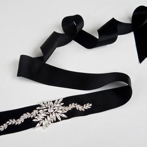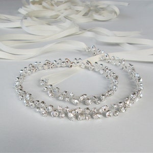 This beautiful super skinny bridal belt is made with glistening step cut Premium European crystals beaded on a 1/8" wide ribbon. The crystal part of the belt measures 25" long and the center stone measures 1/2" wide. Finished with the 1/4" satin ribbon ties in the back. The entire sash measures 150" long. Available in gold or silver finish.