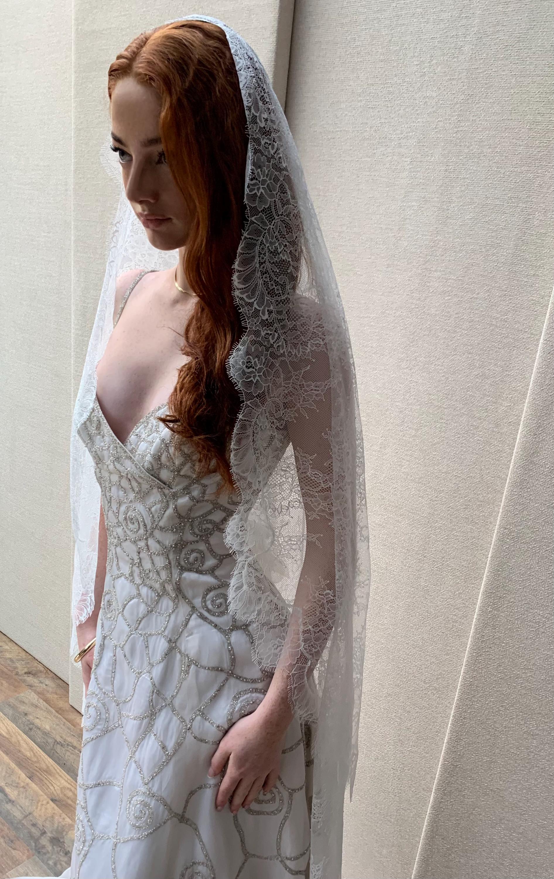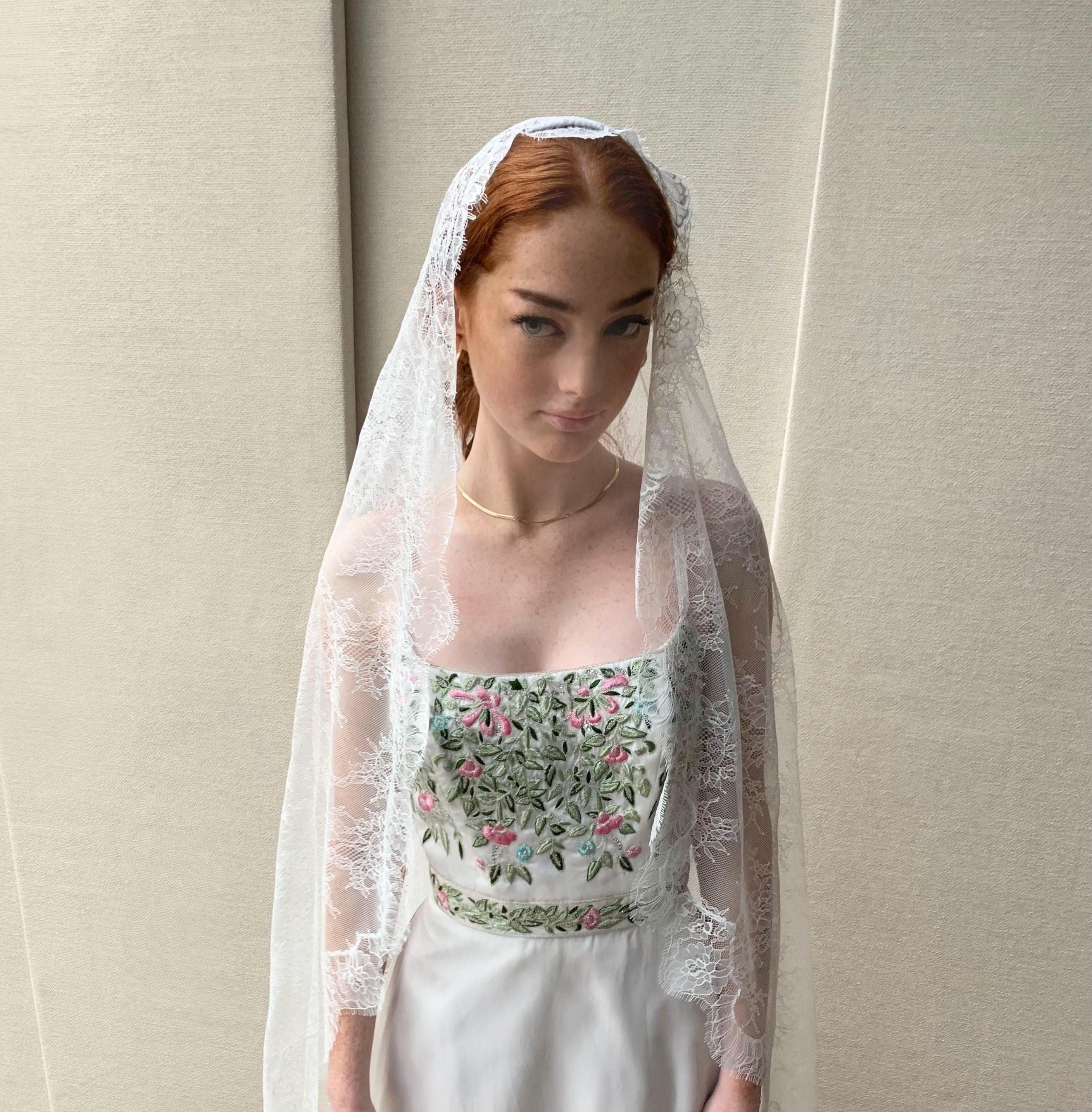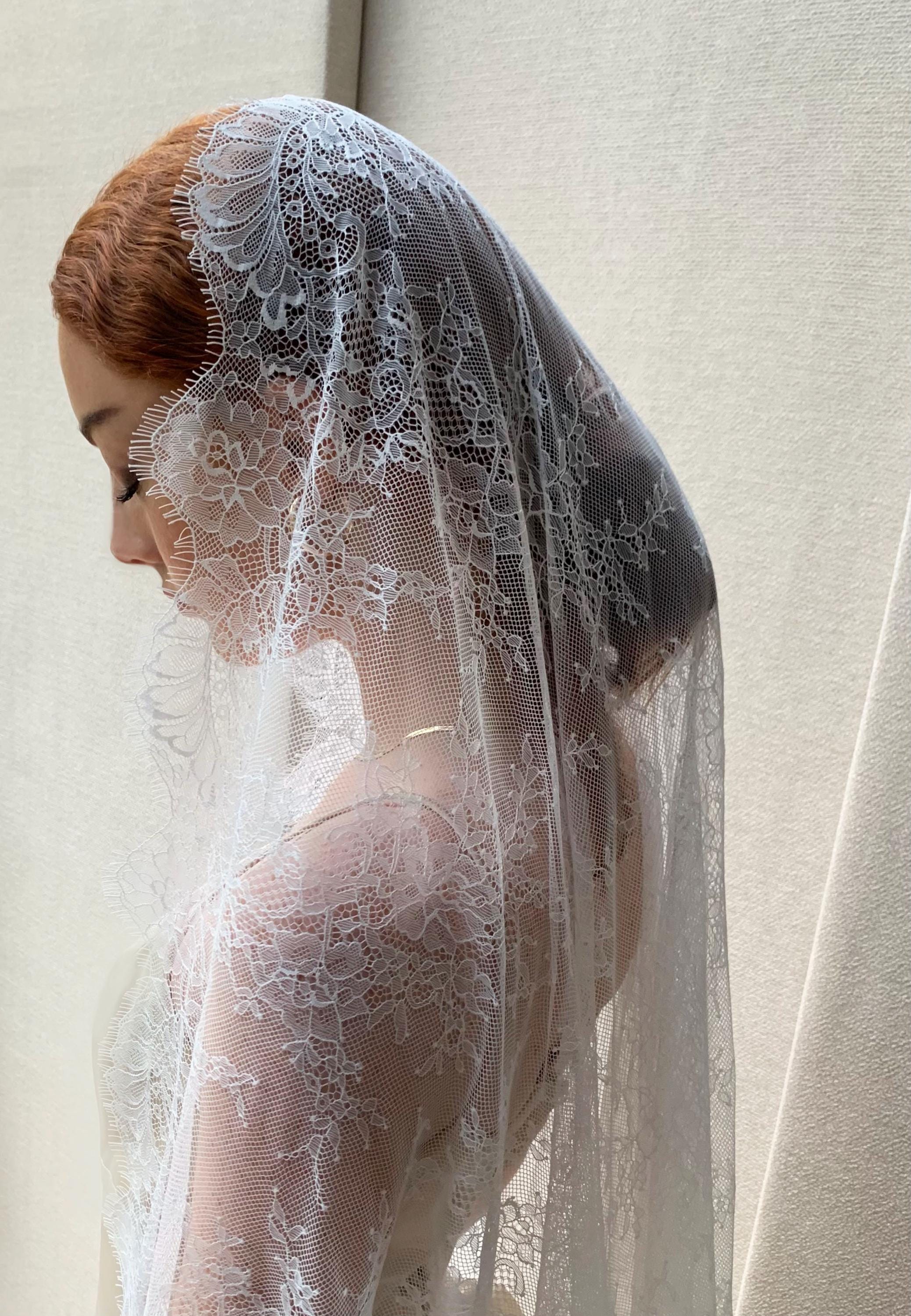 This stunning mantilla veil with super delicate Chantilly lace will add a soft romantic touch to your wedding look. Hand made entirely with beautiful floral soft high-quality lace. The veil is secured in your hair with the comb on top of your head. This Ballet length veil measures 64" long from the hair comb to the bottom of the veil. The color of the veil is soft white and will work with white or diamond white/light ivory dresses. Also available in the Cathedral length.