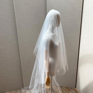 This super elegant delicate veil is made with fine quality tulle that is soft and sheer. This veil features a wider width of the veil which provides more body and beautiful drape. It is secured in your hair with the comb on top of your head. Available in Blush, White, Off white, Ivory or nude tulle. The veil in the photos measures 73" long from the hair comb to the bottom of the veil. Shown in the photos in off white color choice.