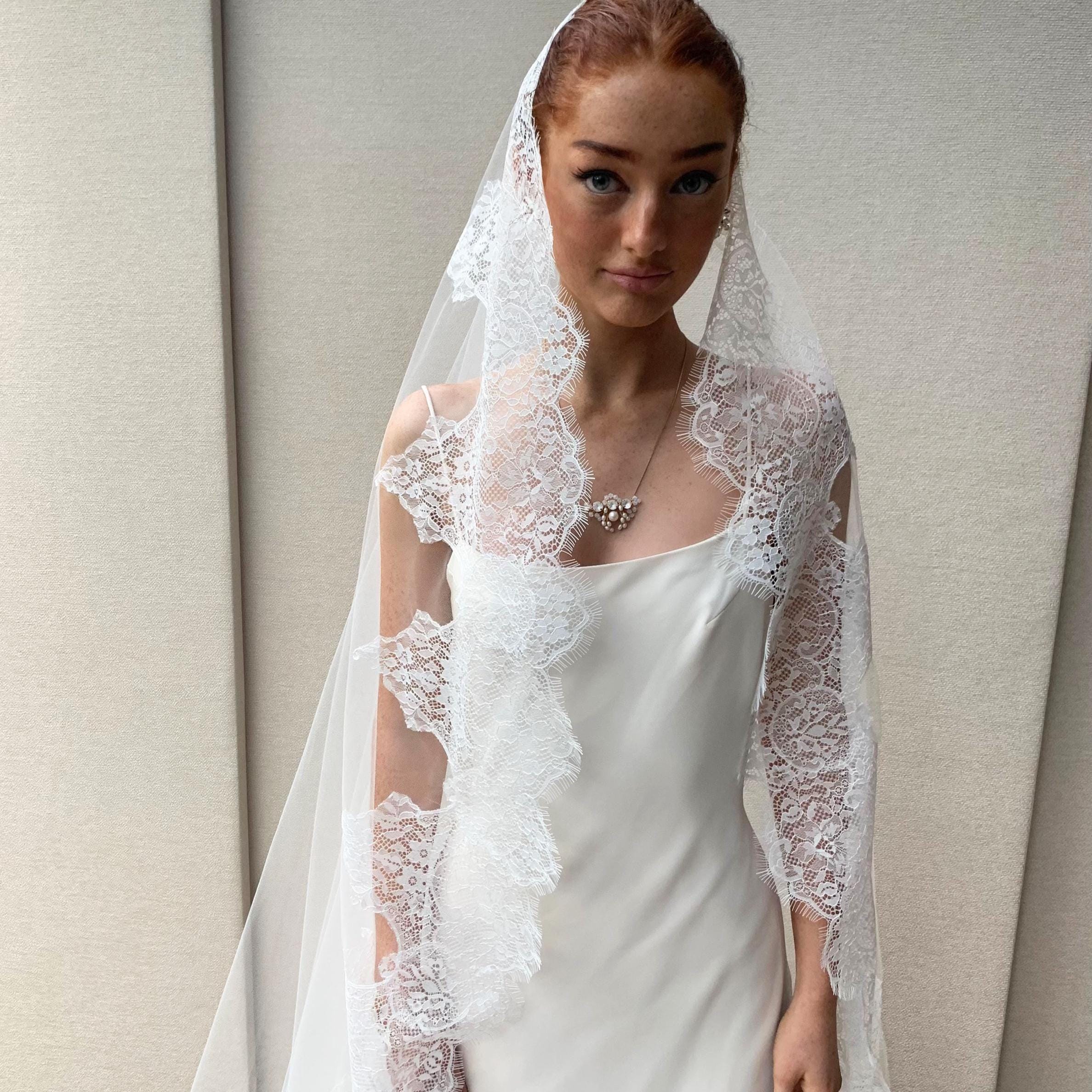 Grand luxurious mantilla style veil featuring vintage inspired Chantilly lace trim. This veil is made in the wider width insuring an elegant drape. The veil is secured in your hair with the comb on top of your head. The veil in the photos is a cathedral length and measures 110" long from the hair comb to the bottom of the veil. Other lengths are available as well. The color of the veil is soft white and will compliment white, off white or light ivory dresses.