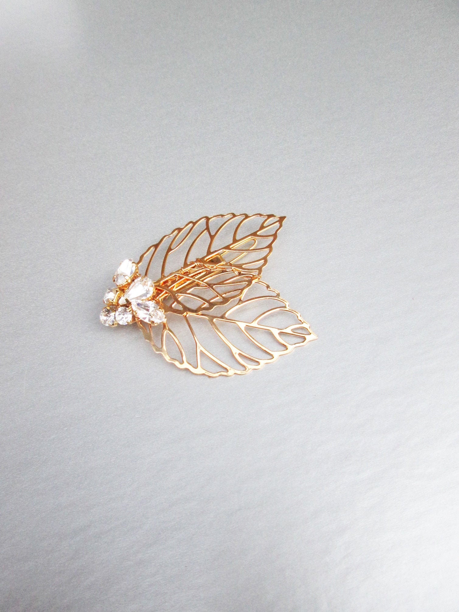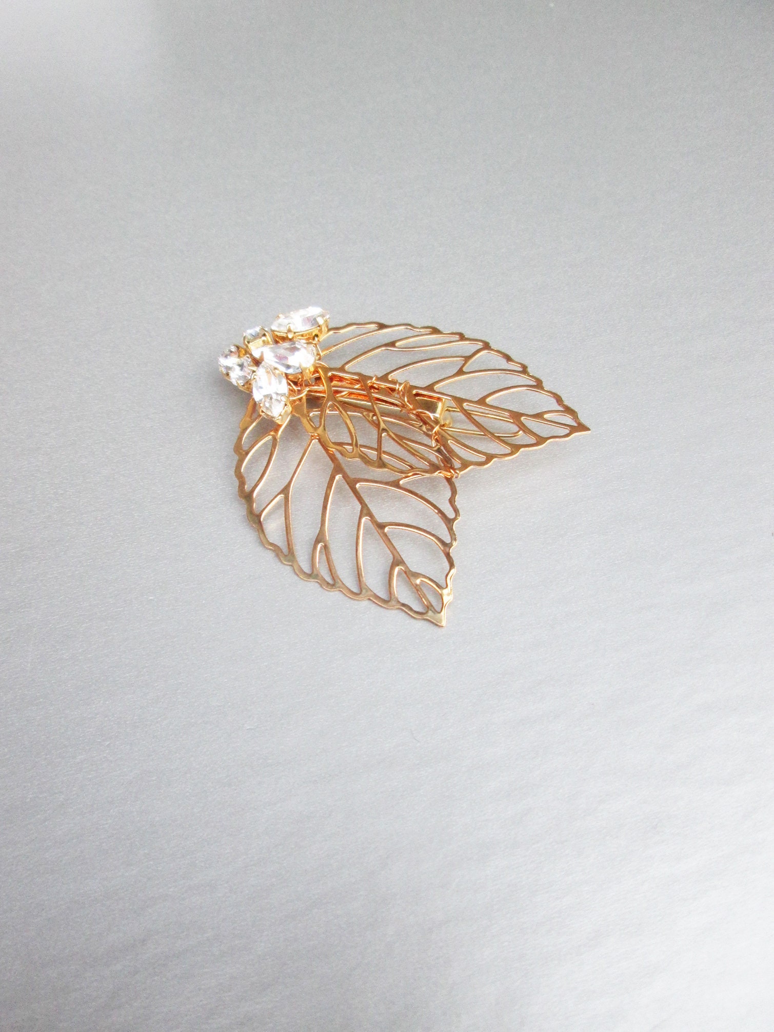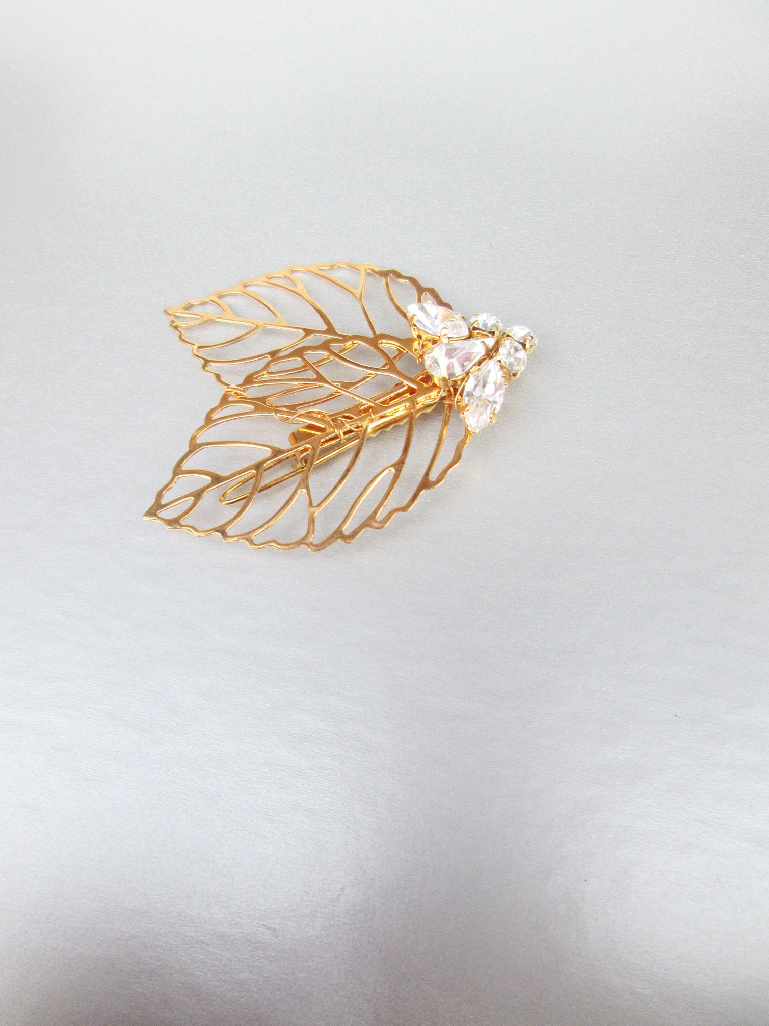 This lovely hair clip is made with the Premium European Crystal and feature delicate cut out pattern leaves. It measures 2 1/4" long and 1 3/4" wide. Available in gold or silver finish.