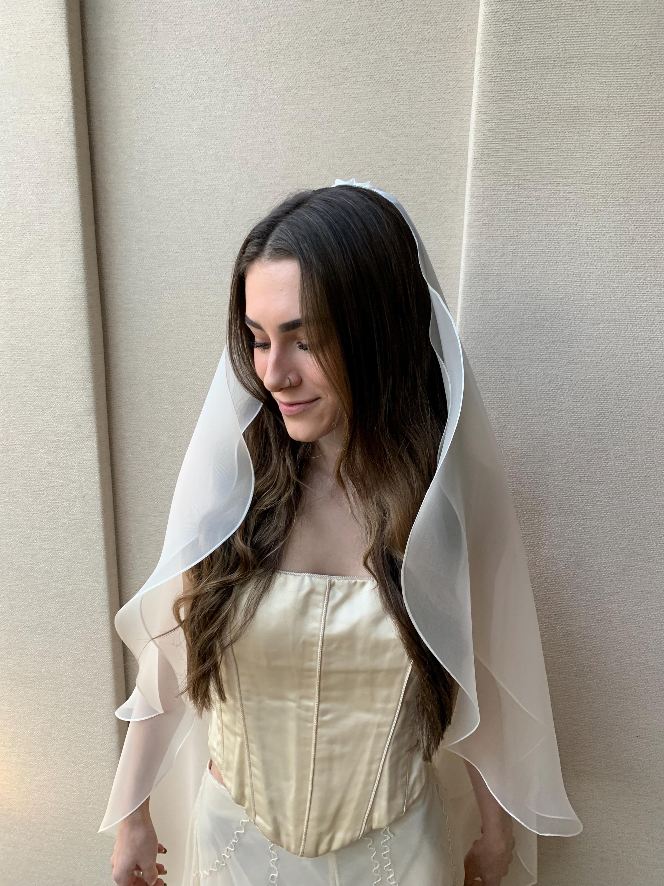 This exceptional luxurious bridal veil is so delicate and fluid. Beautifully hand-made with 100% silk organza meticulously finished with the cascading rolled edge hem. This two tier veil features long blusher that can cover your holding bouquet if desired. The veil is attached to a metal comb for easy positioning in your hair. Shown in the photos in ivory. Shown in the first photo in the Knee Length/57" option. Available in several lengths to choose from.