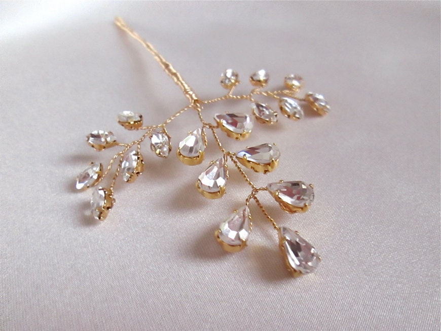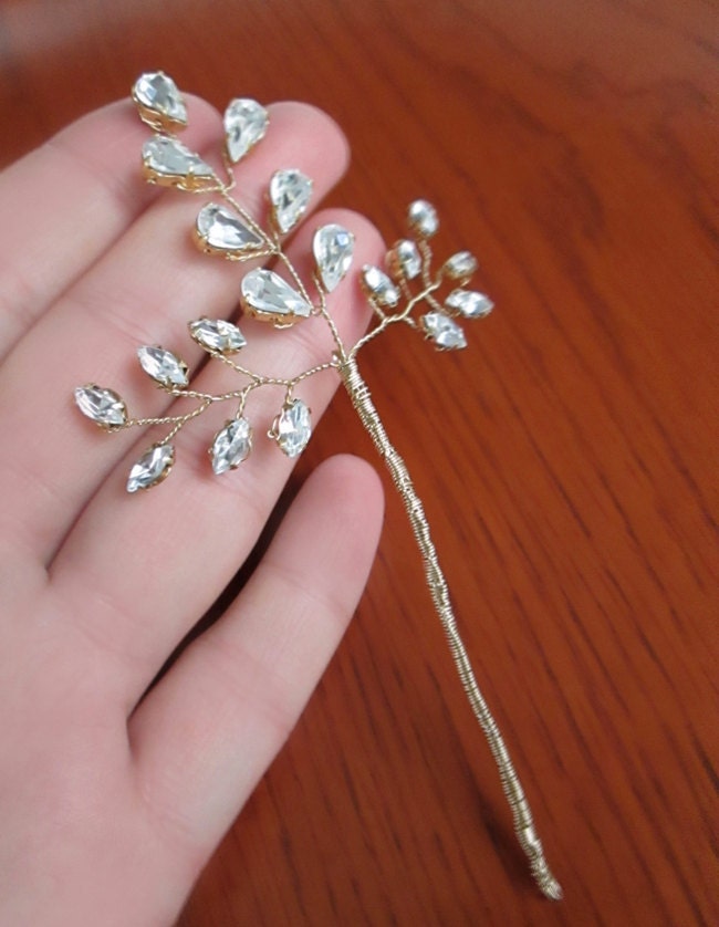 This delicate branch topped with the Premium European Crystal will add a modern sophisticated touch to your hair style. This hair pin is light and flexible, making it comfortable to wear and easy to style. The pin measures about 5 1/2" long in total length. The decorative part measures about 3 1/2" wide and 2 1/2" high. Available in gold, silver or rose gold finish.