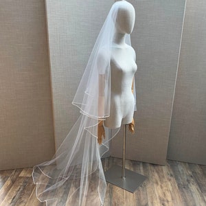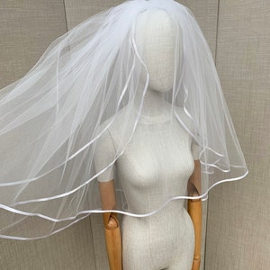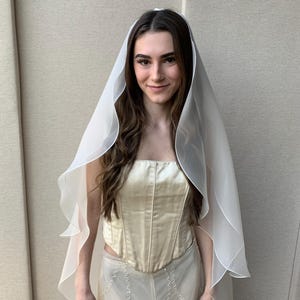 Chic luxurious drop bridal veil that so graceful and elegant. Beautifully hand-made with delicate 100% silk sheer organza. The length of the veil in the photos measures 28" while the blusher measures 18" long. The veil is attached to a metal comb for easy positioning in your hair. Shown in the photos in off white. If you would like to order the swatches of the silk organza colors please take a look at the listing below:
