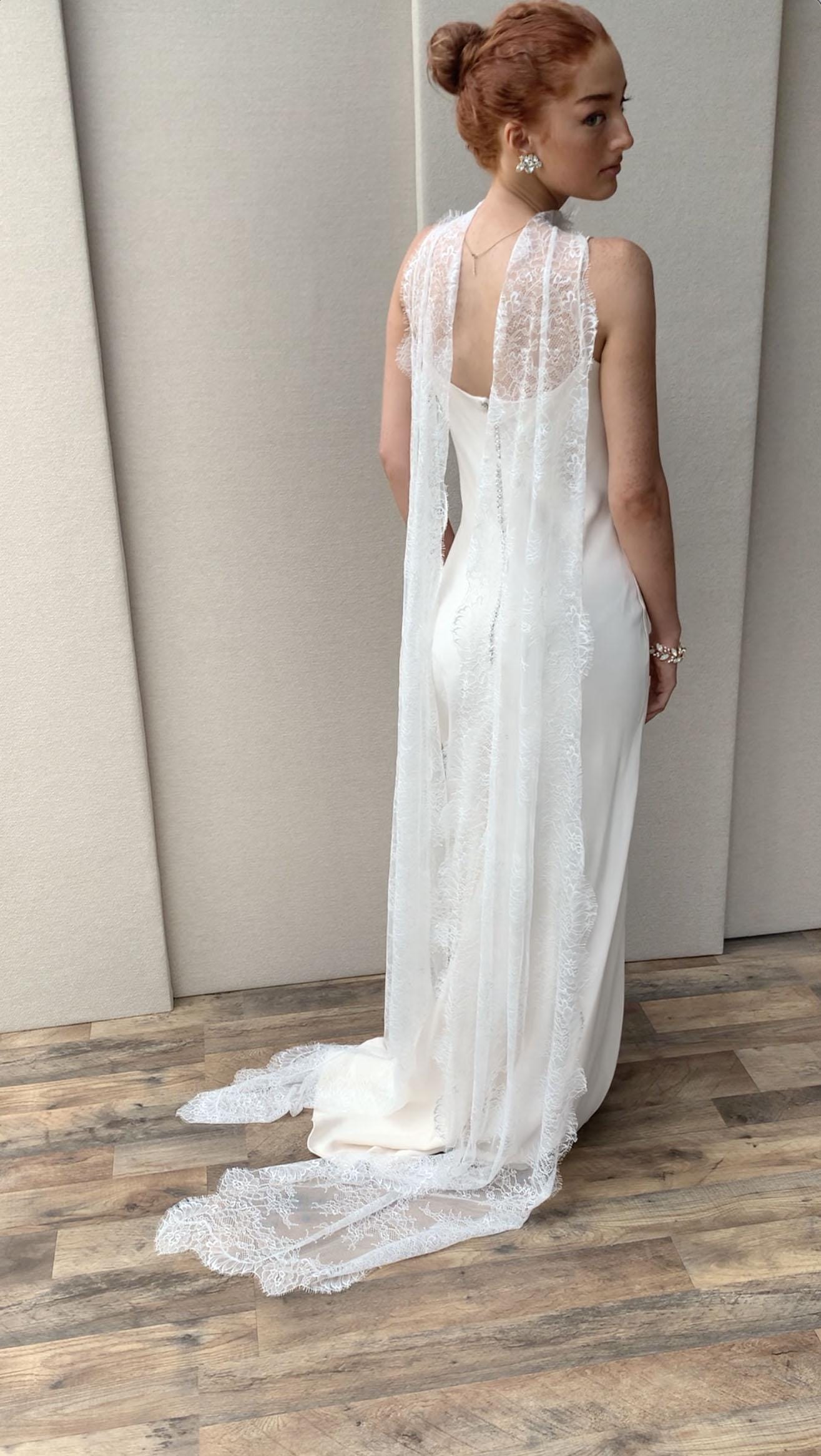 This lovely romantic scarf is all about the lashes. Soft and delicate bridal scarf beautifully handmade with lovely Chantilly lace. This shawl features flattering narrowing design at the neck with the flower detail finished with a genuine freshwater pearl. It can styled several different ways, you can even use it as a sash. The scarf measures 80" long from the shoulders down to the ends. The color of the lace is soft white/off white color.
