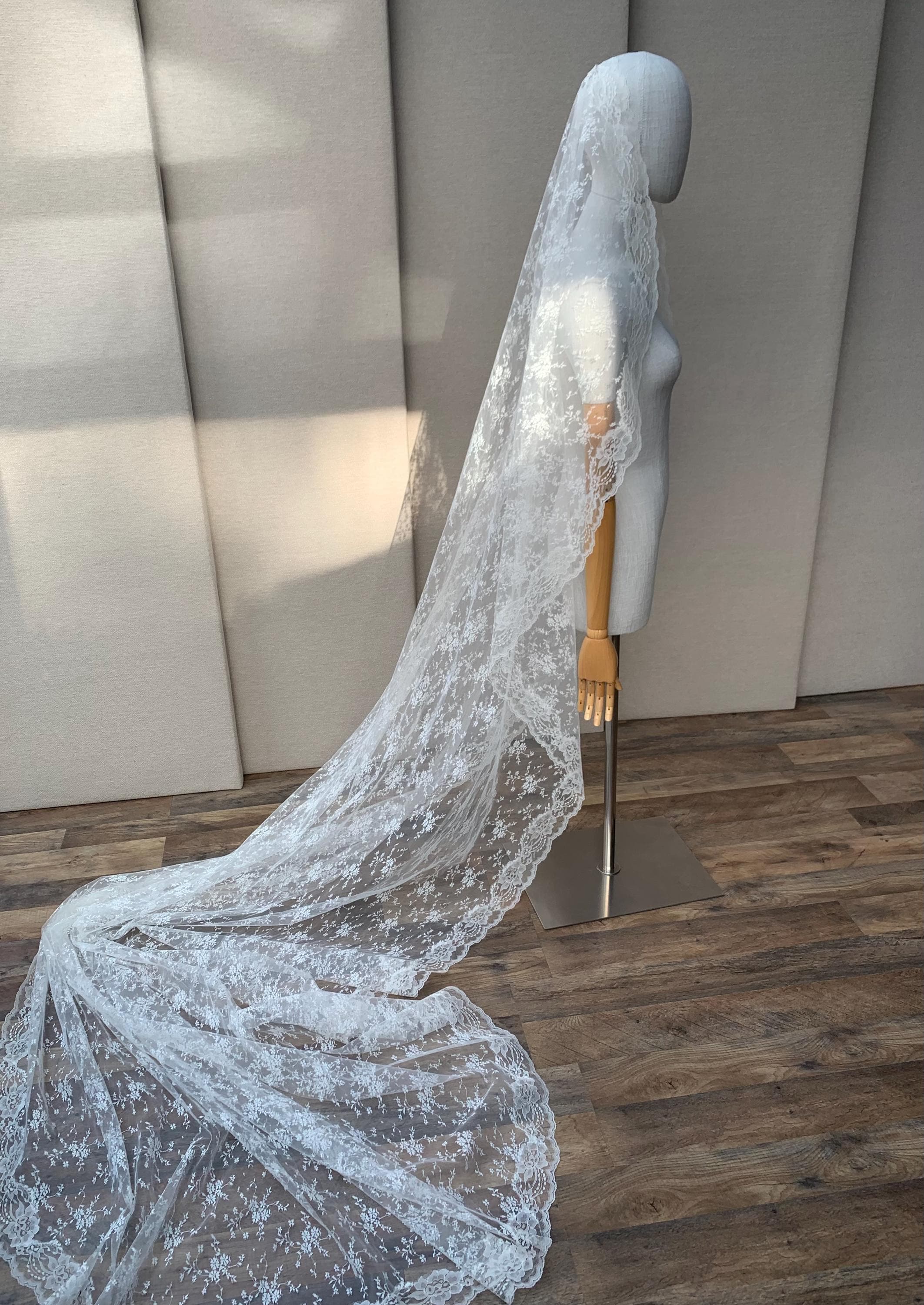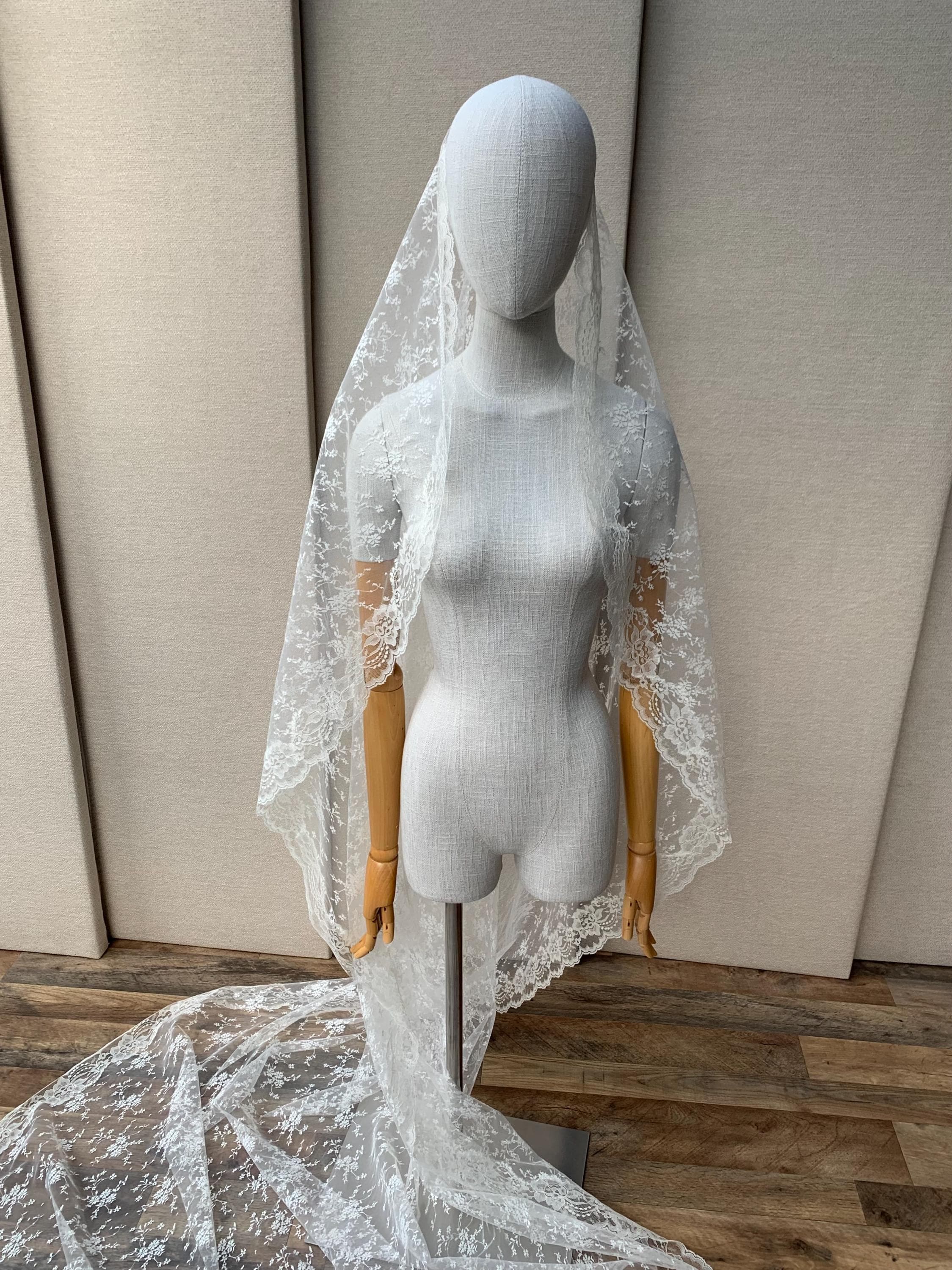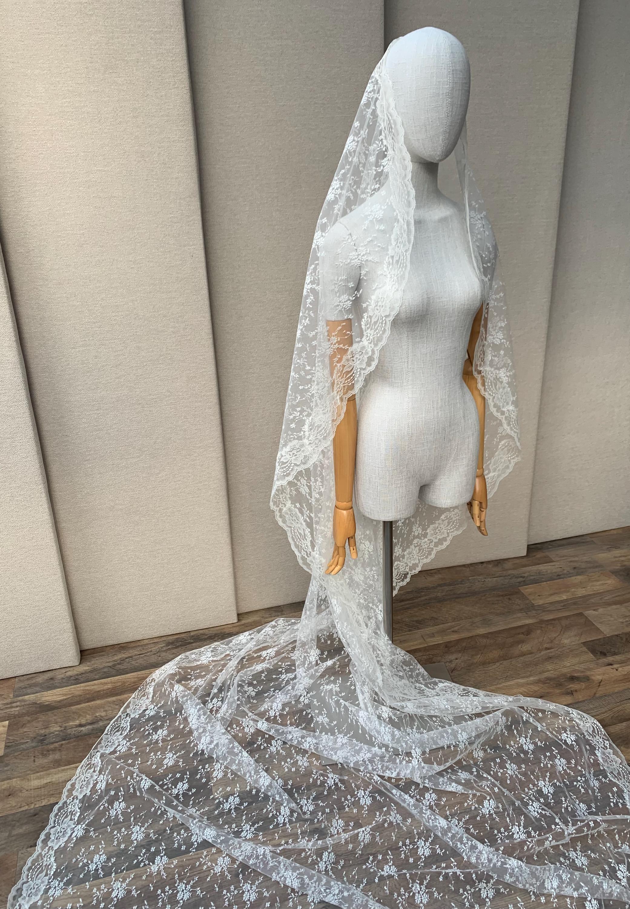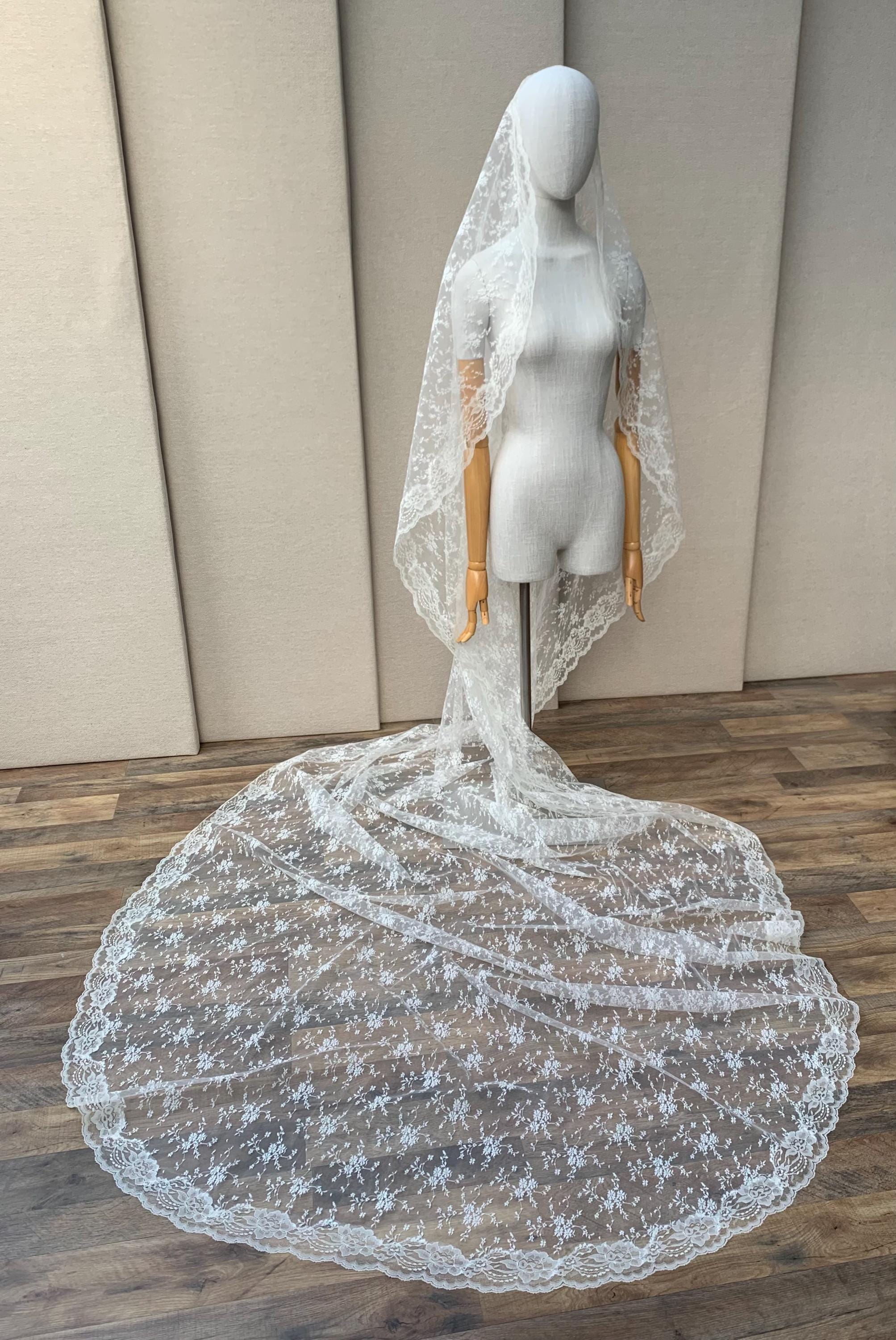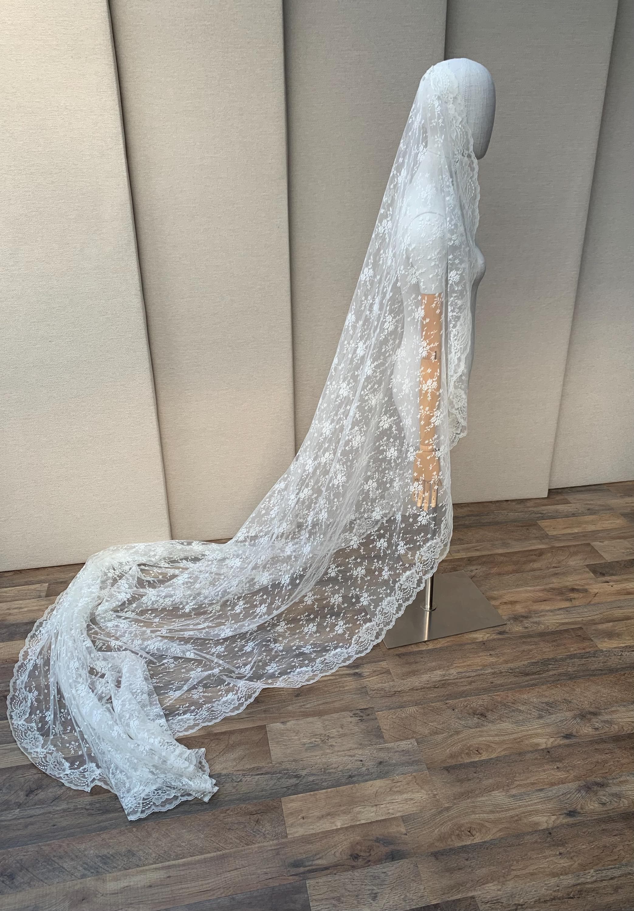 Romantic Chantilly lace mantilla style veil featured in a royal length. Beautiful floral pattern lace with the scalloped edge trim. The veil is secured in your hair with the comb on top of your head. The veil measures 132" long from the hair comb to the bottom of the veil. The lace is in a light ivory color. Also available in soft white or antique color.