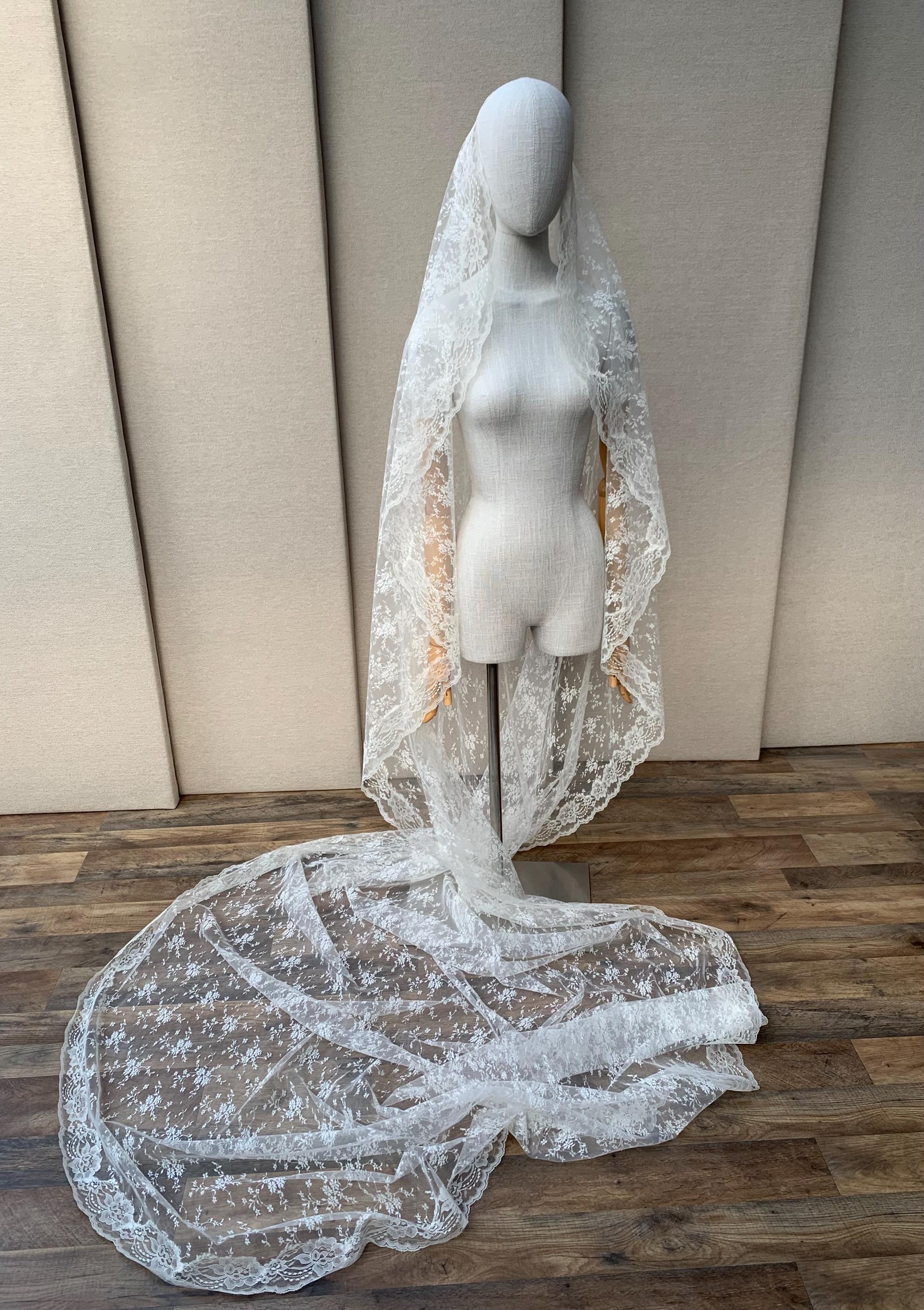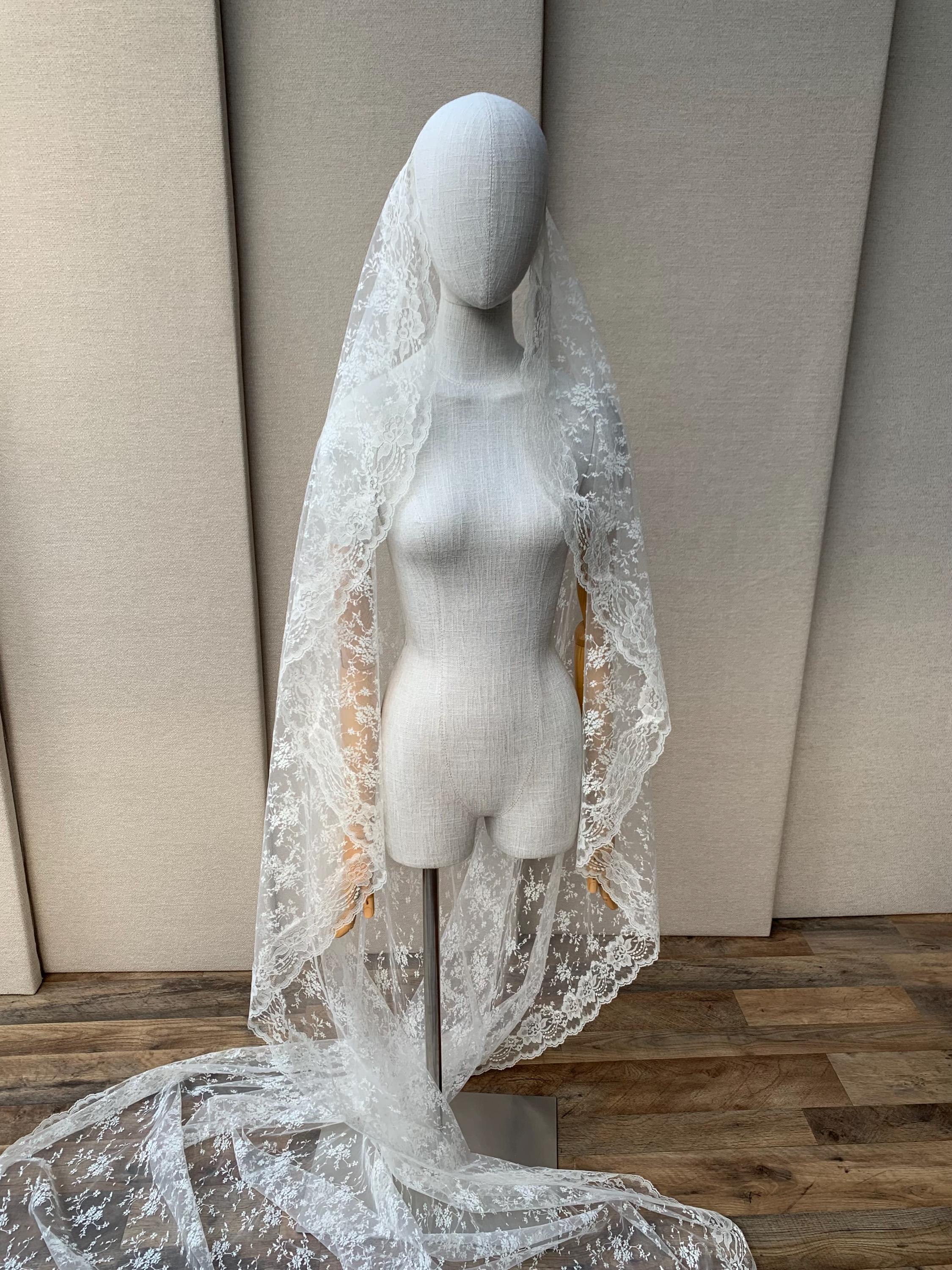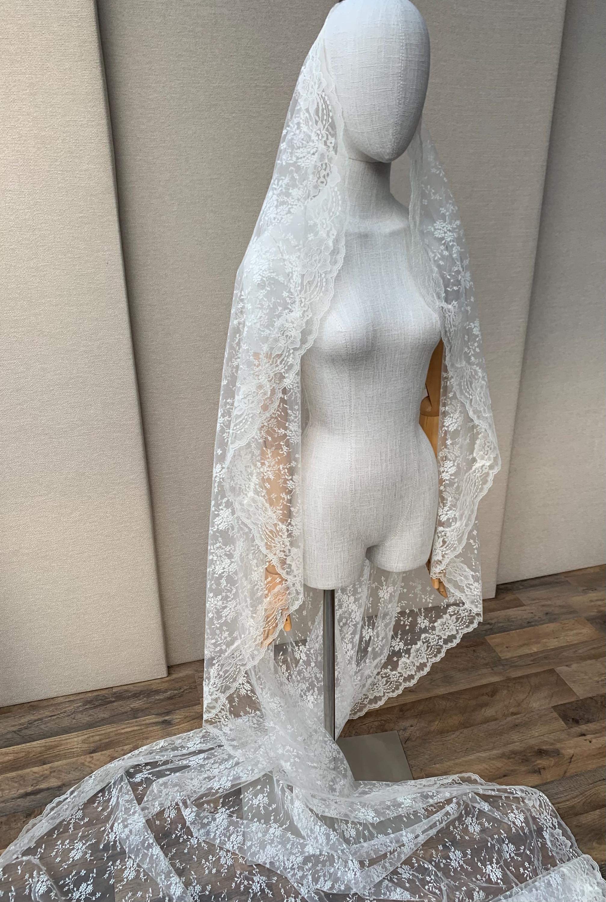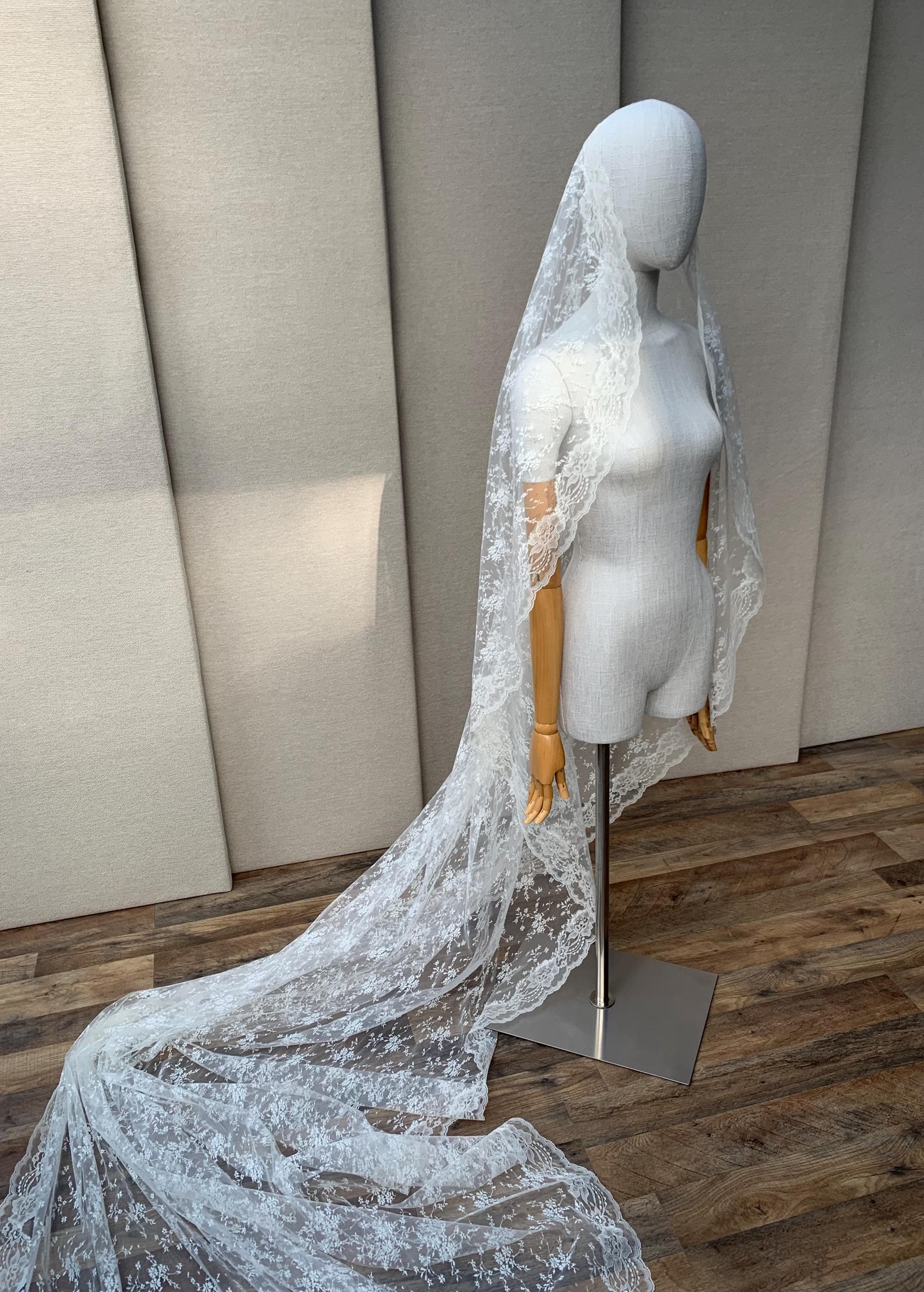 Romantic Chantilly lace mantilla style veil featured in a royal length. Beautiful floral pattern lace with the scalloped edge trim. The veil is secured in your hair with the comb on top of your head. The veil measures 132" long from the hair comb to the bottom of the veil. The lace is in a light ivory color. Also available in soft white or antique color.