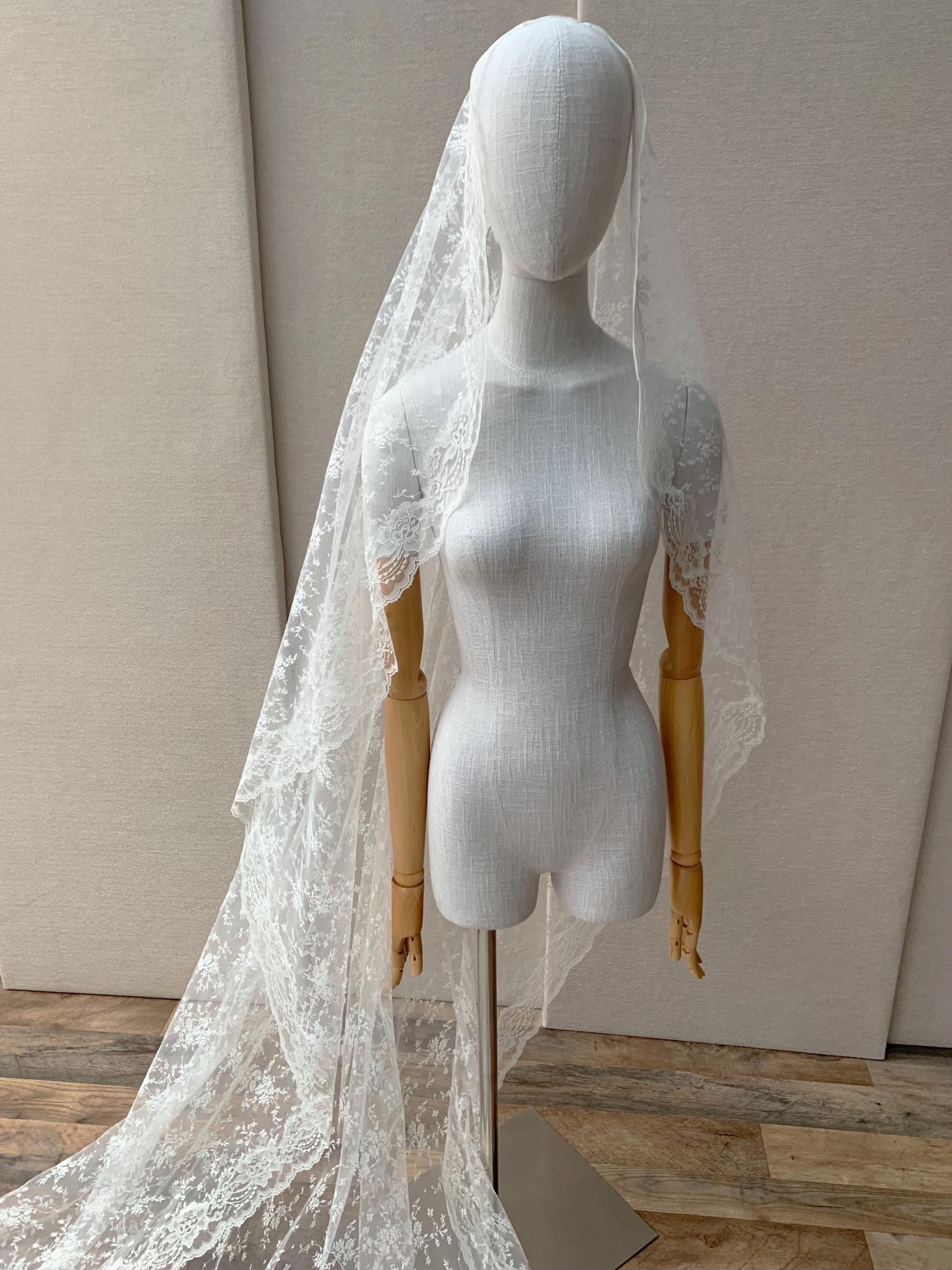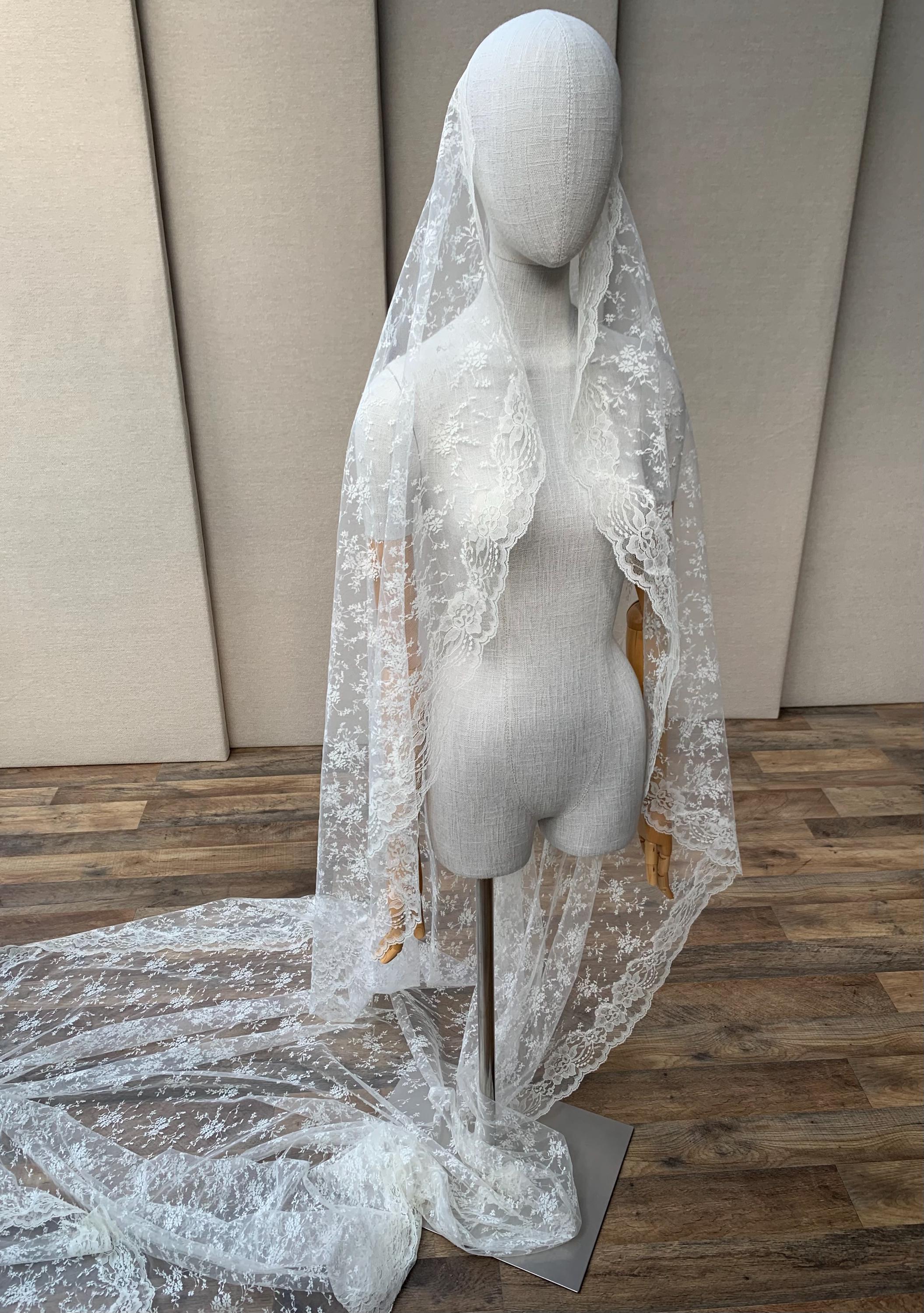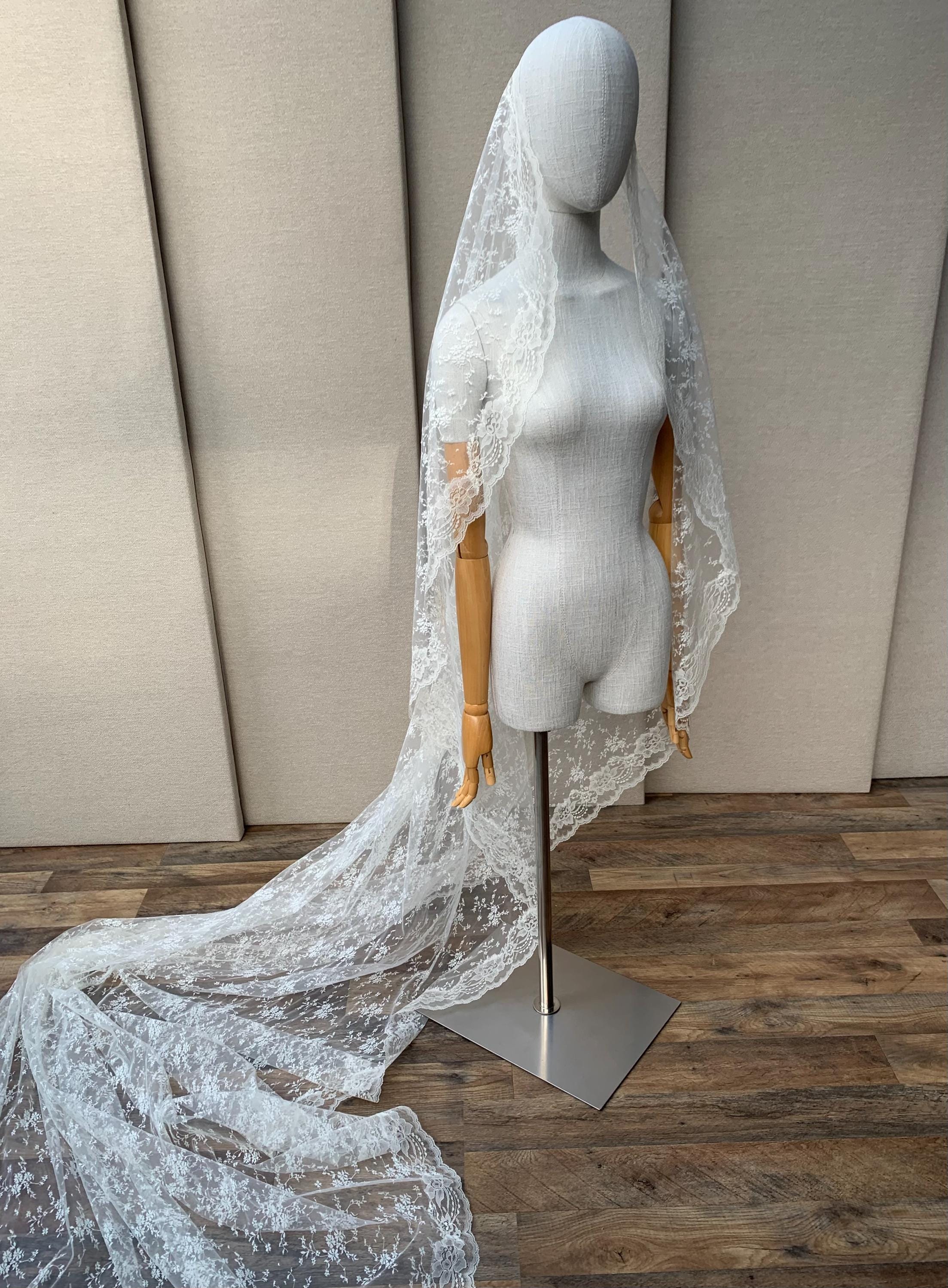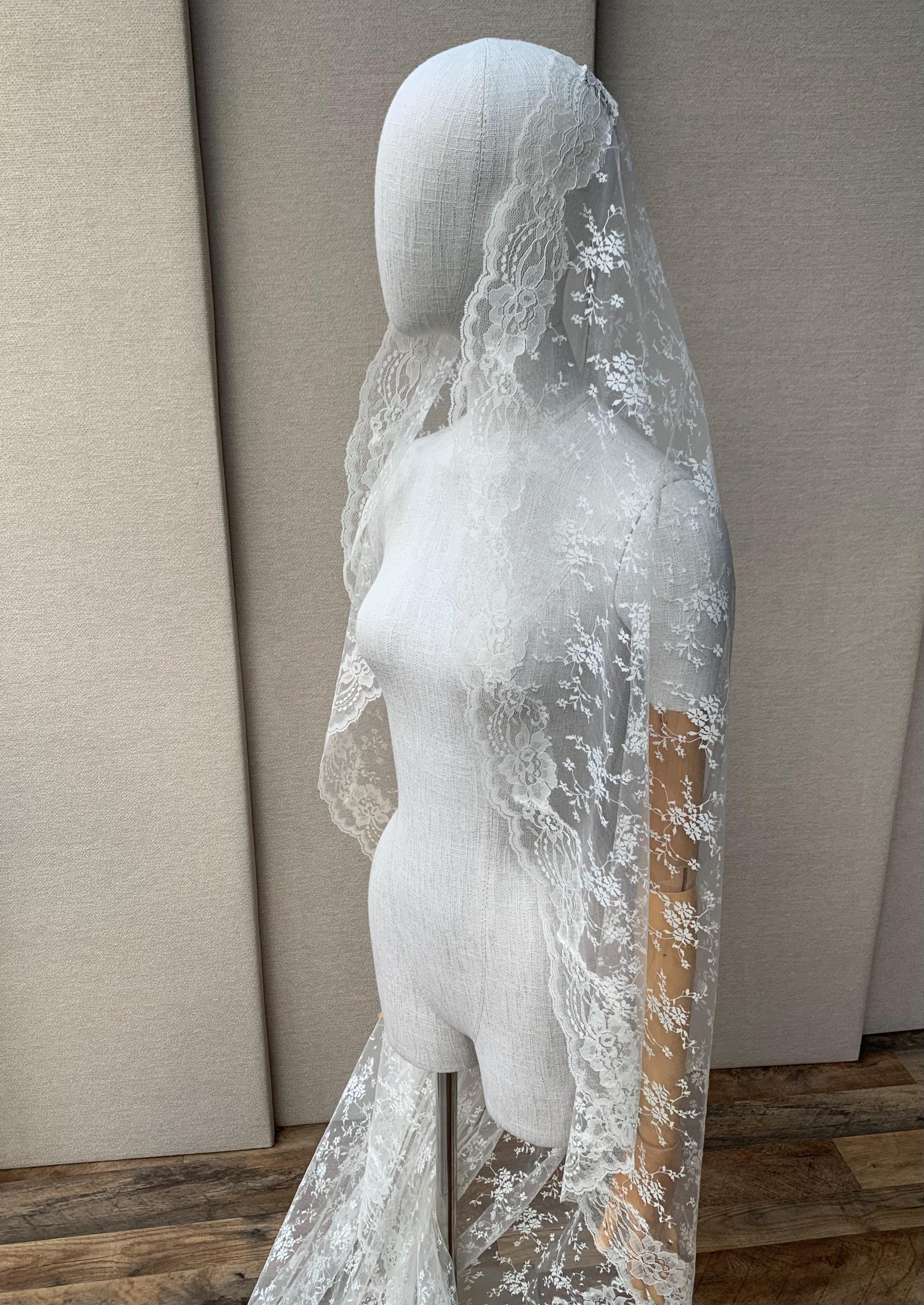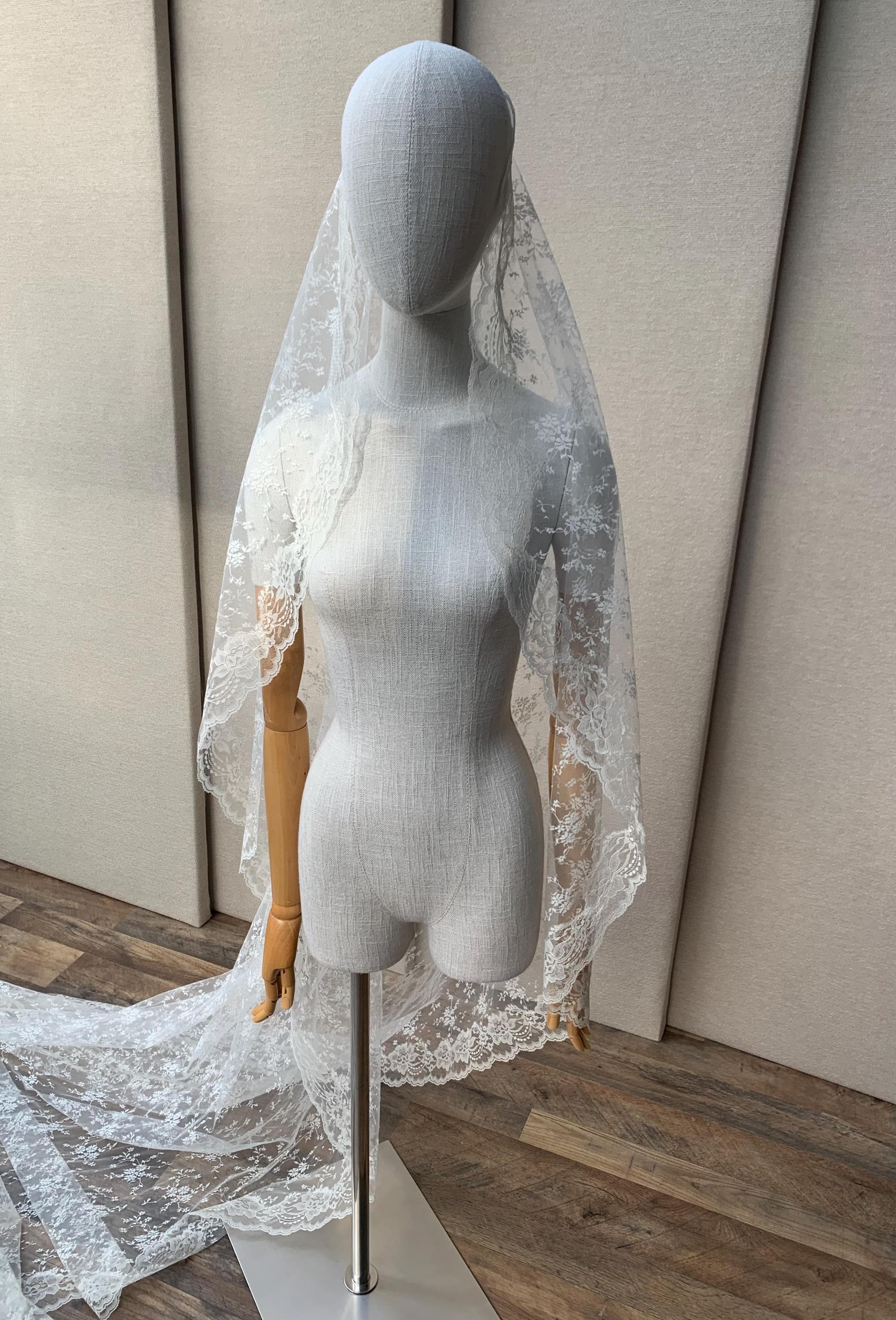 Romantic Chantilly lace mantilla style veil featured in a royal length. Beautiful floral pattern lace with the scalloped edge trim. The veil is secured in your hair with the comb on top of your head. The veil measures 132" long from the hair comb to the bottom of the veil. The lace is in a light ivory color. Also available in soft white or antique color.
