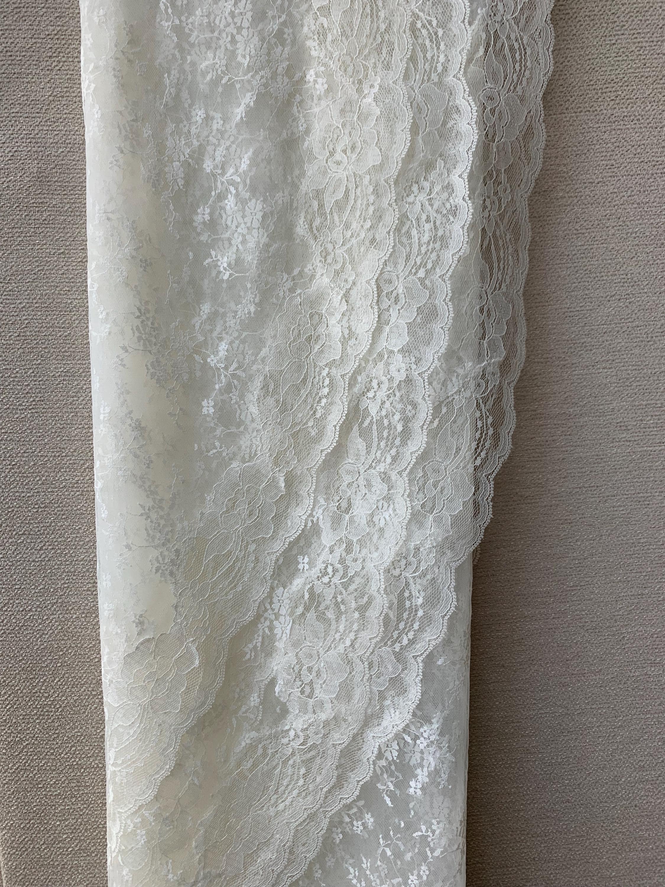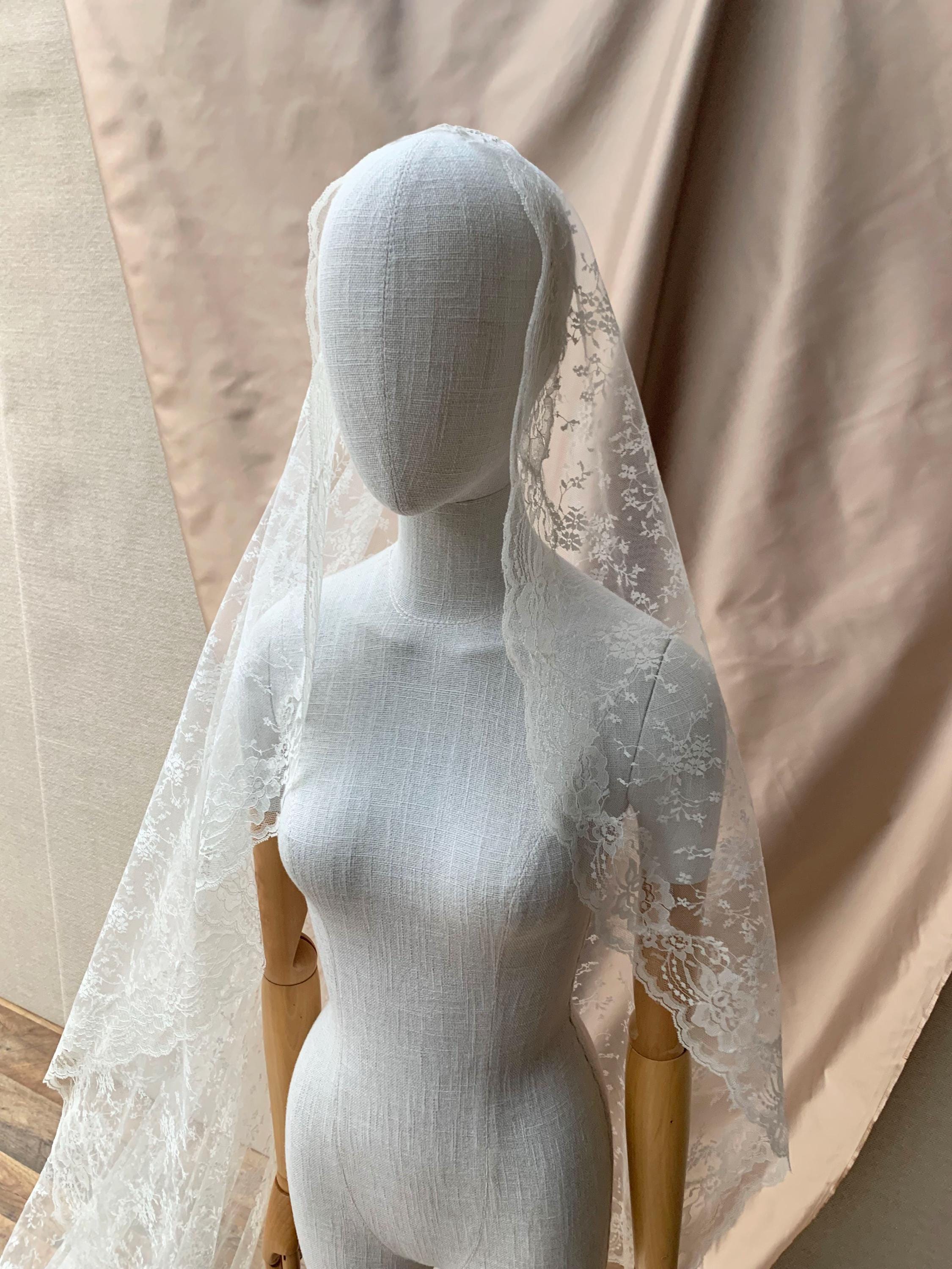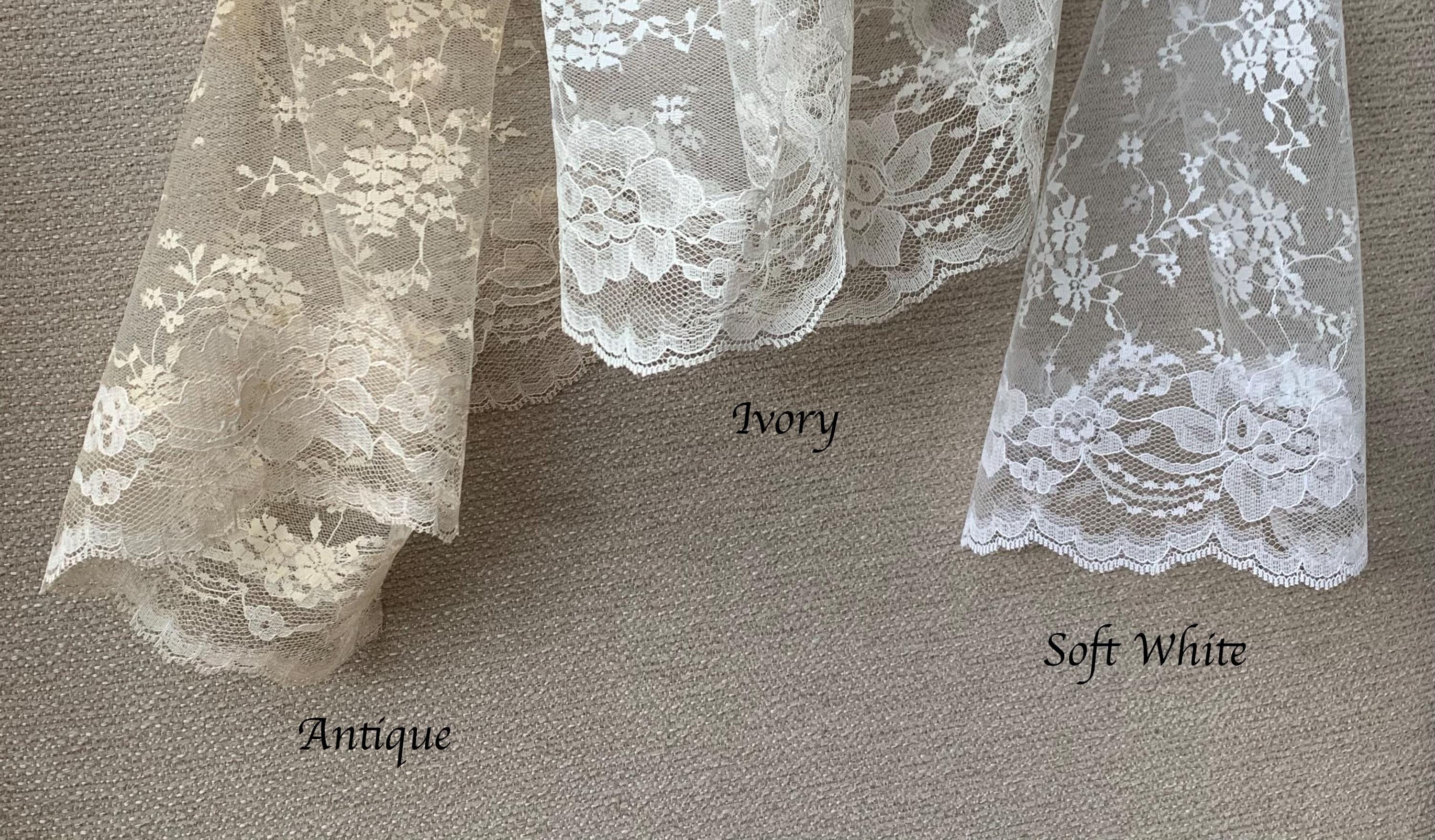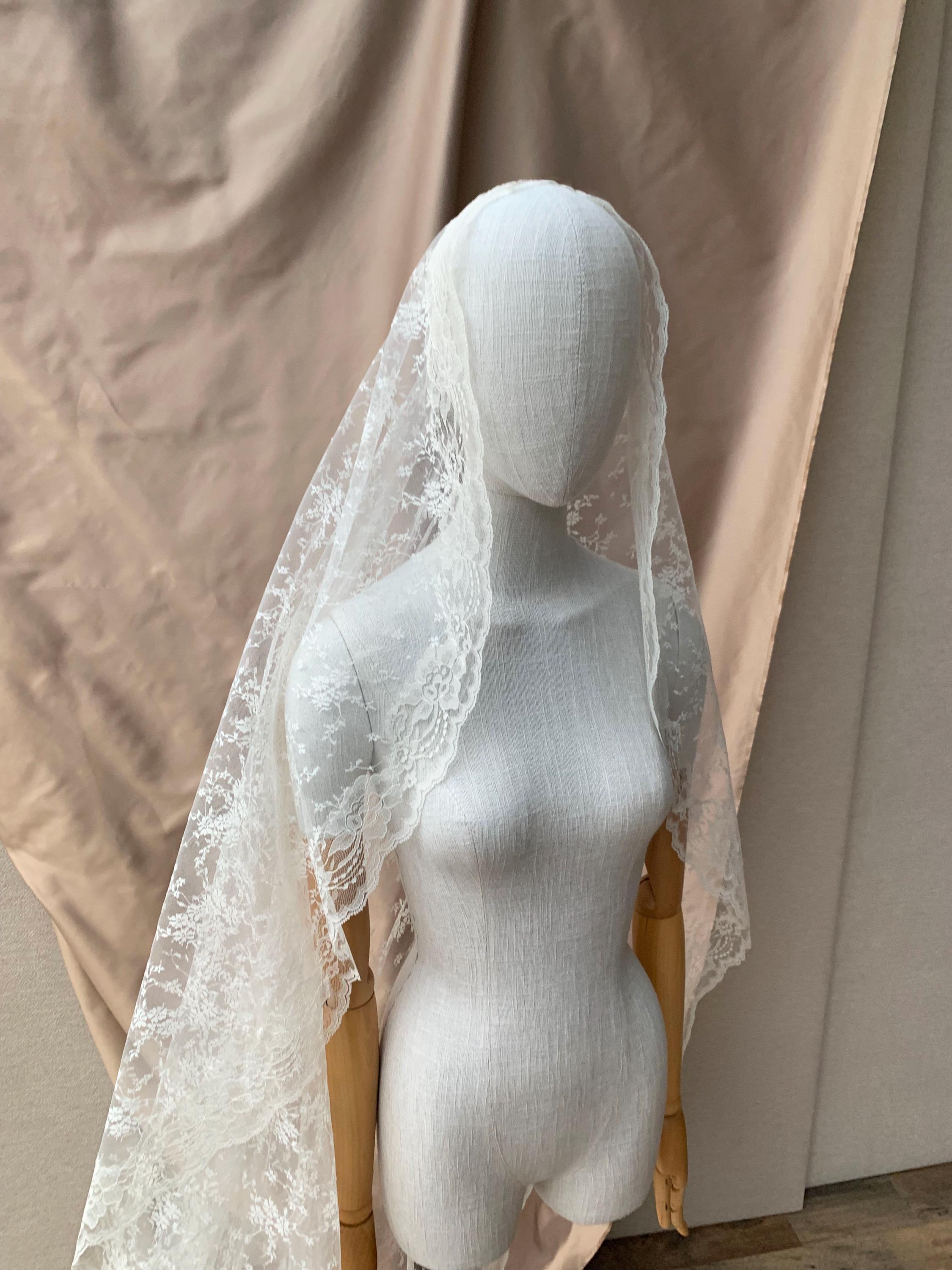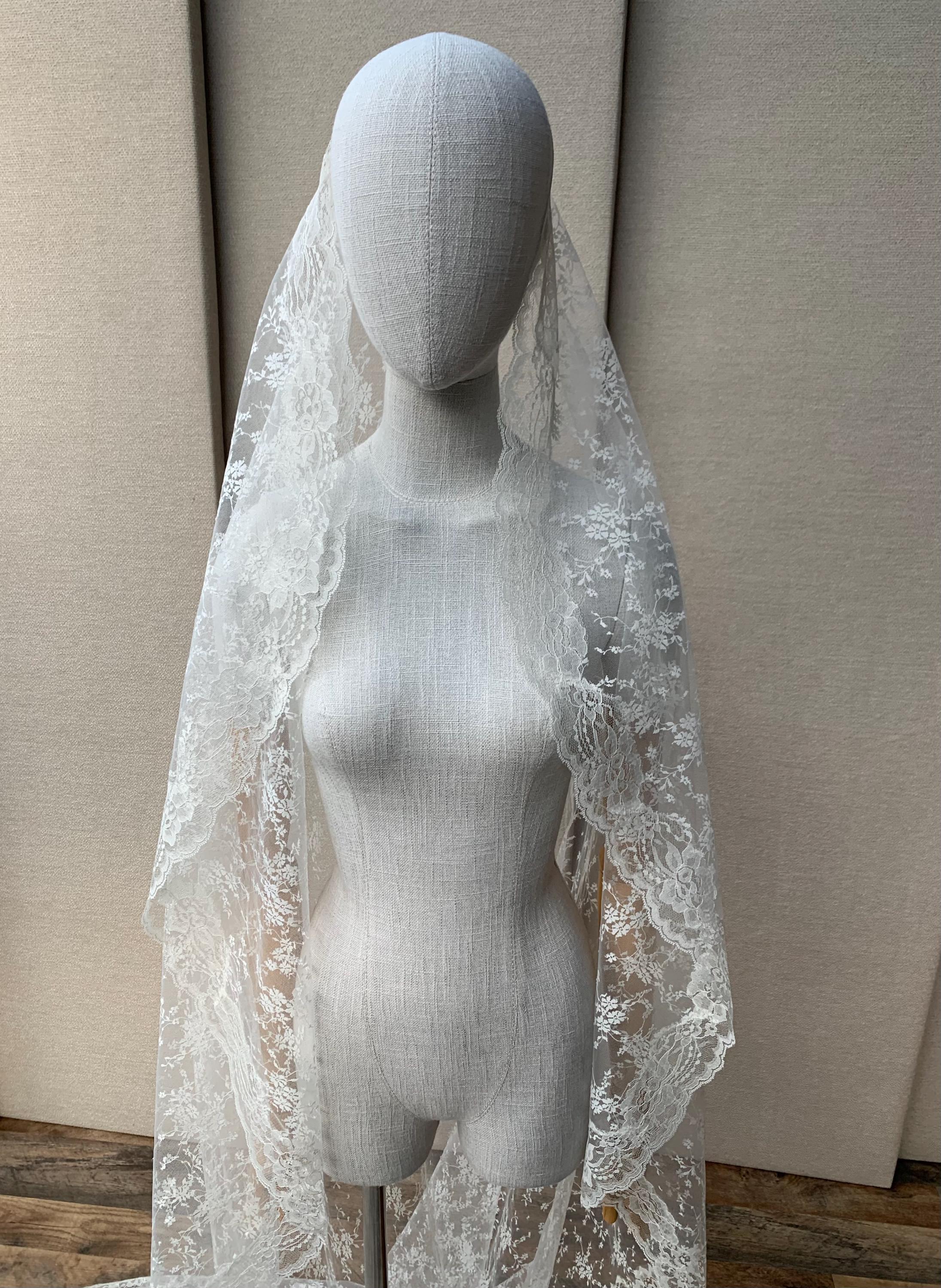 Romantic Chantilly lace mantilla style veil featured in a royal length. Beautiful floral pattern lace with the scalloped edge trim. The veil is secured in your hair with the comb on top of your head. The veil measures 132" long from the hair comb to the bottom of the veil. The lace is in a light ivory color. Also available in soft white or antique color.