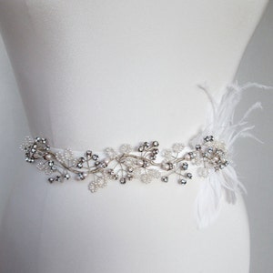 This fun and unique belt is made with gold chain and tiny cultured freshwater pearls and white jade beads. It ties in the back with four petite ribbons. This belt measures 20" long. The tiny pearl and jade clusters measure about 5/8" in diameter each. Available in silver finish as well. This belt can be made in any length, please inquire about the specific length.