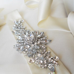 This design is entirely hand beaded with the finest semi precious stones to create this heirloom quality waist sash. The floral pattern is created with the faceted stones of moonstone, carved mother of pearl, jade and silver beads. The beaded part measures 7 1/4" long and 1 1/2" wide, while the entire sash measures 150" long. The grosgrain ribbon is in ivory color. Available in coral/turquoise option shown in the last two photos or the silver option shown in the first three photos.