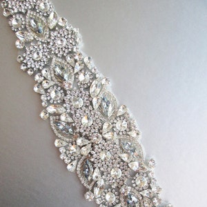 This belt is made with the Premium European Crystal and silver wire neatly twisted to form this unique floating effect crystal belt. The crystal design of the belt measures 7/8" wide and 13" long and is tied in the back with ribbons. The entire sash with the ribbons measures 150" long. Available in gold, rose gold or silver finish and variety of
