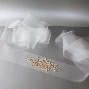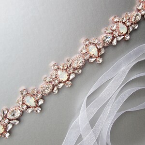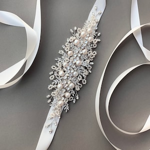 This belt is made with the Premium European Crystal and gold wire neatly twisted to form this unique floating effect crystal belt. The belt measures 1" wide and 13" long and is tied in the back with ribbons. The entire sash with the ribbons measures 150" long. Available in gold or silver finish and variety of ribbon options. This belt can be made in any length, please inquire about a specific length and pricing. Shown in the video in rose gold finish and with white satin ribbon.