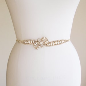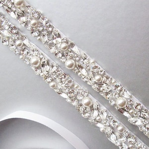 This delicate romantic belt is beautifully hand made with fancy Premium European Crystal twisted into this intricate design. The crystal design measures about 10" long and 3 1/2" wide. The design is attached to a 1 1/2" wide double face satin ribbon measuring 150" long. This belt comes in the silver finish as well.