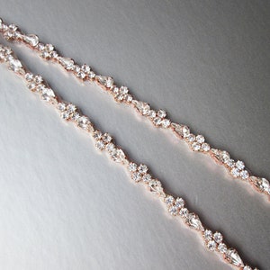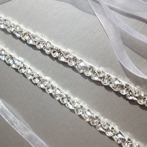 This sparkly skinny bridal belt is made with the Premium Quality European Crystal beaded on 3/8" wide satin ribbon. The crystal part of the belt measures 12 1/2" long and 1 1/8" wide in the center. The entire sash measures 150" long. Available in gold, silver or rose gold finish and with satin or grosgrain ribbon.