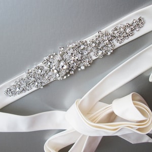 This fun belt is made with fine netting and the Premium European Crystal in rose gold and silver finish. The decorative part of the belt measures 21 1/2" long and 1 1/2" wide. The crystal arraignment is appliqued on a delicate 1 1/2" wide tissue like ivory ribbon measuring 150" long.