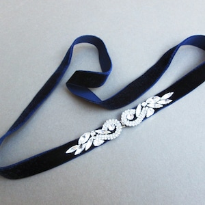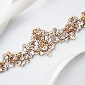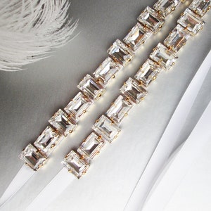 This sparkly skinny bridal belt is made with the Premium Quality European Crystal beaded on 3/8" wide organza ribbon. The crystal part of the belt measures 24" and 1 3/4" wide in the center. The entire sash measures 150" long. Available in gold or silver finish. It can be made with your choice of organza, satin or grosgrain ribbon.