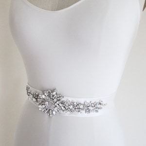This sparkly skinny bridal belt is made with the Premium Quality European Crystal beaded on 3/8" wide organza ribbon. The crystal part of the belt measures 24" and 1 3/4" wide in the center. The entire sash measures 150" long. Available in gold or silver finish. It can be made with your choice of organza, satin or grosgrain ribbon.
