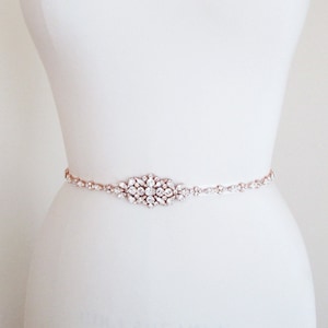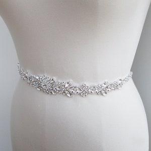 This delicate romantic belt is beautifully hand made with fancy Premium European Crystal twisted into this intricate design. This belt measures about 10" long and 3 1/2" wide at the wides point. It is attached to a 1" wide satin ribbon measuring 150" long. Available in gold, silver or rose gold finish and with satin or organza ribbon.