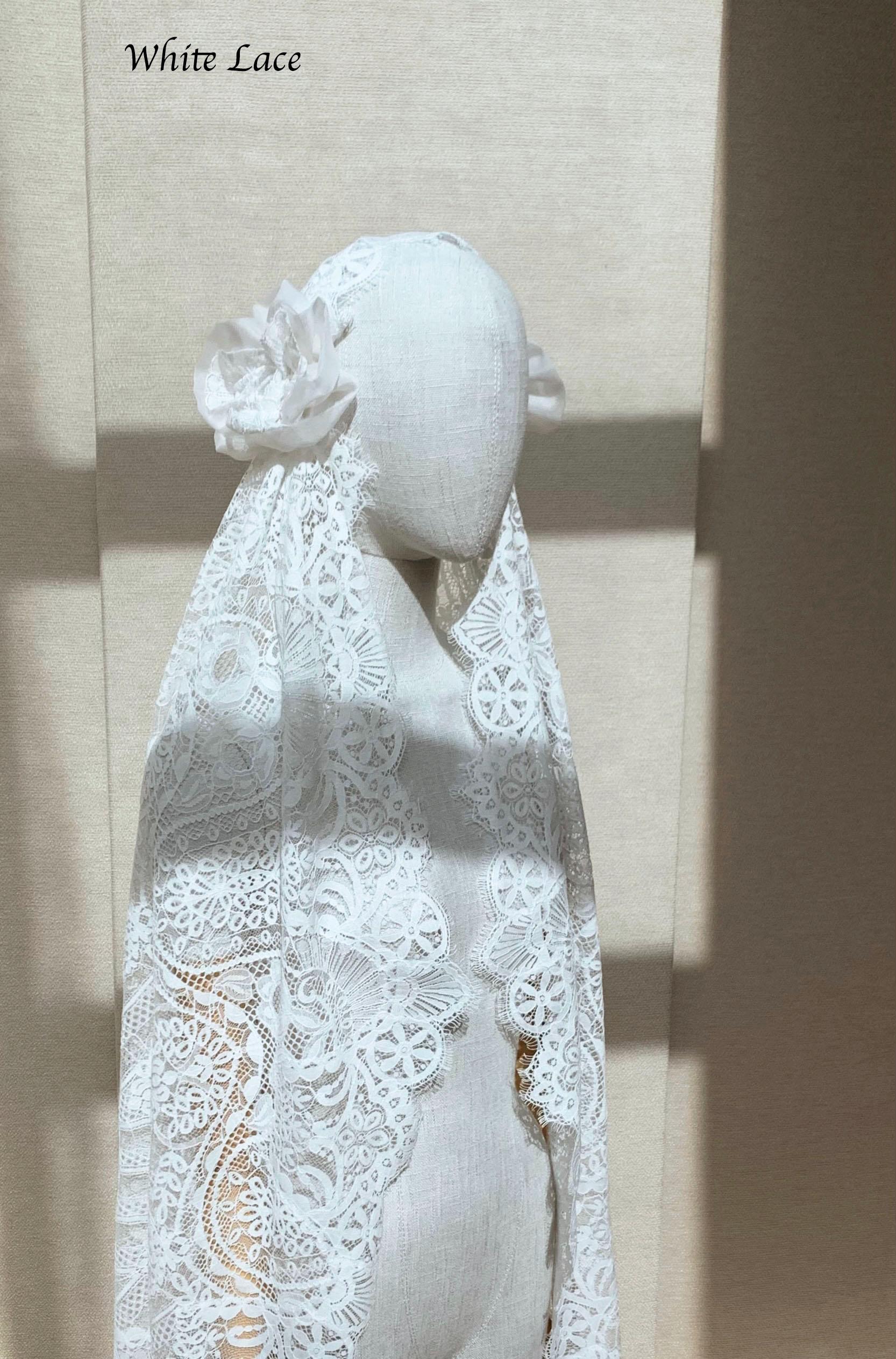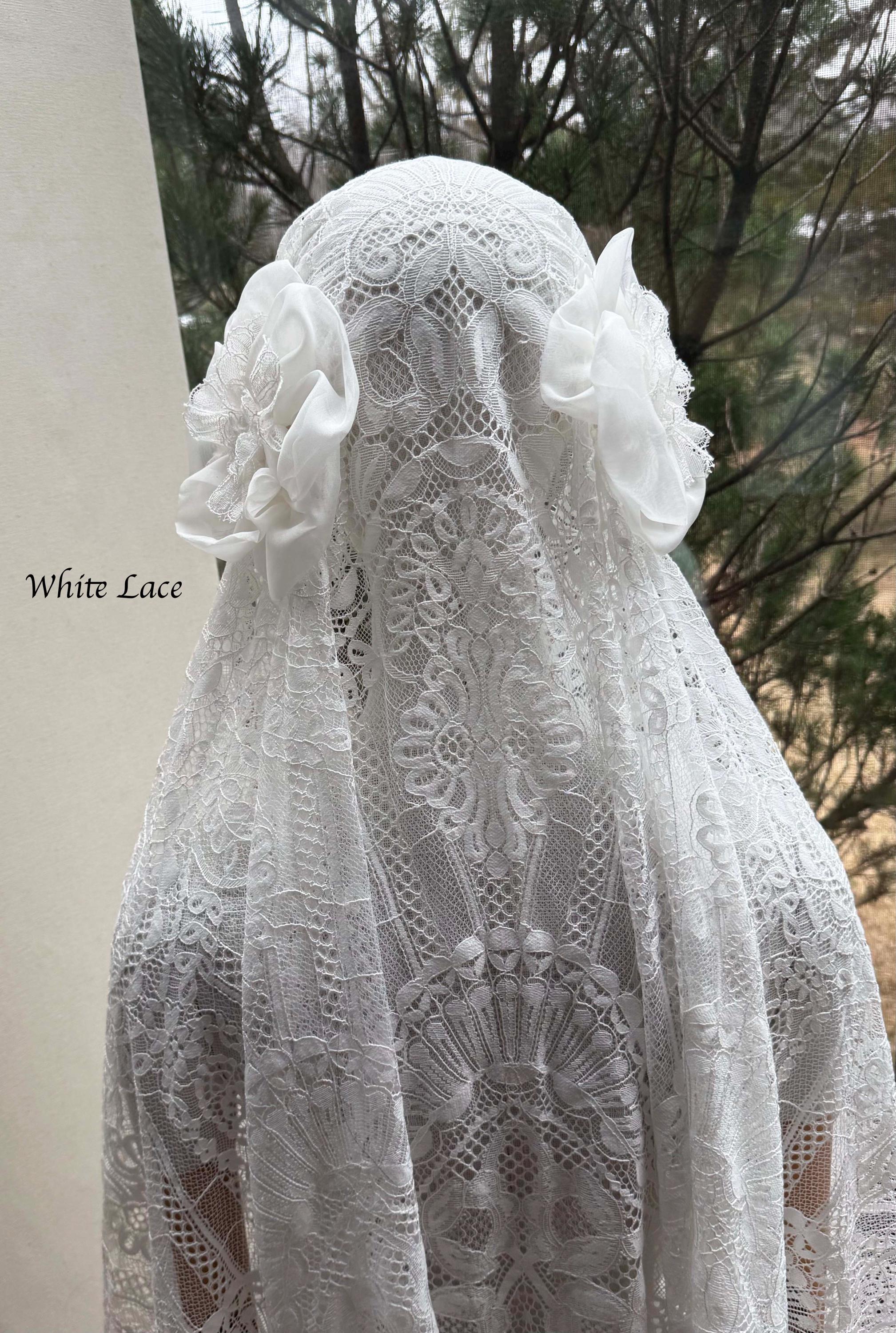 This exquisite vintage inspired Juliet Cap style veil will add a romantic bohemian touch to your wedding look. Hand made entirely with intricate high-quality cotton Chantilly lace adorned with silk organza flowers. The veil is secured in your hair with one comb on top of your head and two combs on the sides. This Ballet length veil measures 60" long from the hair comb to the bottom of the veil. The veil shown in the photos is in ivory color. Also available in soft white color.
