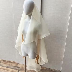 This luxurious bridal veil is so delicate and flowy. Beautifully hand-made with 100% silk sheer organza. The length of the veil in the photos measures 28". The veil is attached to a metal comb for easy positioning in your hair. Shown in the photos in white. If you would like to order the swatches of the silk organza colors please take a look at the listing below: