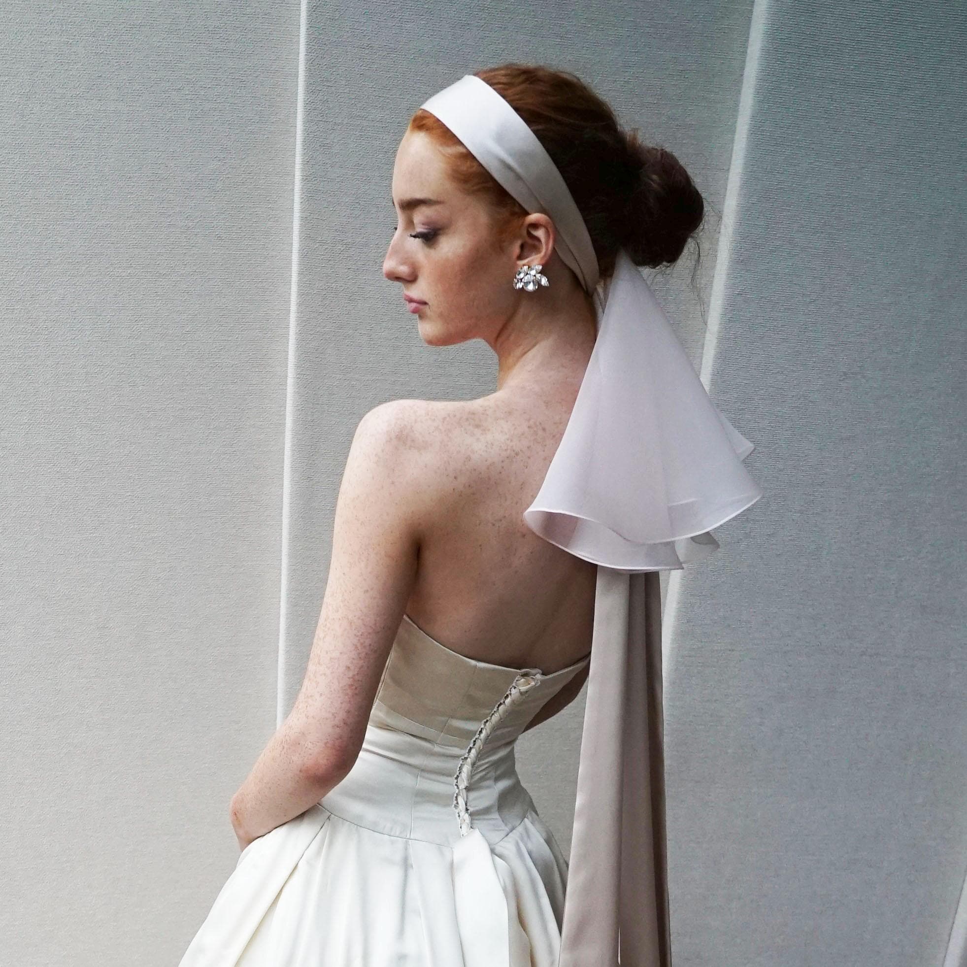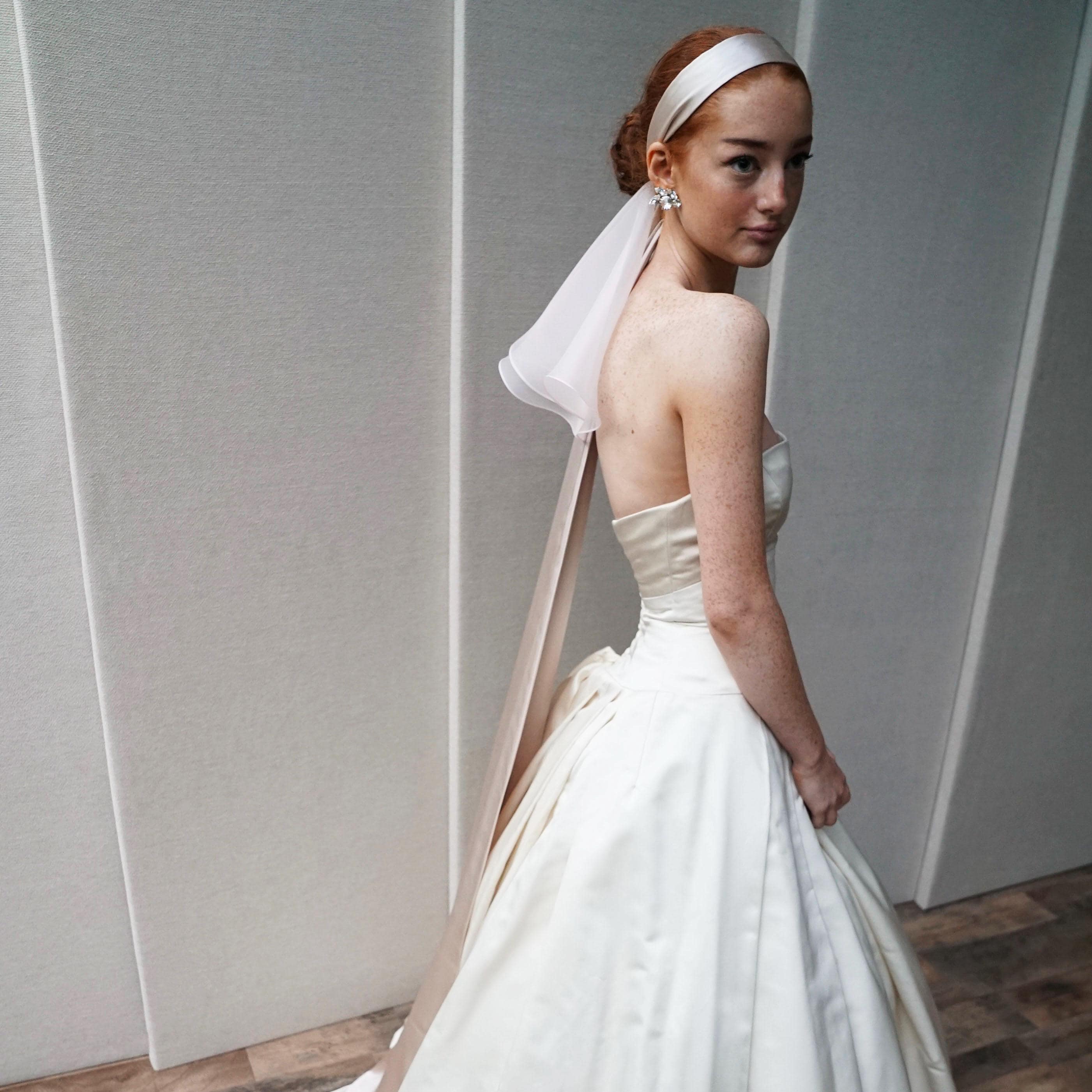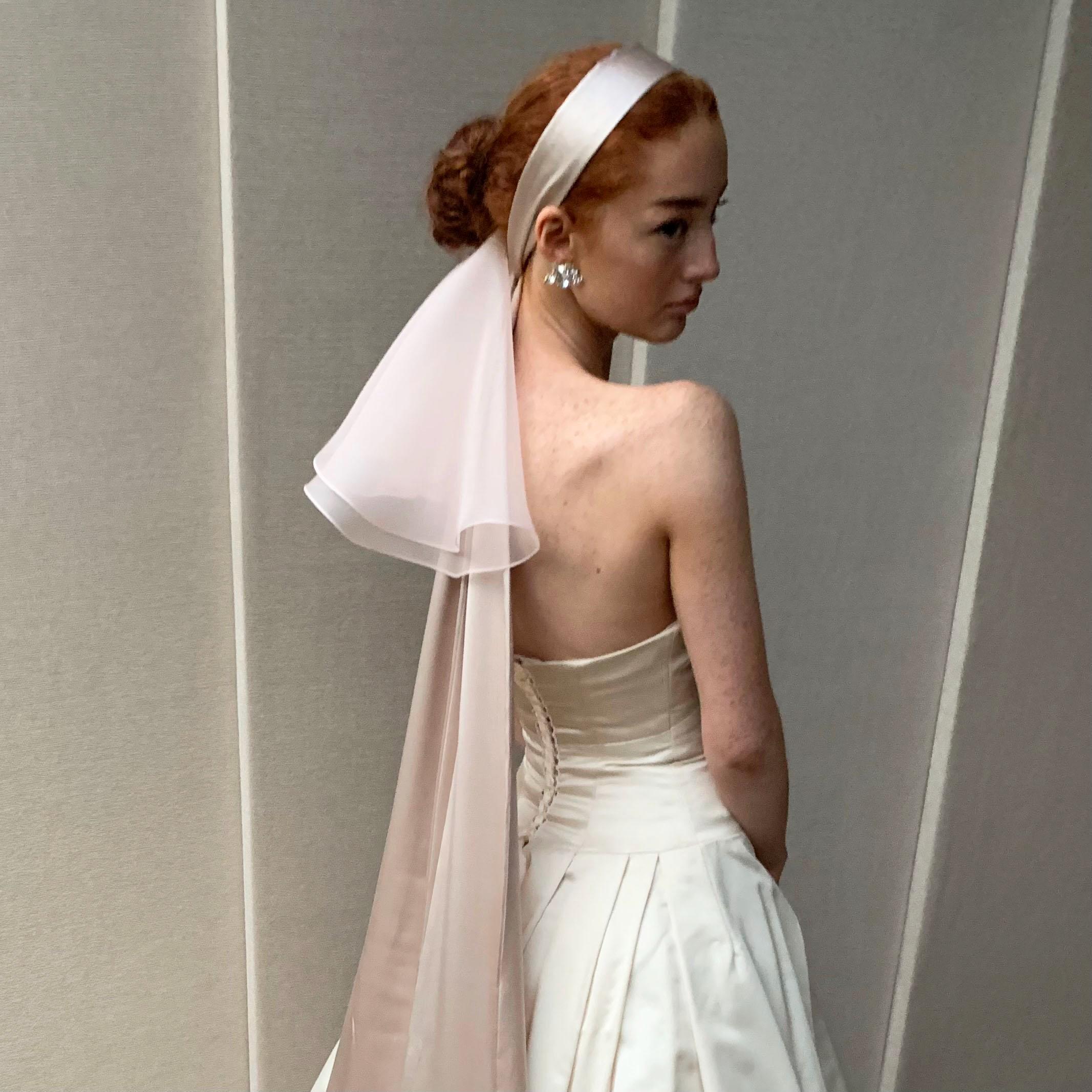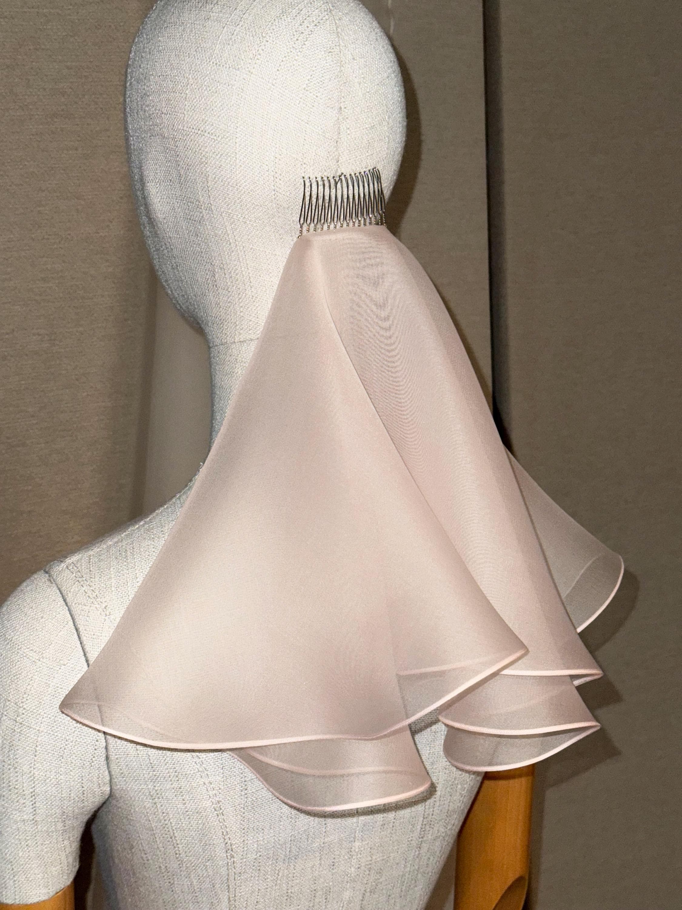Our "Under-The-Bun" veil got even shorter and sweeter. This fun goes-with-everything style looks so graceful and elegant. Beautifully hand-made with delicate 100% silk organza. The length of the veil measures 13" long. The veil is attached to a metal comb with the teeth pointing up for positioning the veil under the bun. If you would like to order the swatches of the silk organza colors please take a look at the listing below: