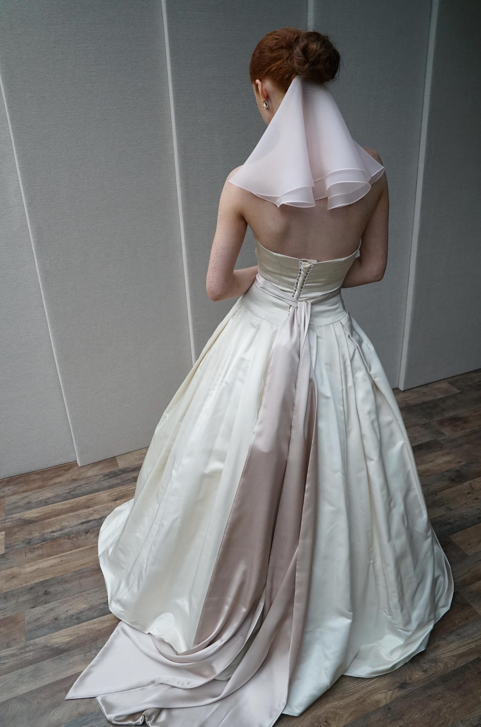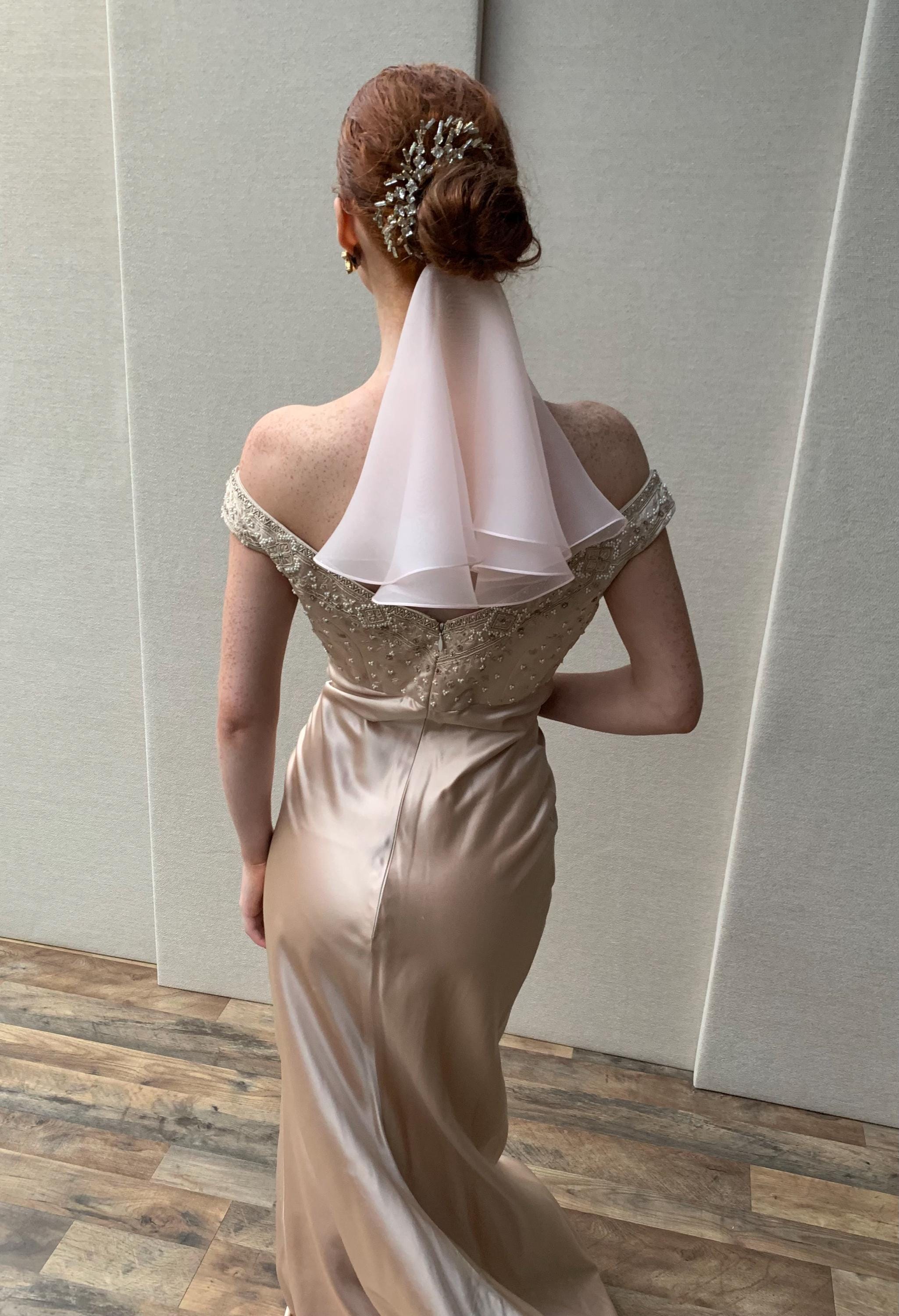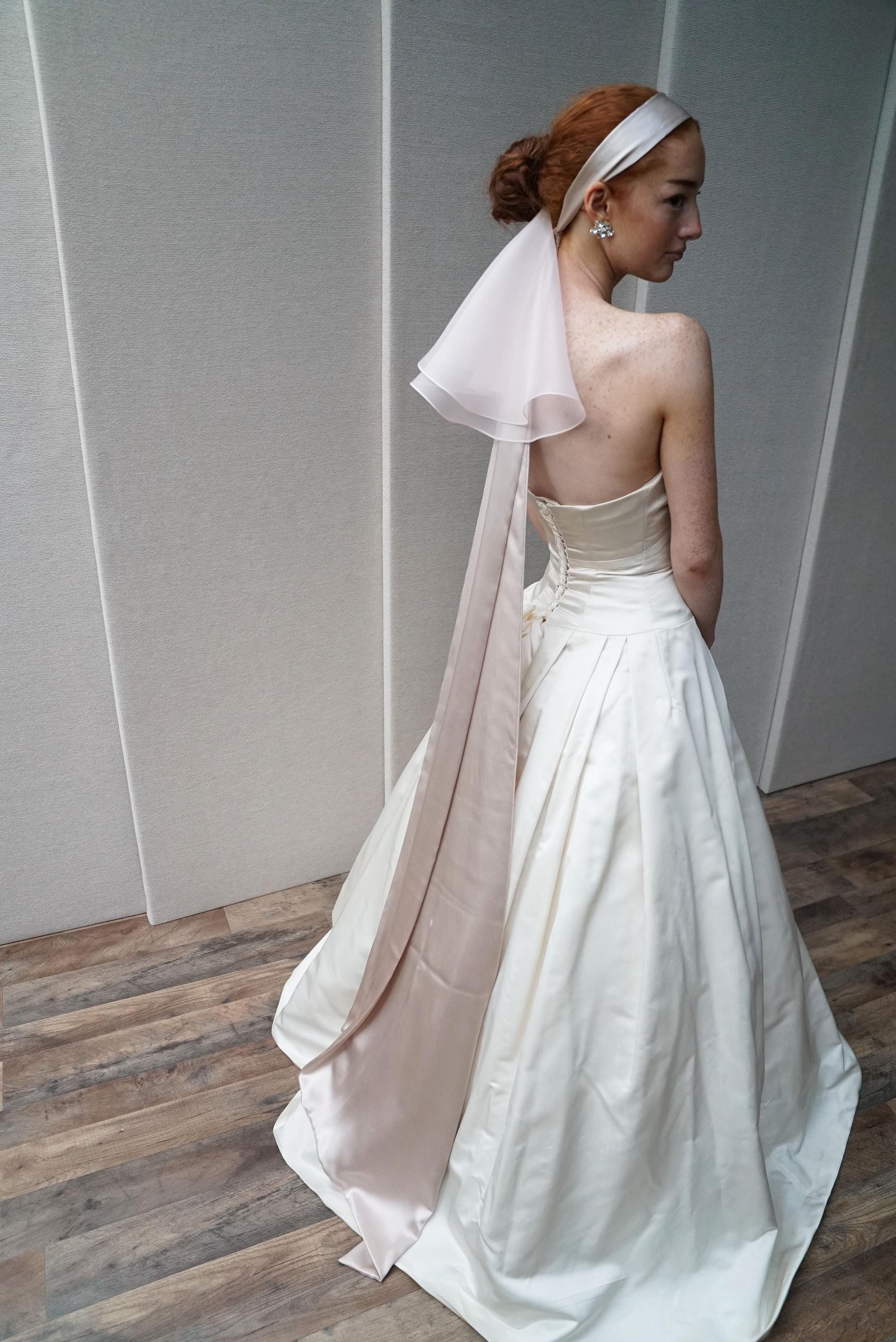 Our "Under-The-Bun" veil got even shorter and sweeter. This fun goes-with-everything style looks so graceful and elegant. Beautifully hand-made with delicate 100% silk organza. The length of the veil measures 13" long. The veil is attached to a metal comb with the teeth pointing up for positioning the veil under the bun. If you would like to order the swatches of the silk organza colors please take a look at the listing below: