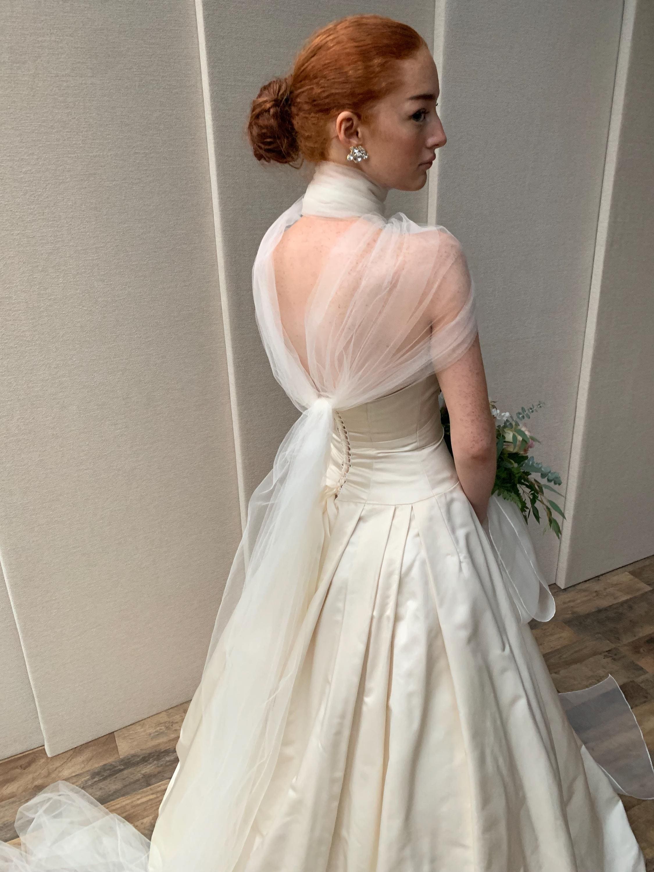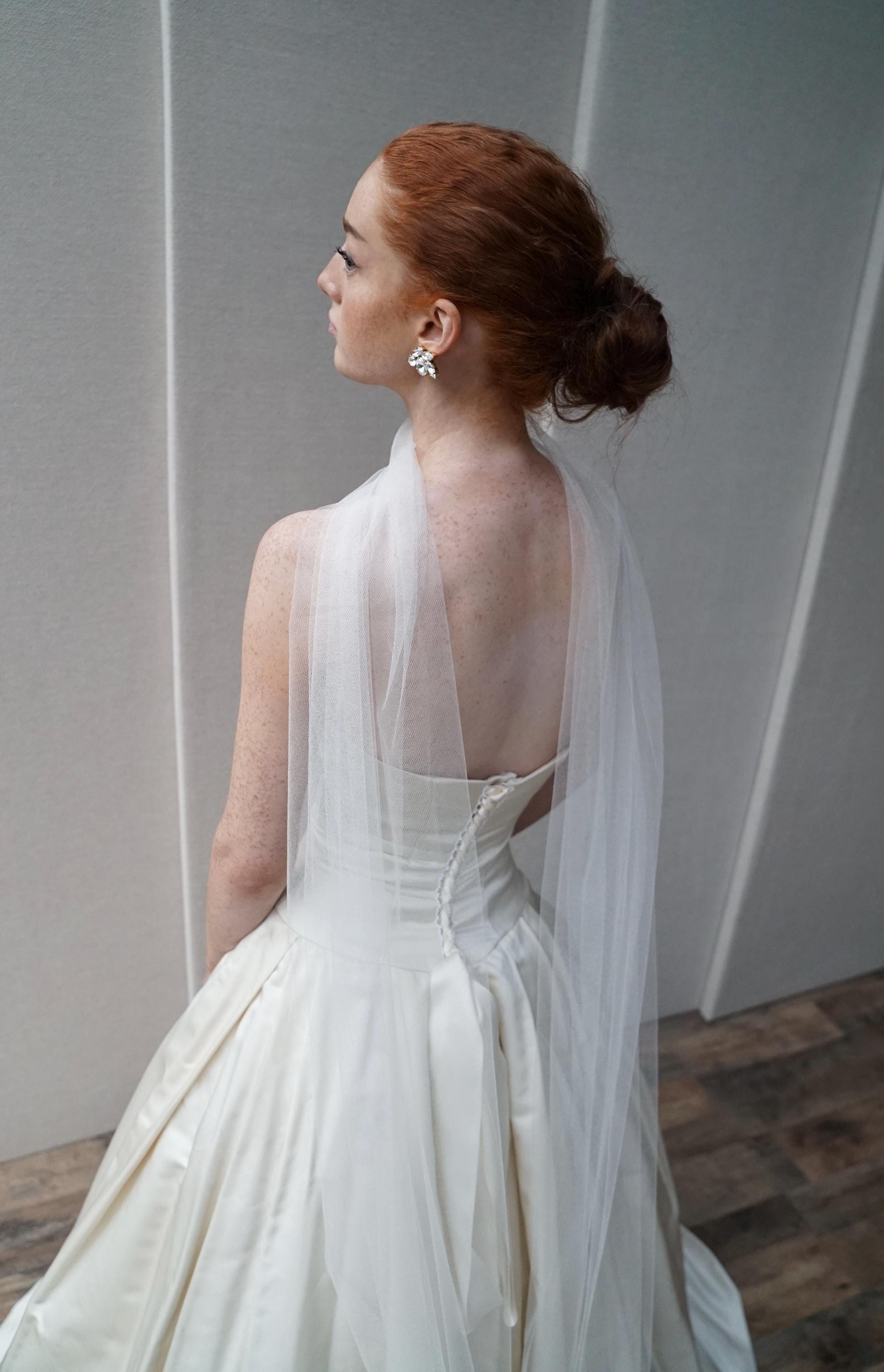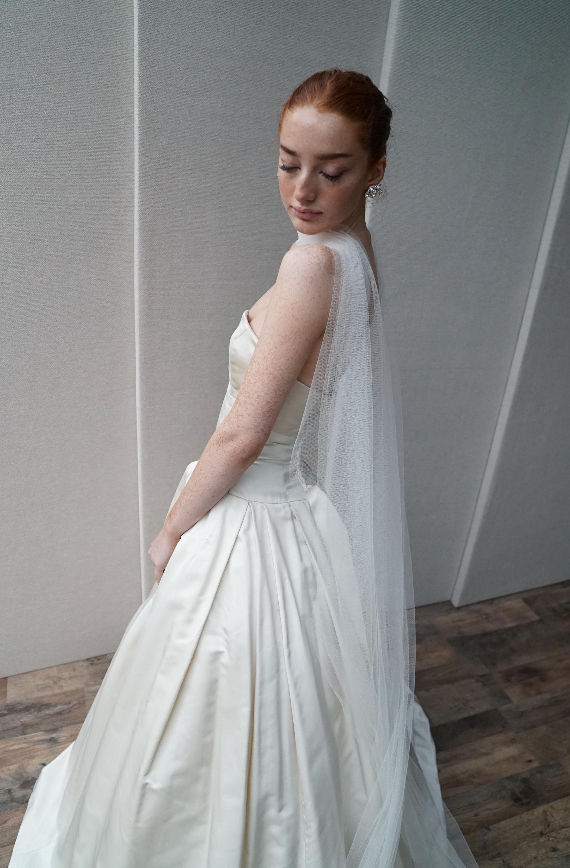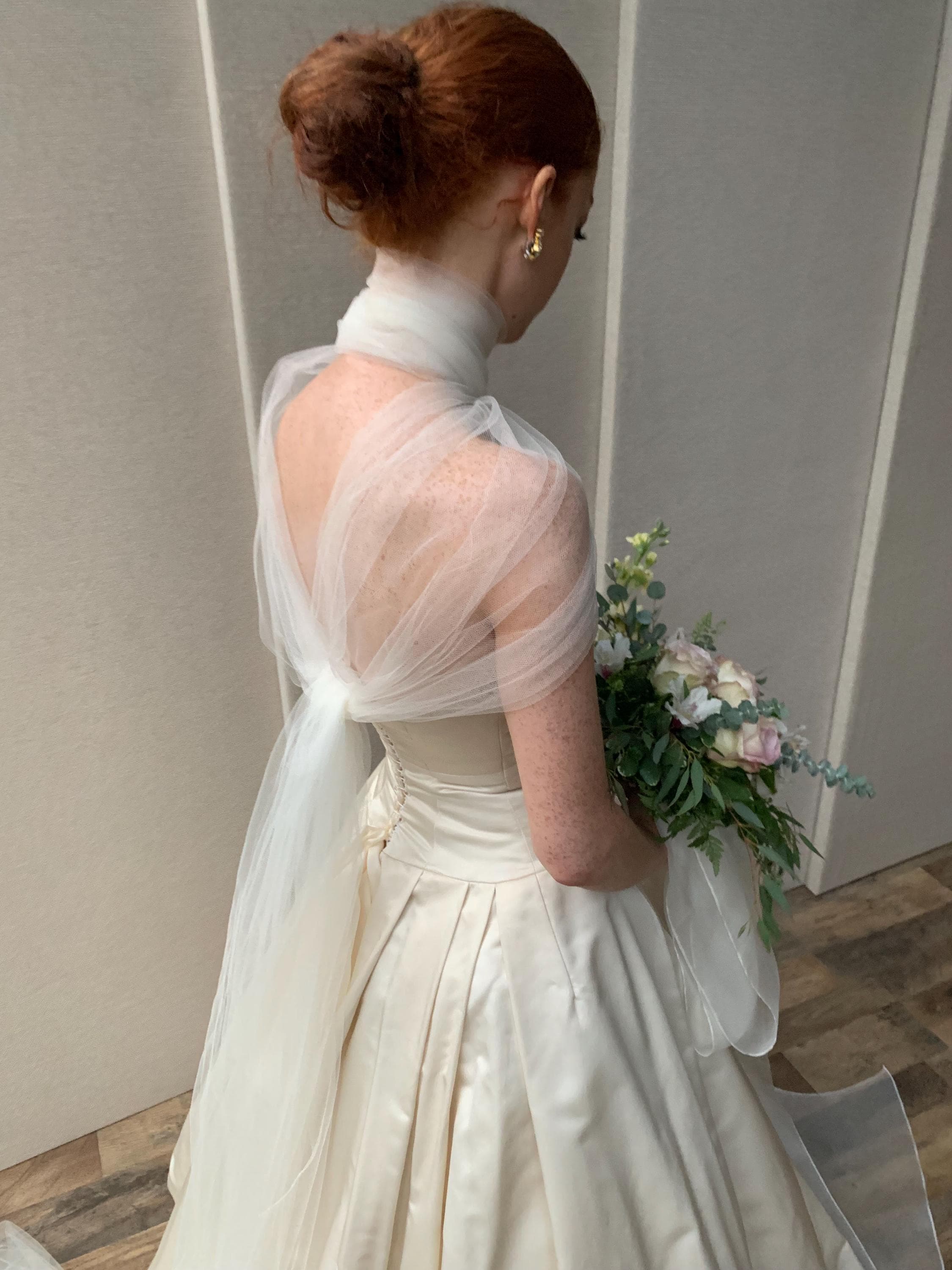 This exquisite stylish bridal shawl looks so fun and elegant. Beautifully hand-made with the finest 100% silk English tulle fabric that feels so airy, light and soft to the touch. You can wear this versatile scarf loosely draping down your back, wrap it around your shoulders and the neck or wear it as a bouncy hair bow on top of your head. You can even wear it as a sash tied around your waist. The length of the scarf in the photos measures 230" long. Shown in the photos in ivory color.