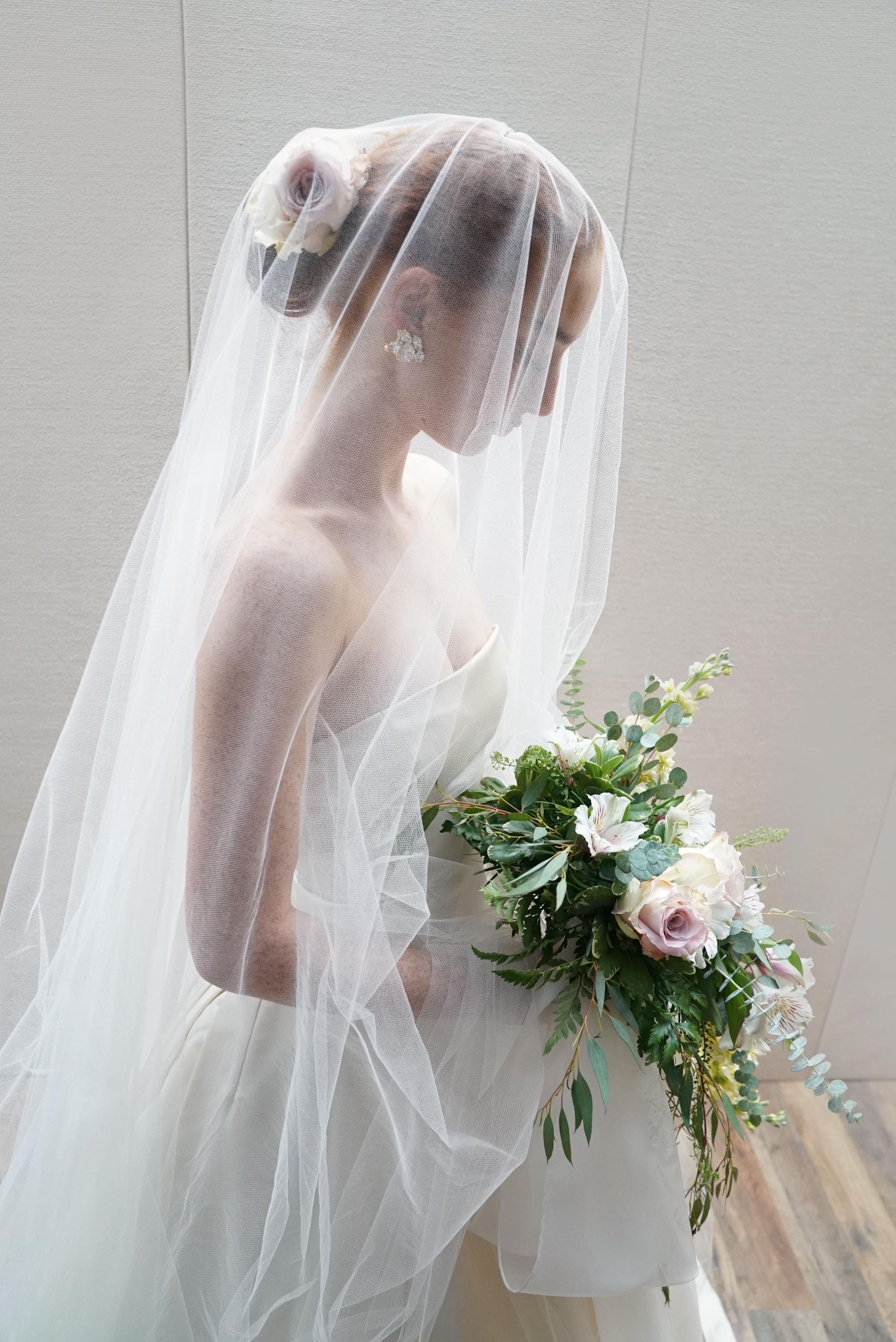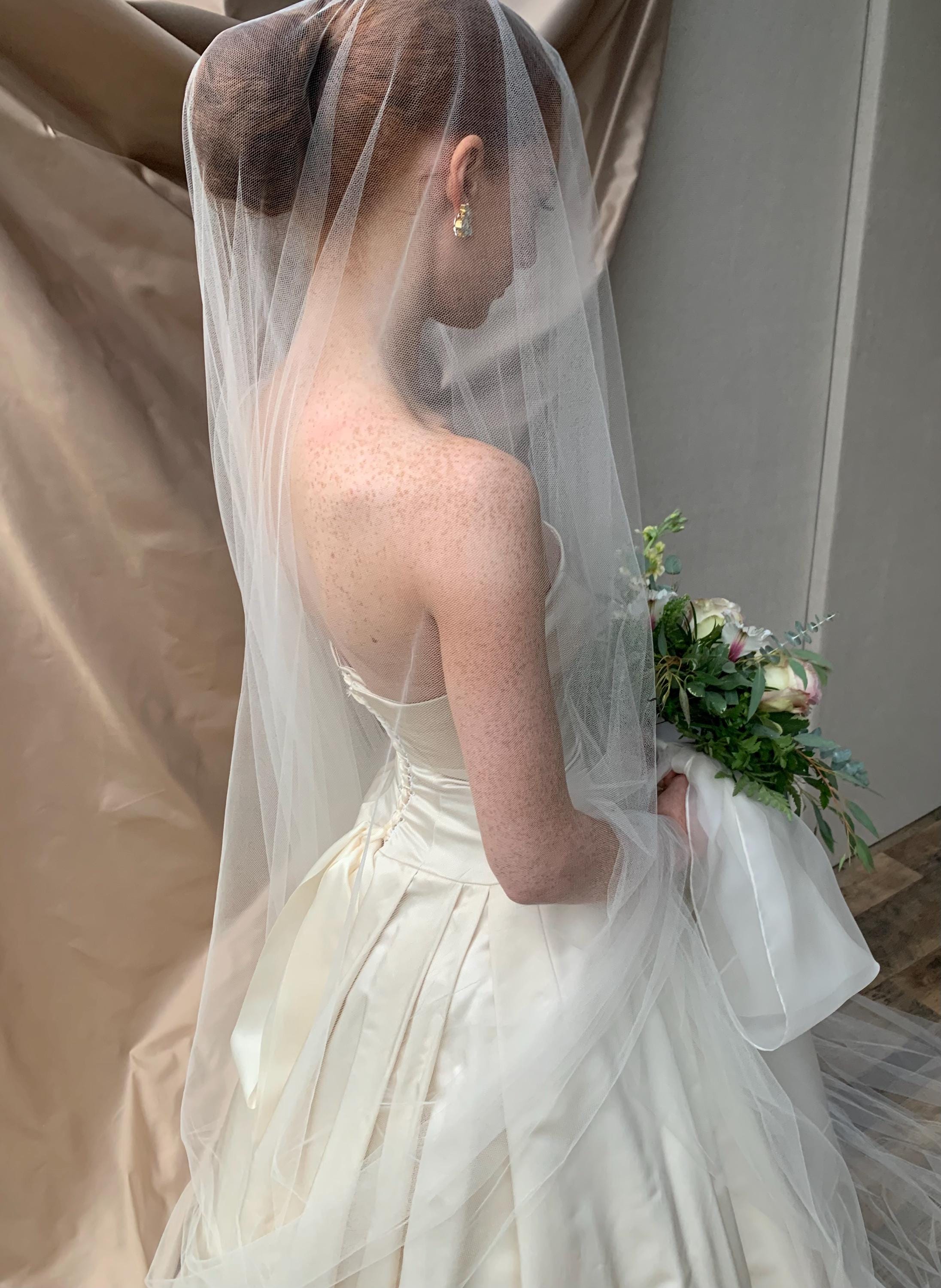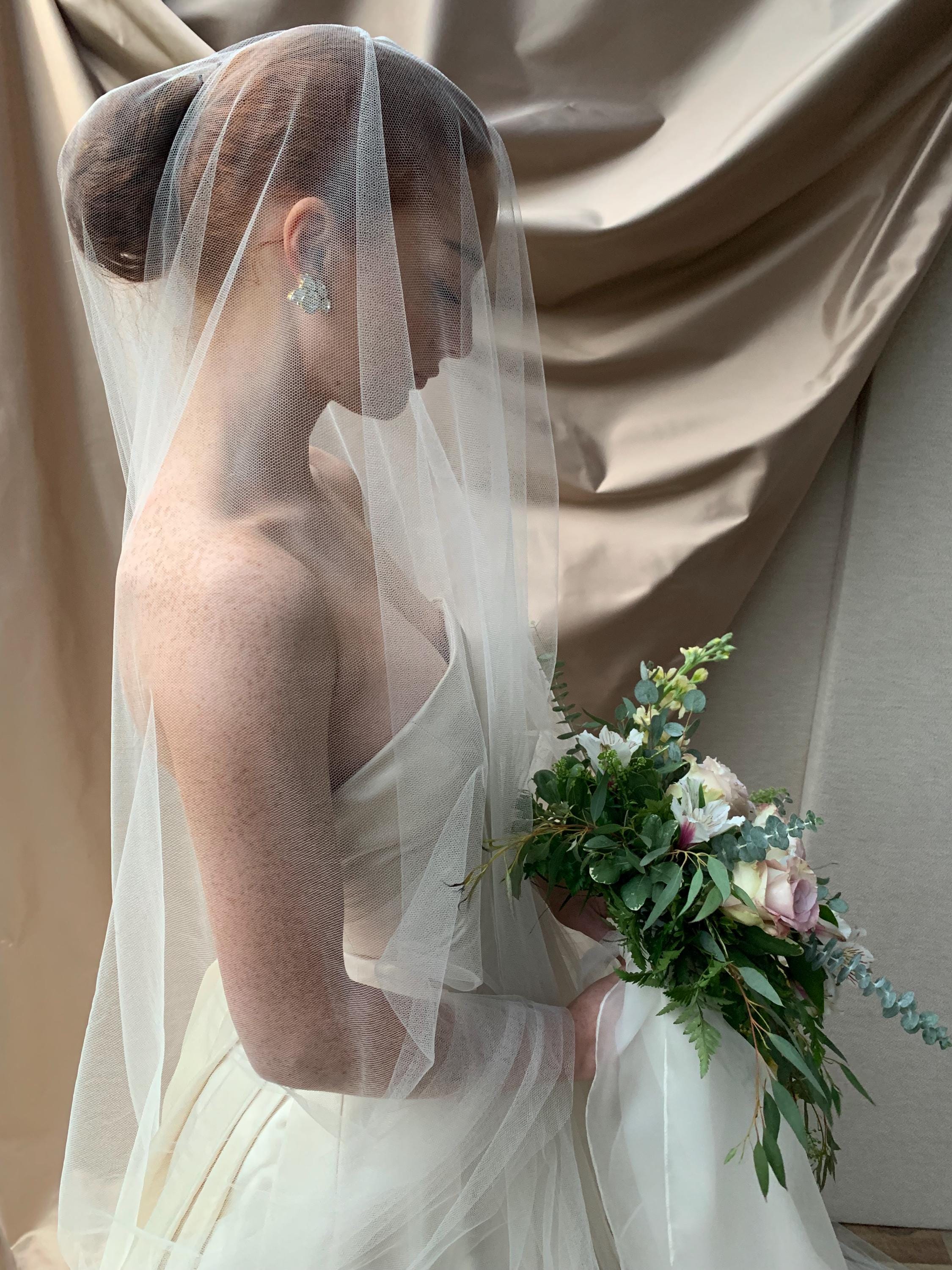 This luxurious bridal veil is beautifully delicate and soft. Carefully hand-made with the highest quality pure silk Bobbinet French Tulle. This stunning drop style veil features a floor length blusher and an impressive extra wide sweep measuring up to 146" in width. The veil is attached to a metal comb for easy positioning in your hair. We can also make the veil without the comb if you wish to simply drape the veil over your head. The color of the tulle is a warm ivory color. The veil in the photos is a Cathedral length veil measuring 110" long.