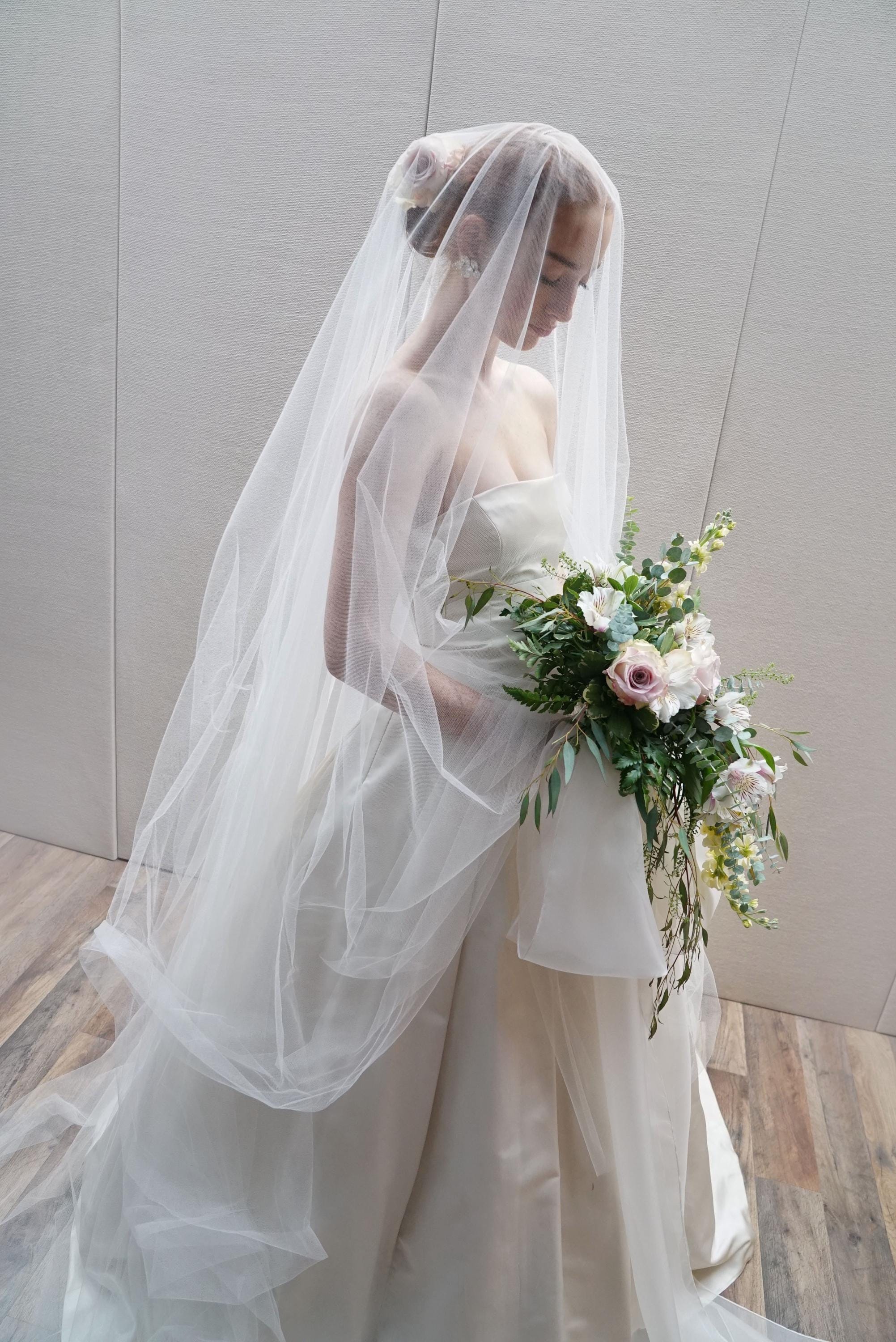 This luxurious bridal veil is beautifully delicate and soft. Carefully hand-made with the highest quality pure silk English tulle. This stunning drop style veil features a floor length blusher and an impressive extra wide sweep measuring up to 146" in width. The veil is attached to a metal comb for easy positioning in your hair. We can also make the veil without the comb if you wish to simply drape the veil over your head. The color of the tulle is a warm ivory color. The veil in the photos is a Cathedral length veil measuring 110" long.