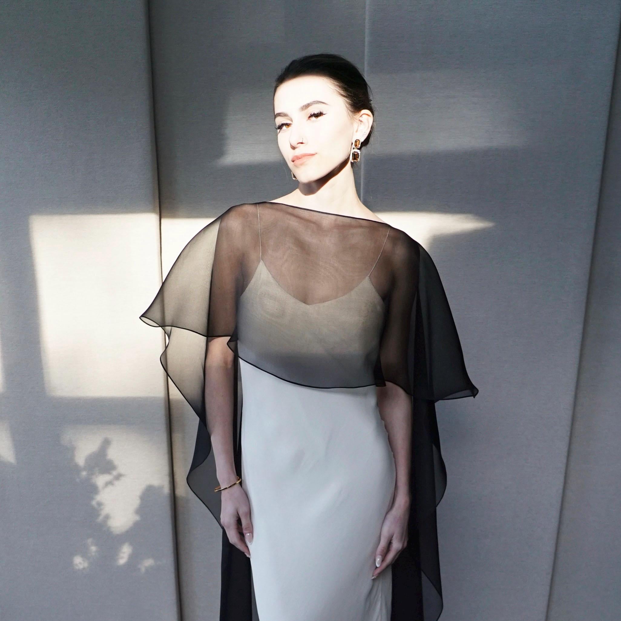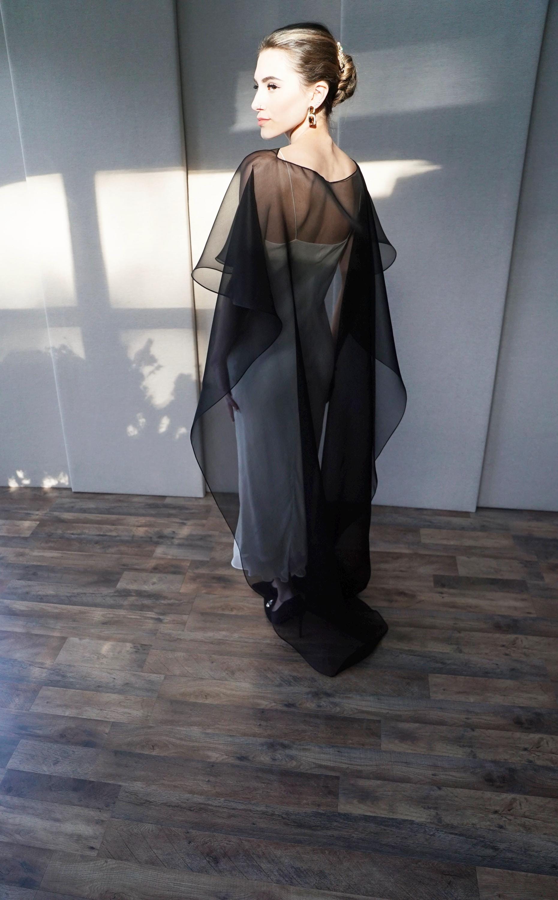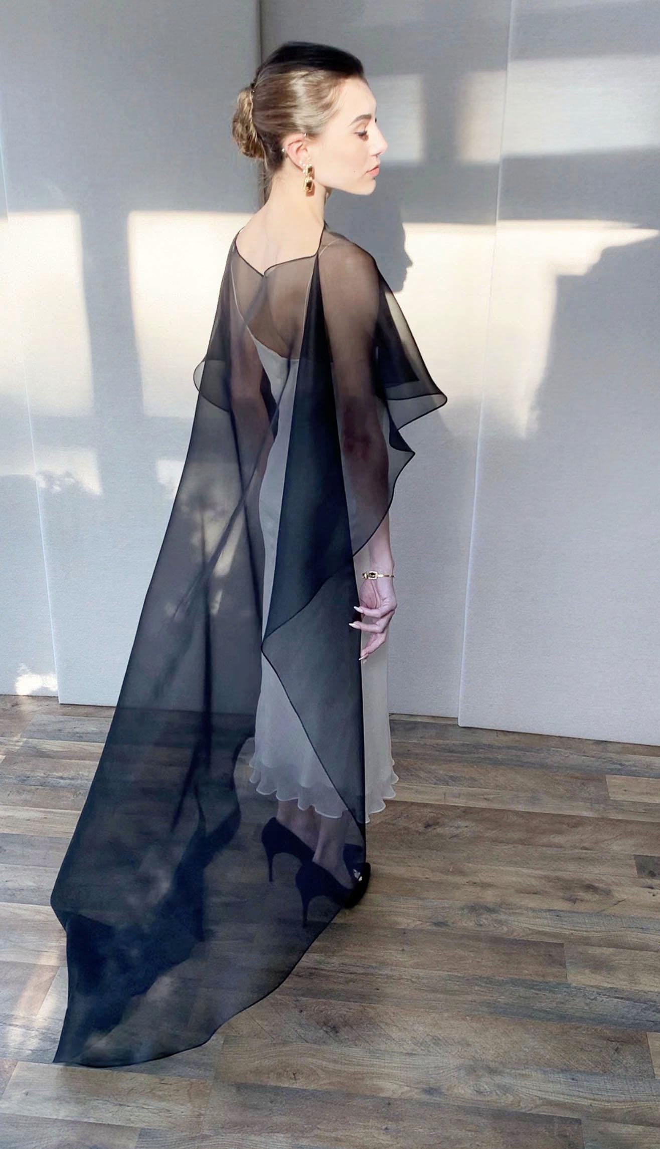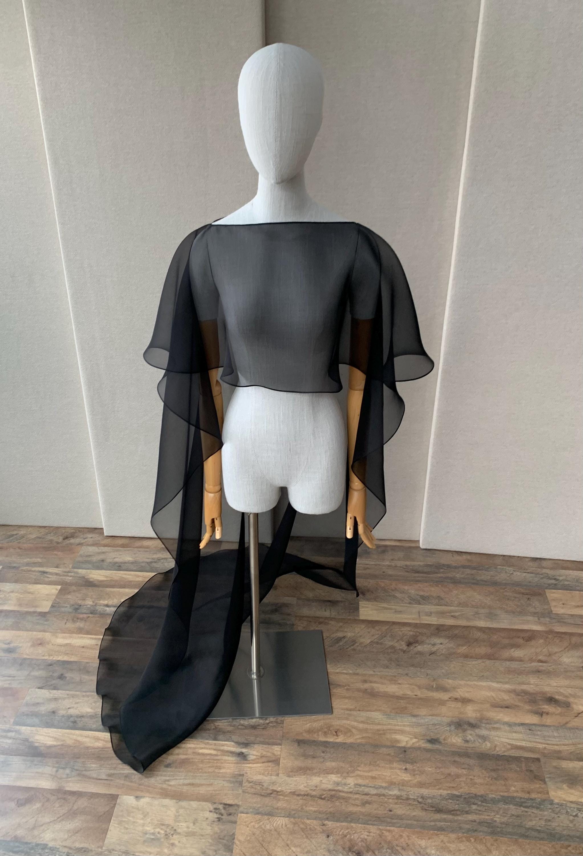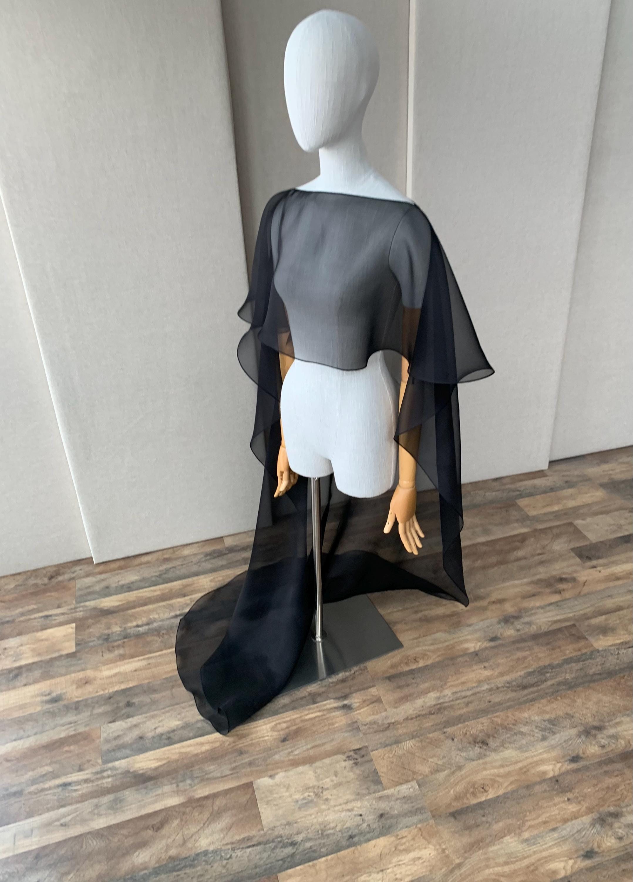 This elegant special occasion cape features flattering boat neck design, waist length front drop and a wispy train in the back. The cape is hand made out of sheer 100% silk organza trimmed with delicate rolled edge stitch. The front of the cape measures 13" from the neck and the the back measures 64" long from the neck. Shown in black organza in the photos. Different colors and lengths available. Custom colors available as well, please inquire.