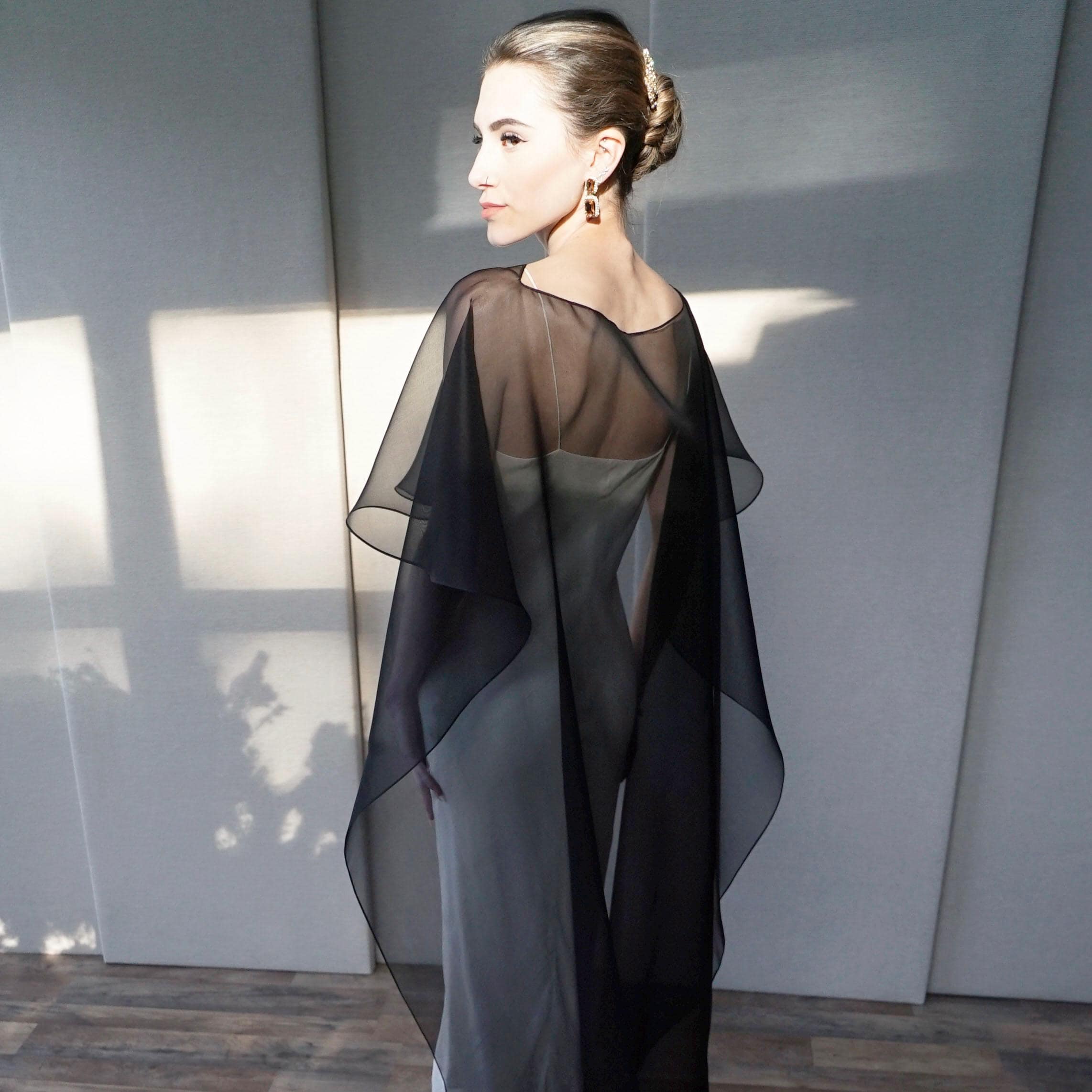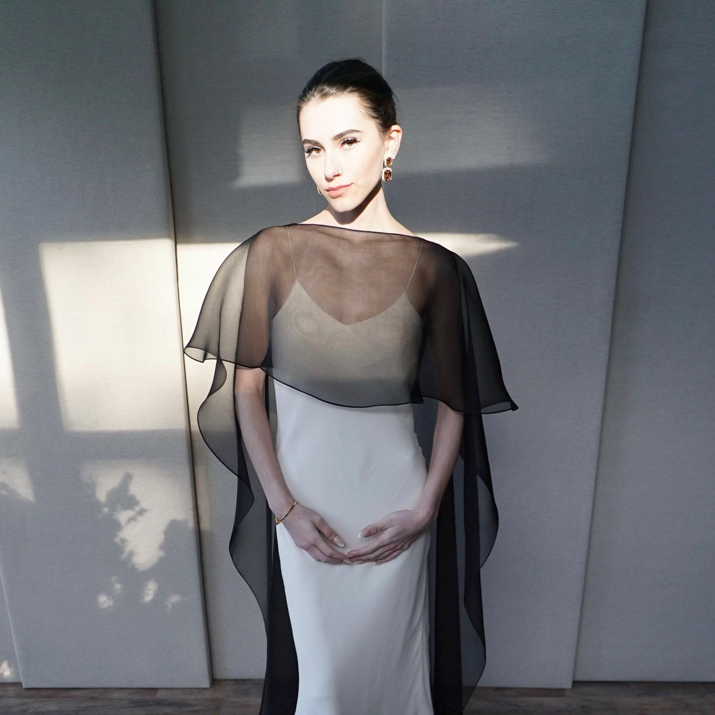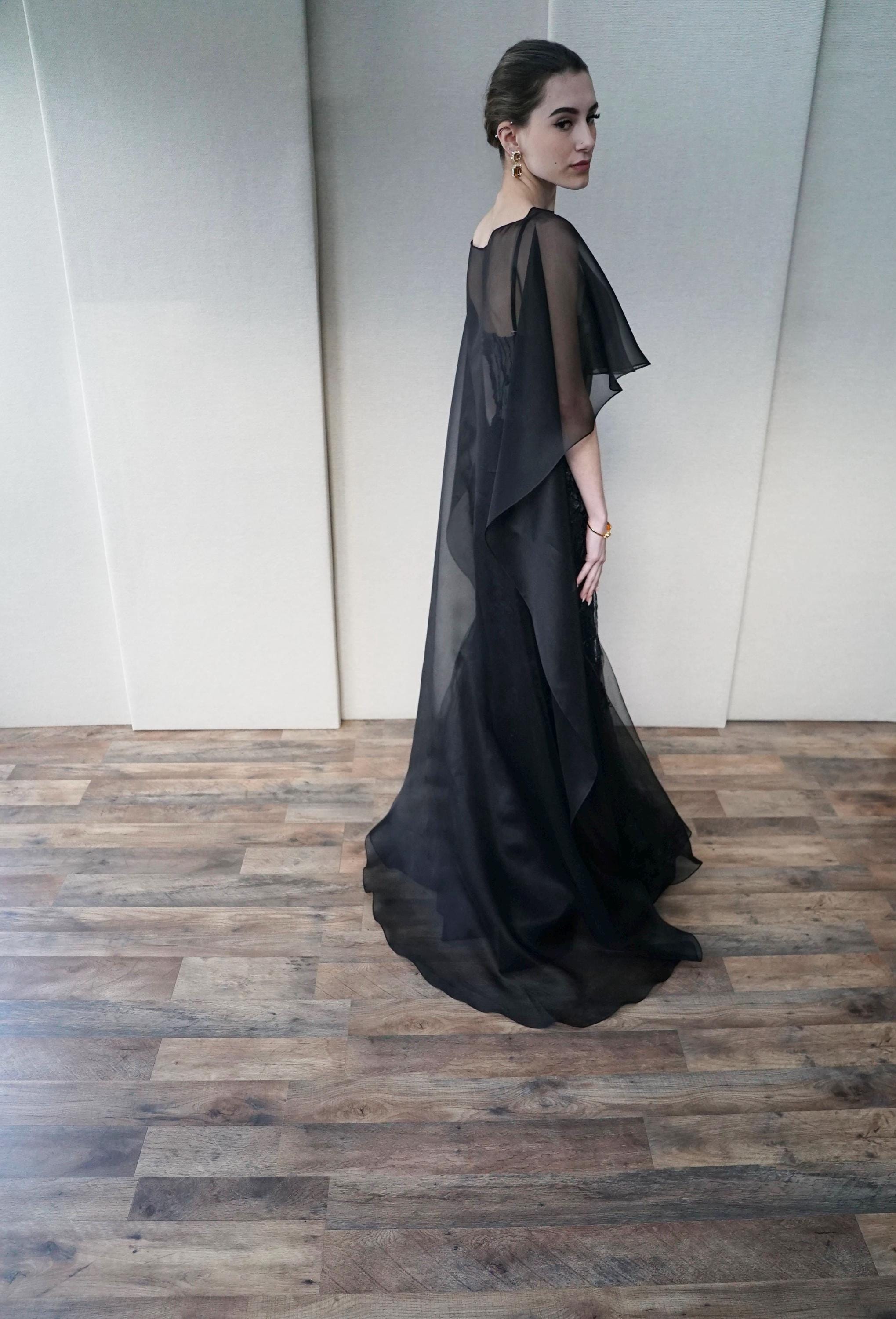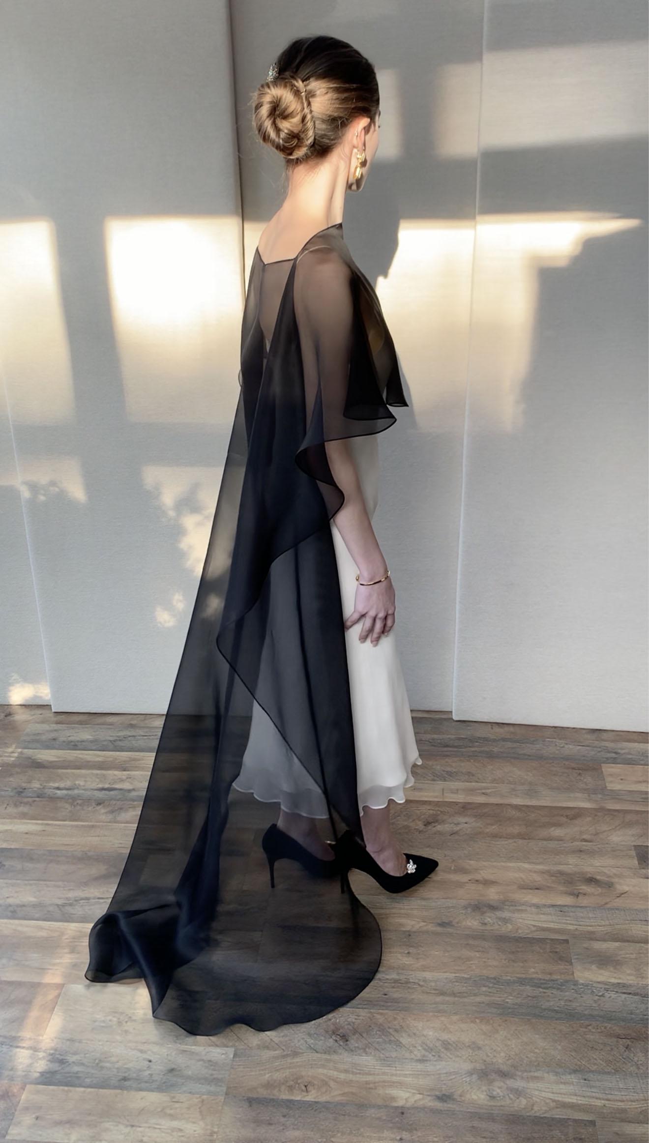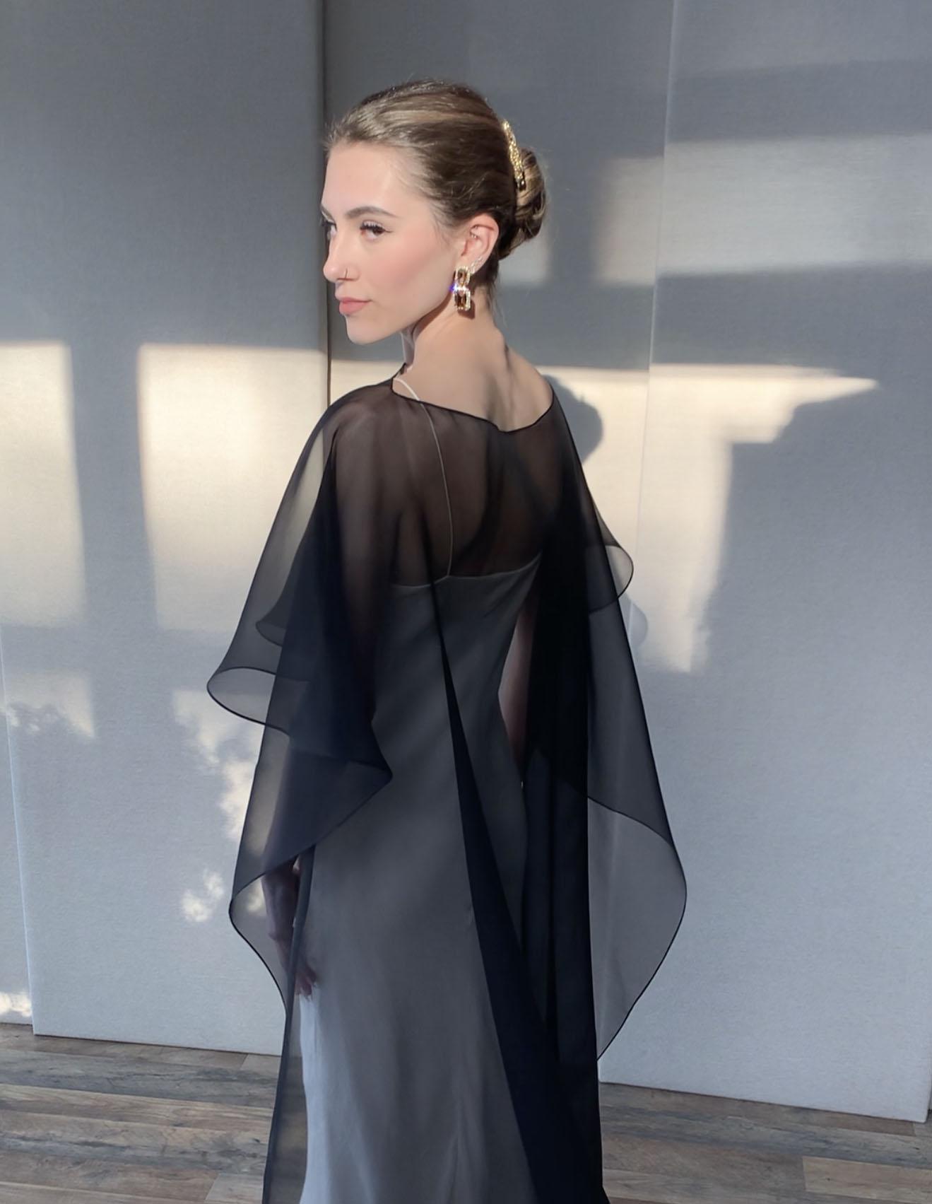 This elegant special occasion cape features flattering boat neck design, waist length front drop and a wispy train in the back. The cape is hand made out of sheer 100% silk organza trimmed with delicate rolled edge stitch. The front of the cape measures 13" from the neck and the the back measures 64" long from the neck. Shown in black organza in the photos. Different colors and lengths available. Custom colors available as well, please inquire.