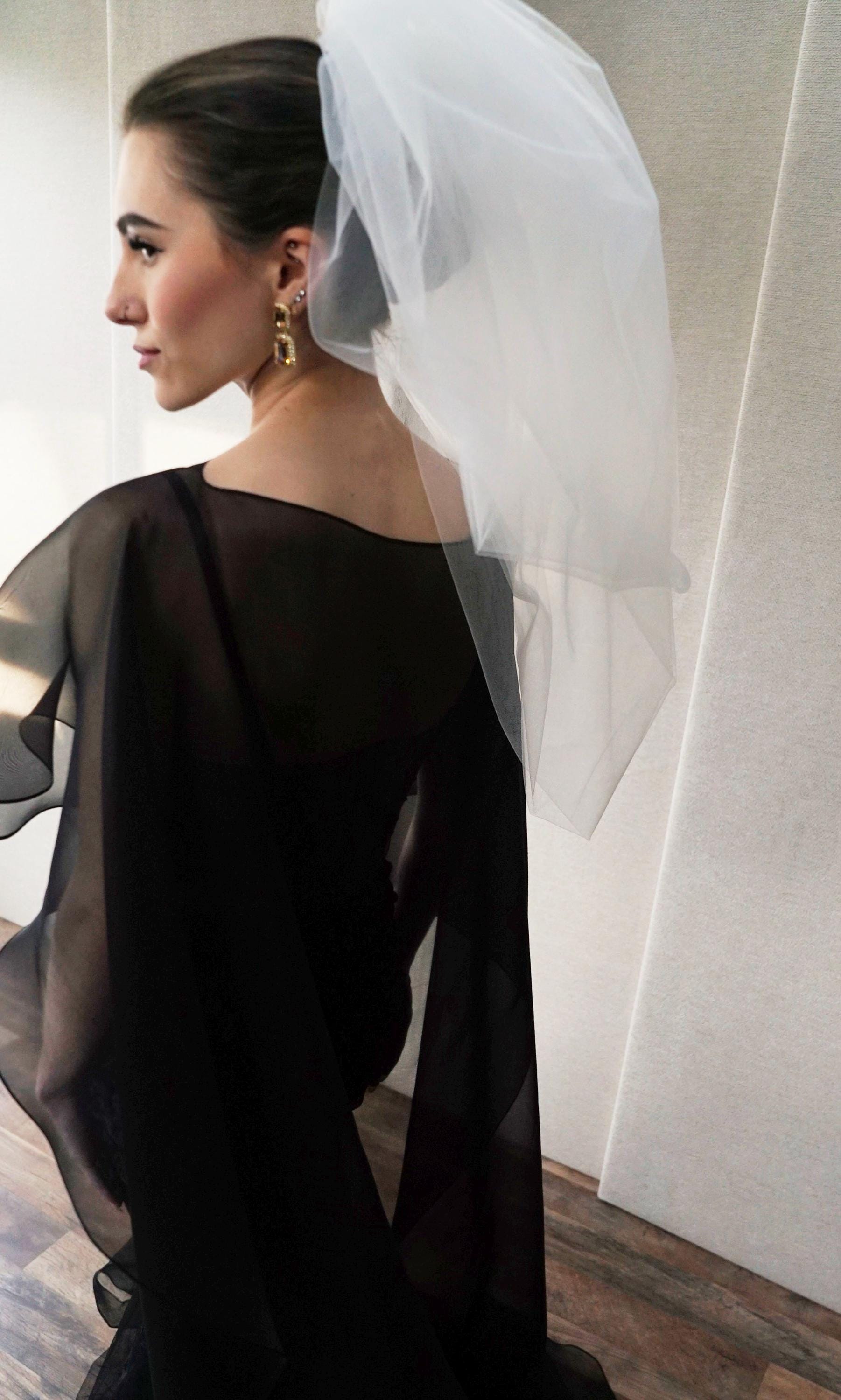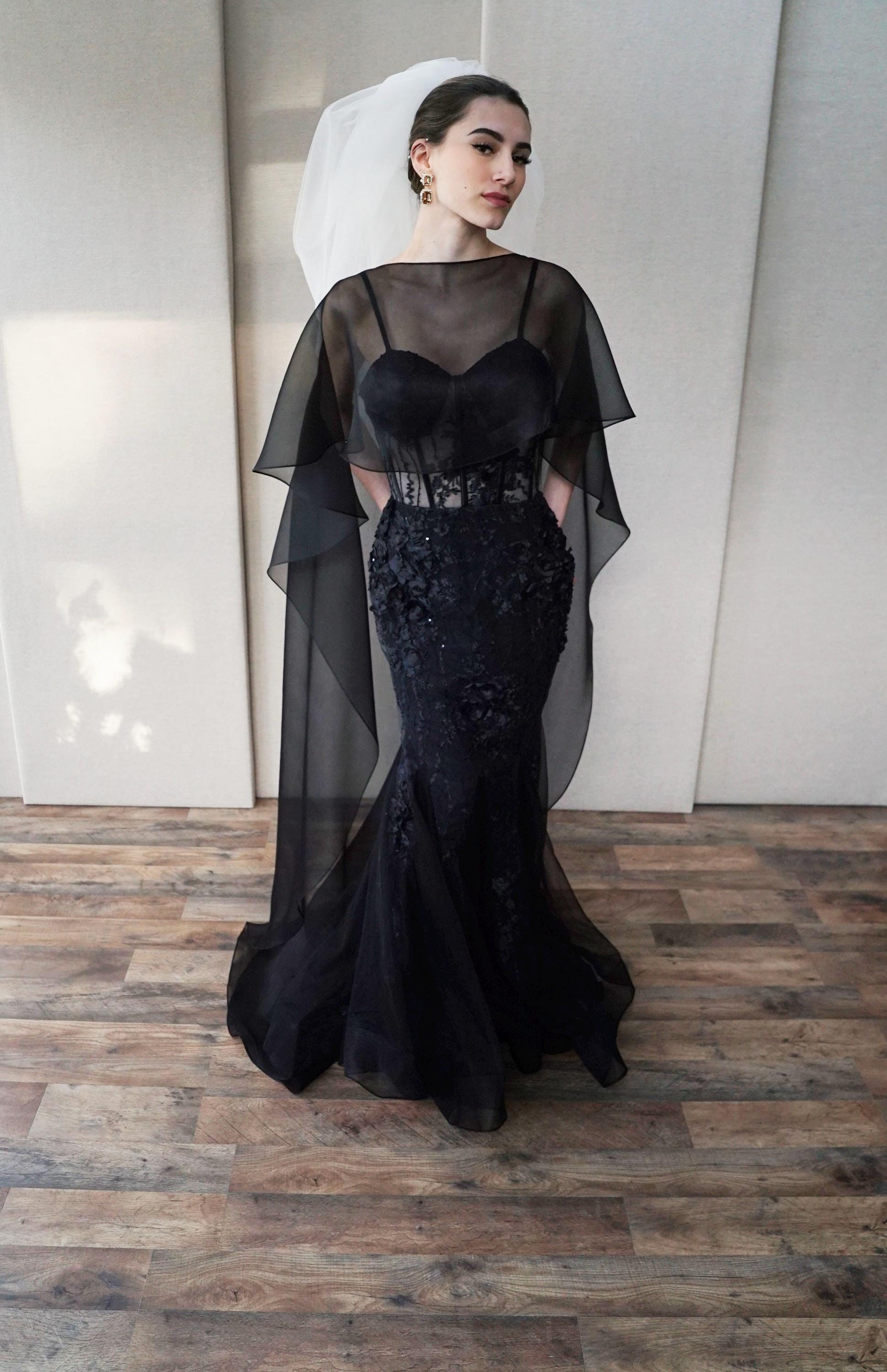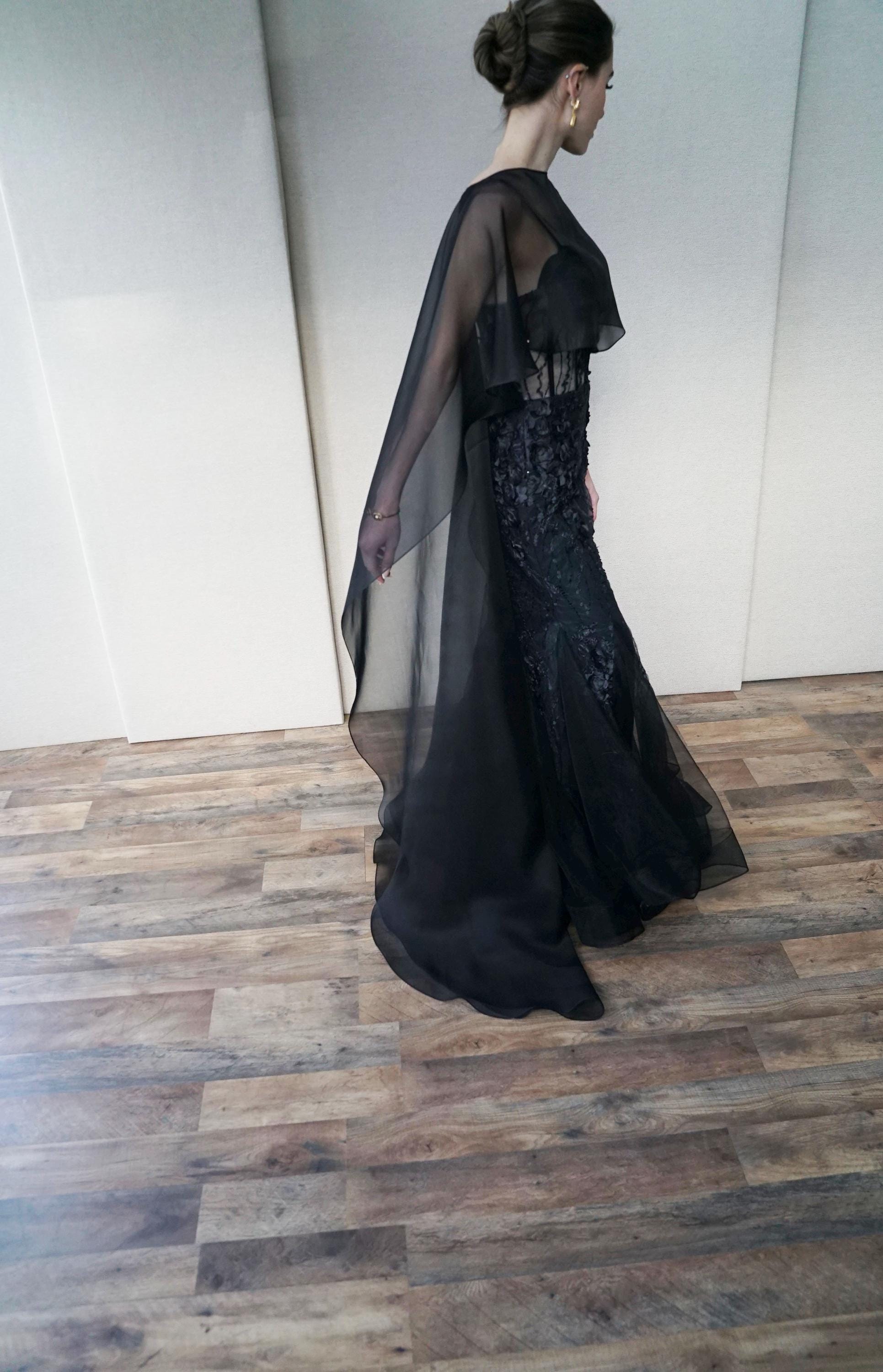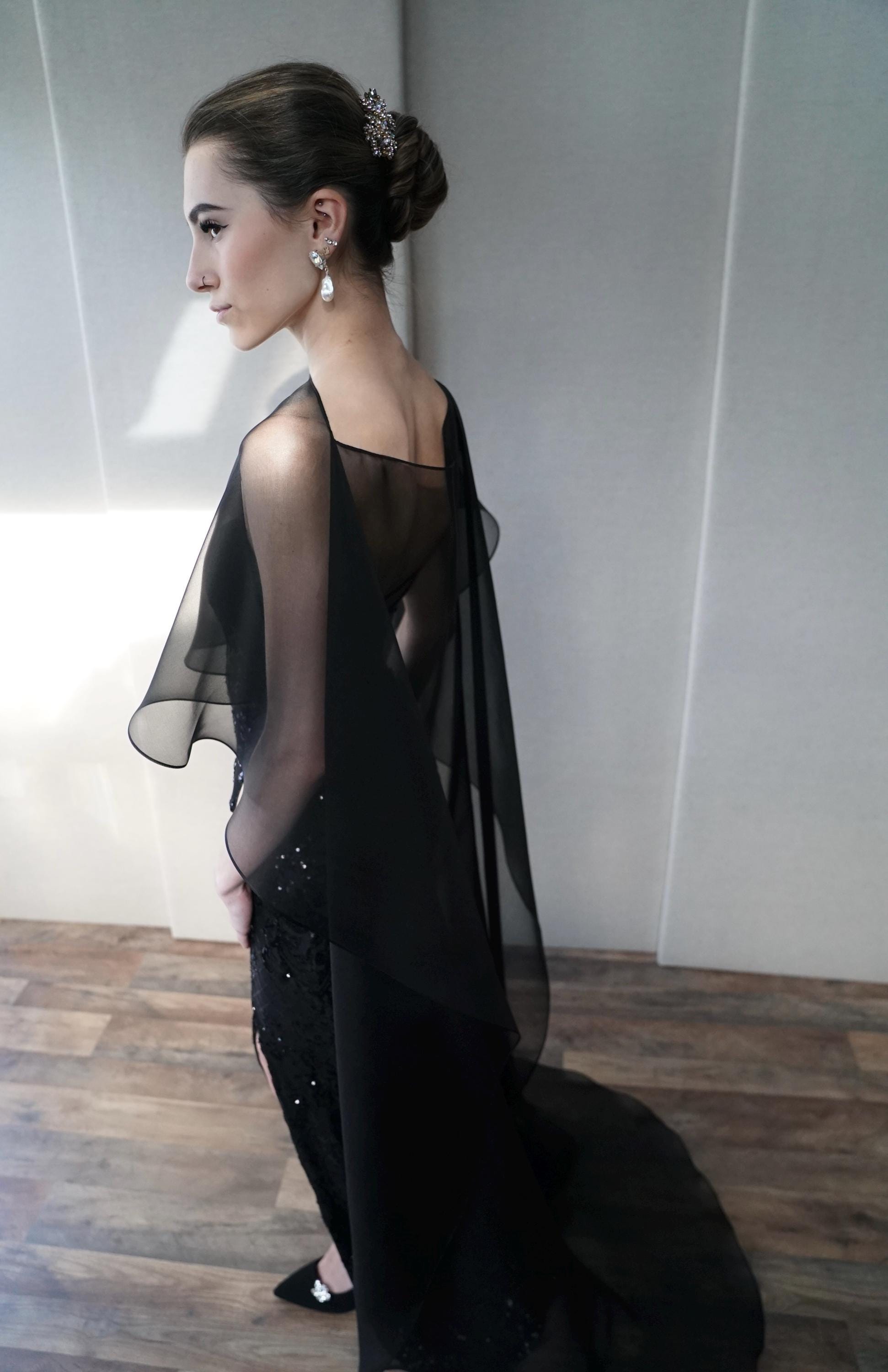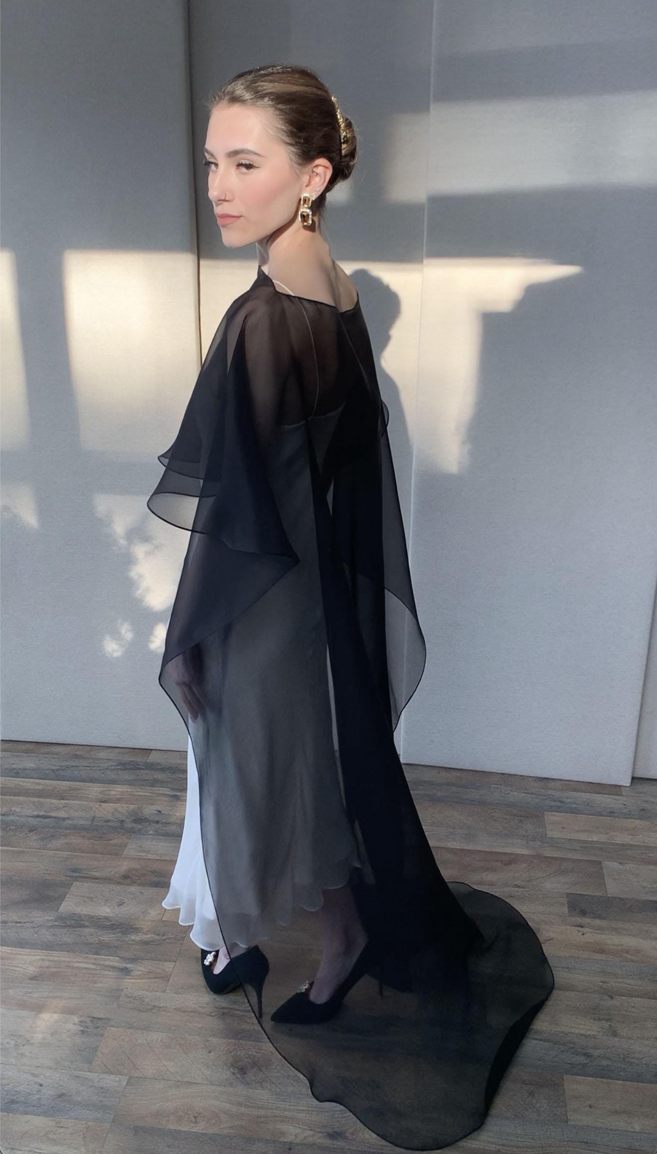 This elegant special occasion cape features flattering boat neck design, waist length front drop and a wispy train in the back. The cape is hand made out of sheer 100% silk organza trimmed with delicate rolled edge stitch. The front of the cape measures 13" from the neck and the the back measures 64" long from the neck. Shown in black organza in the photos. Different colors and lengths available. Custom colors available as well, please inquire.