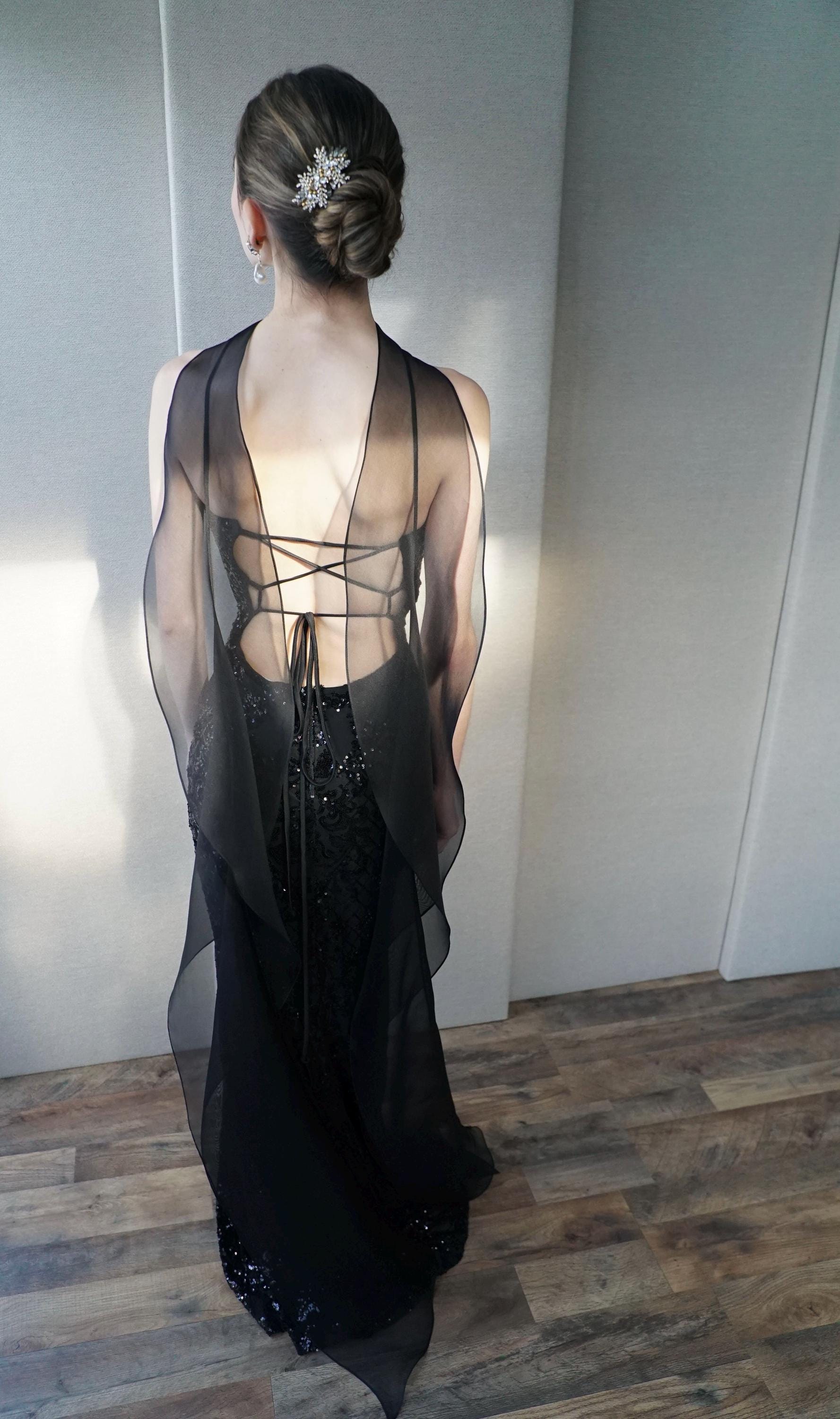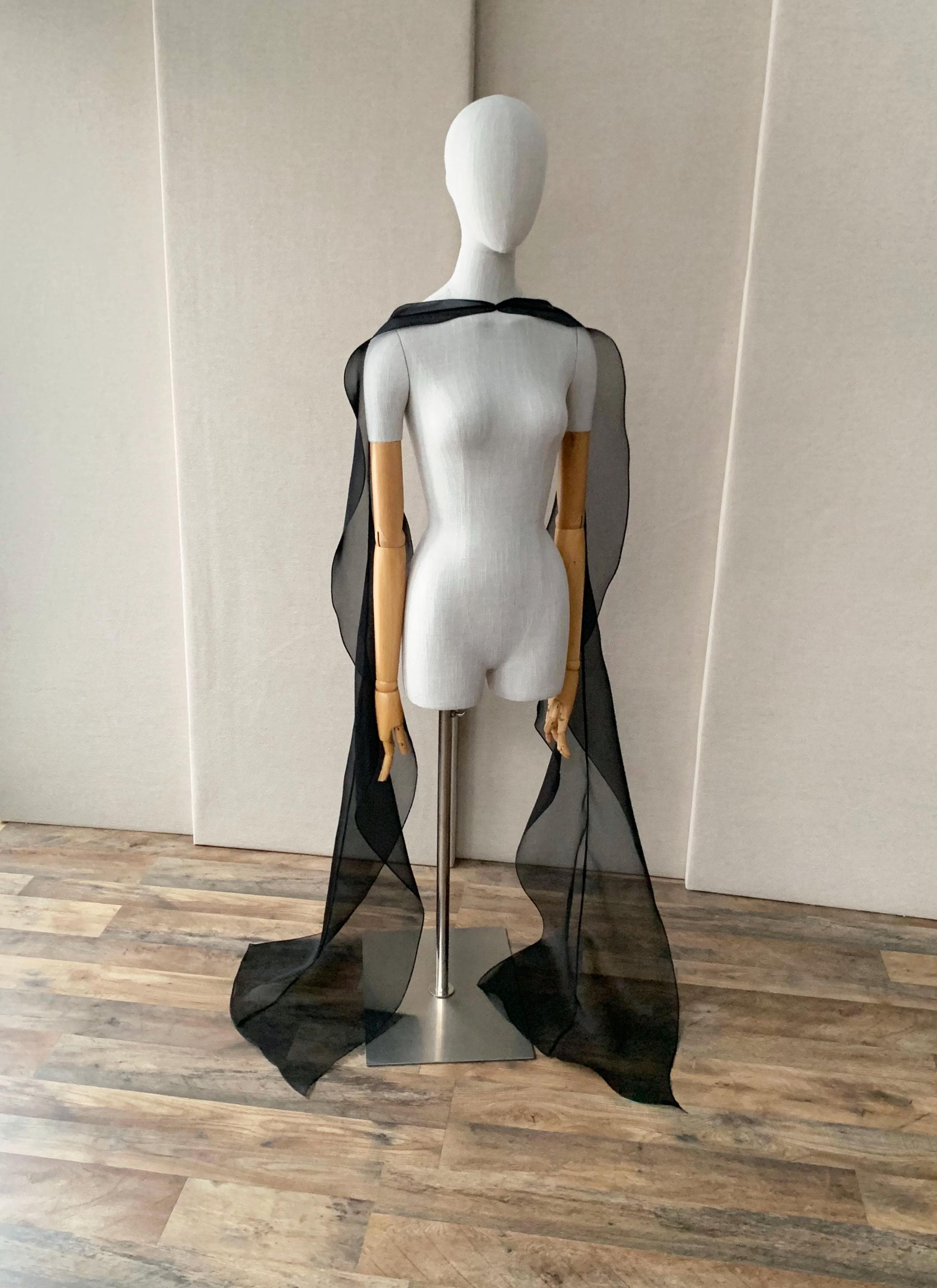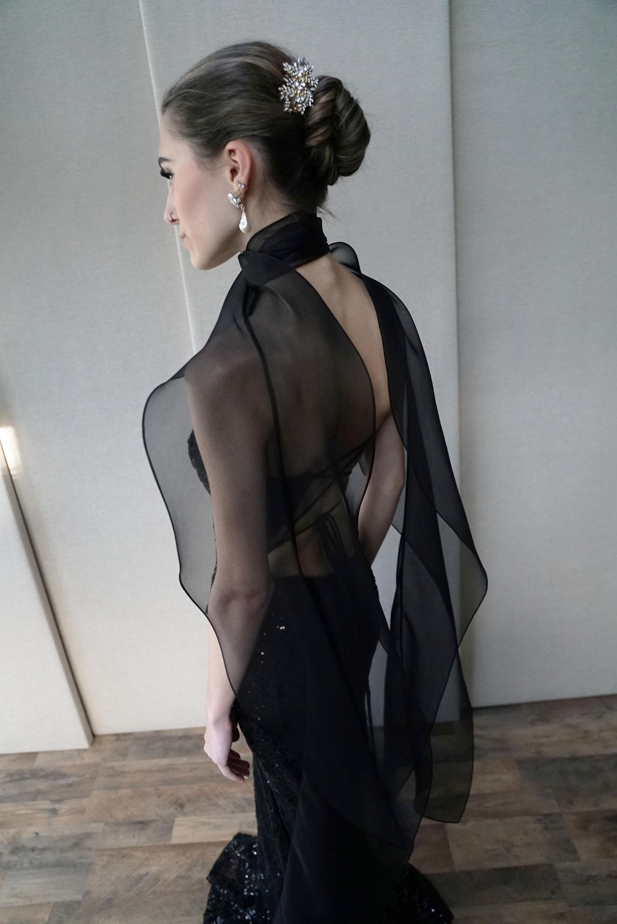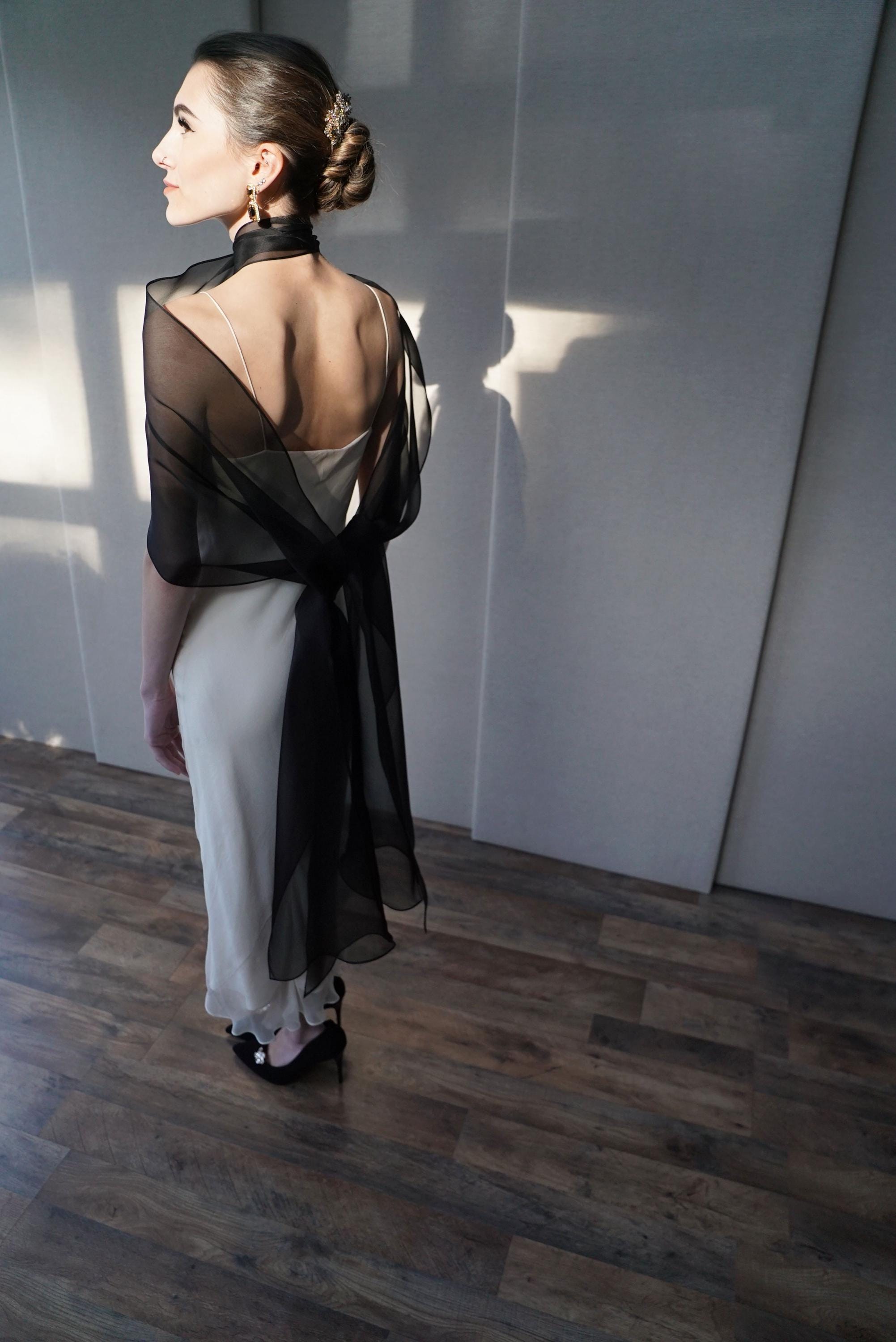 This delicate bridal scarf features flattering thin criss-cross design at the neck and a cascading fluttery sides down your back. The shawl is hand made in pure silk organza trimmed with delicate rolled edge stitch. You can wear this elegant shawl several different ways. Shown in black organza in the photos. Different colors and lengths available. The scarf shown measures 132" long in total length. Custom colors available as well, please inquire.