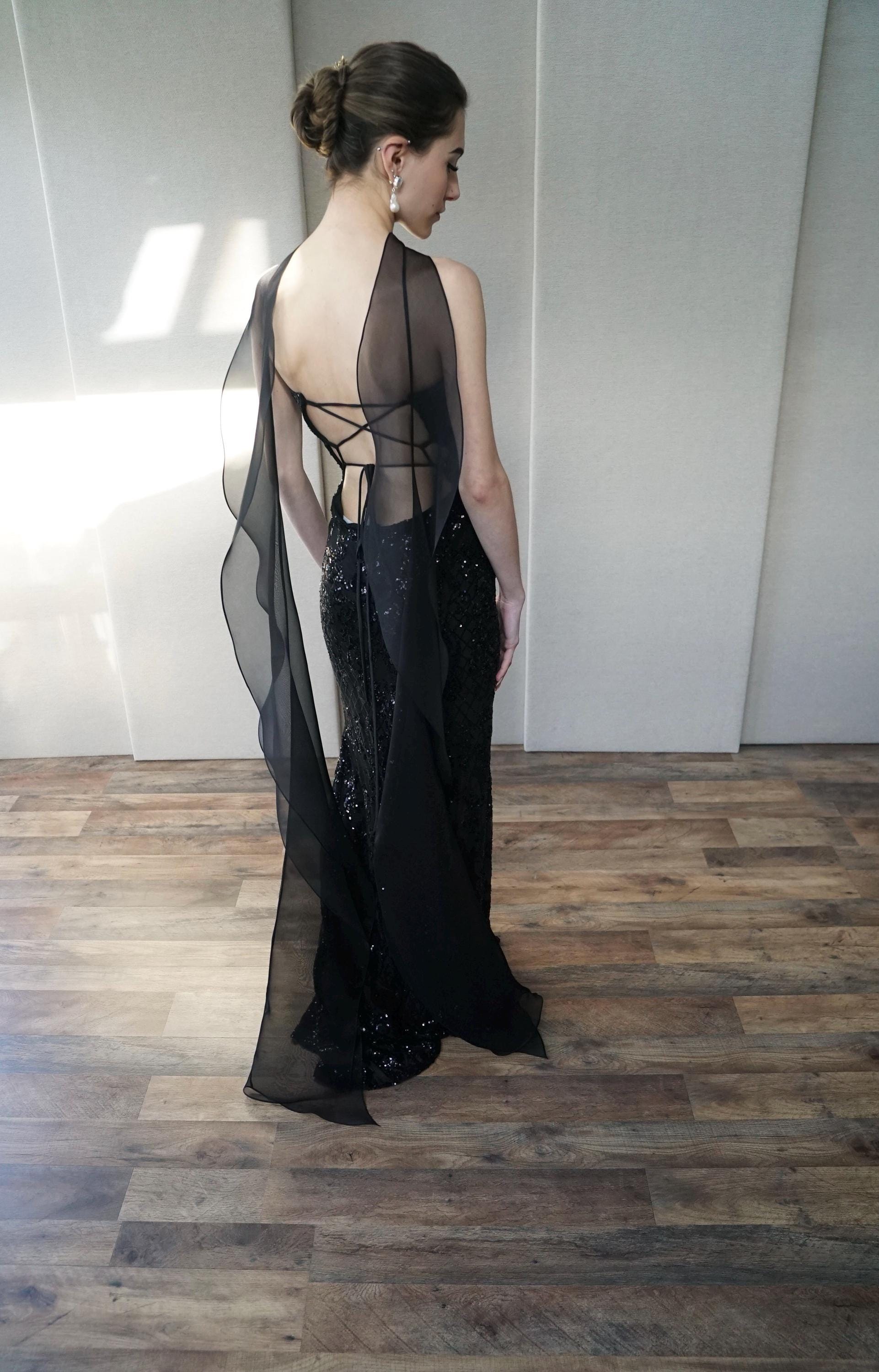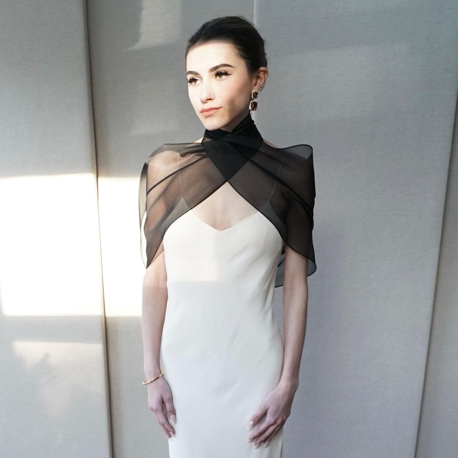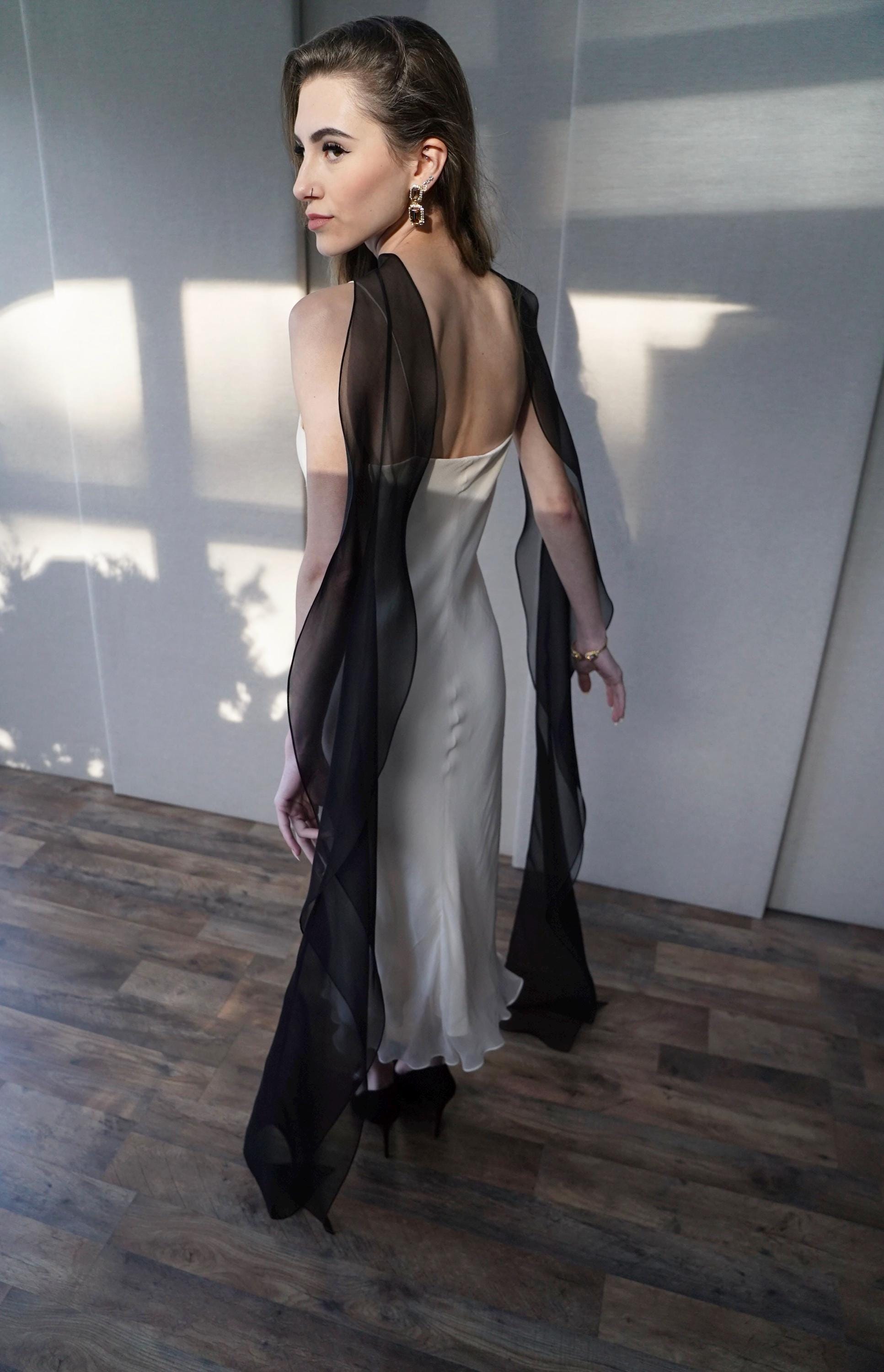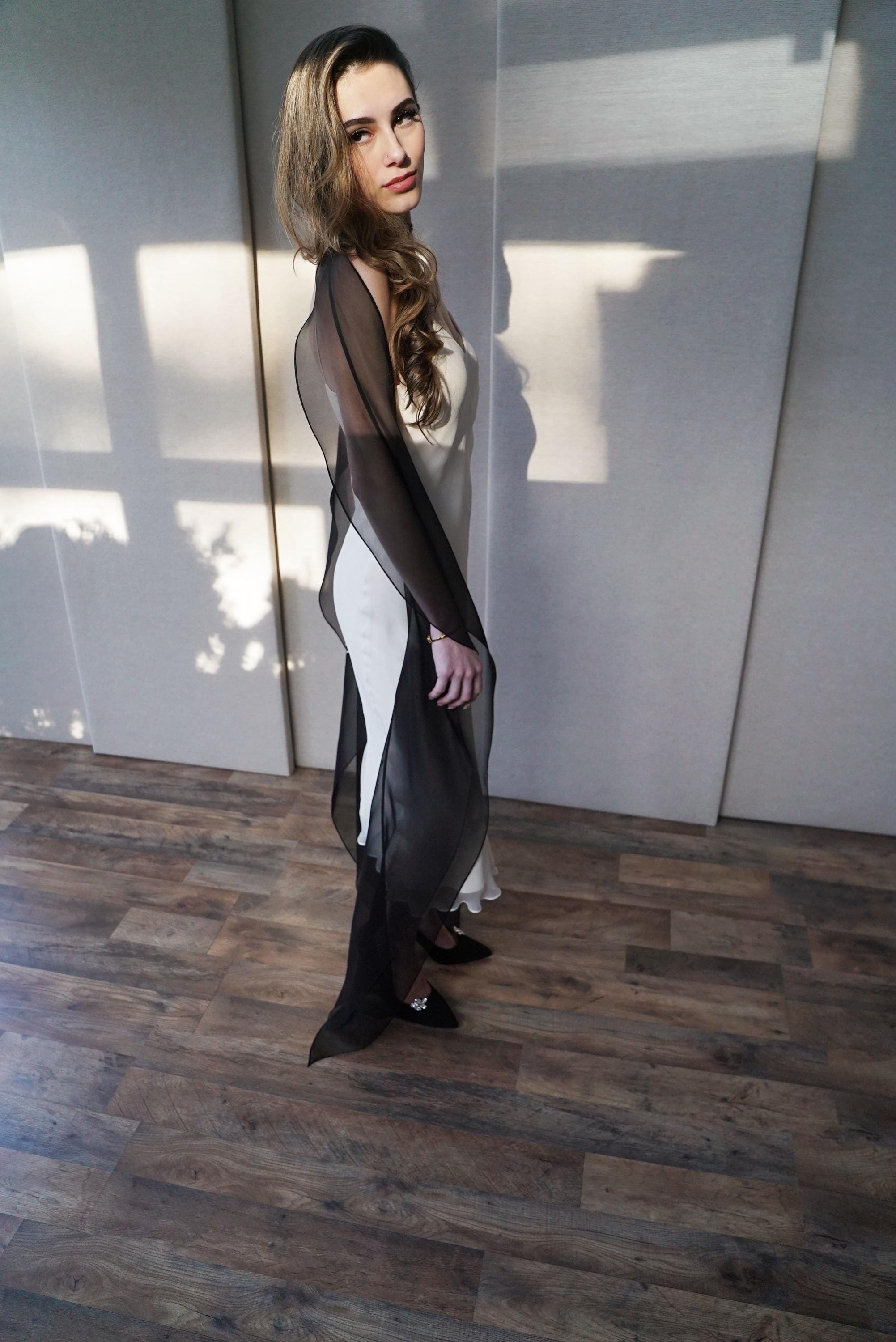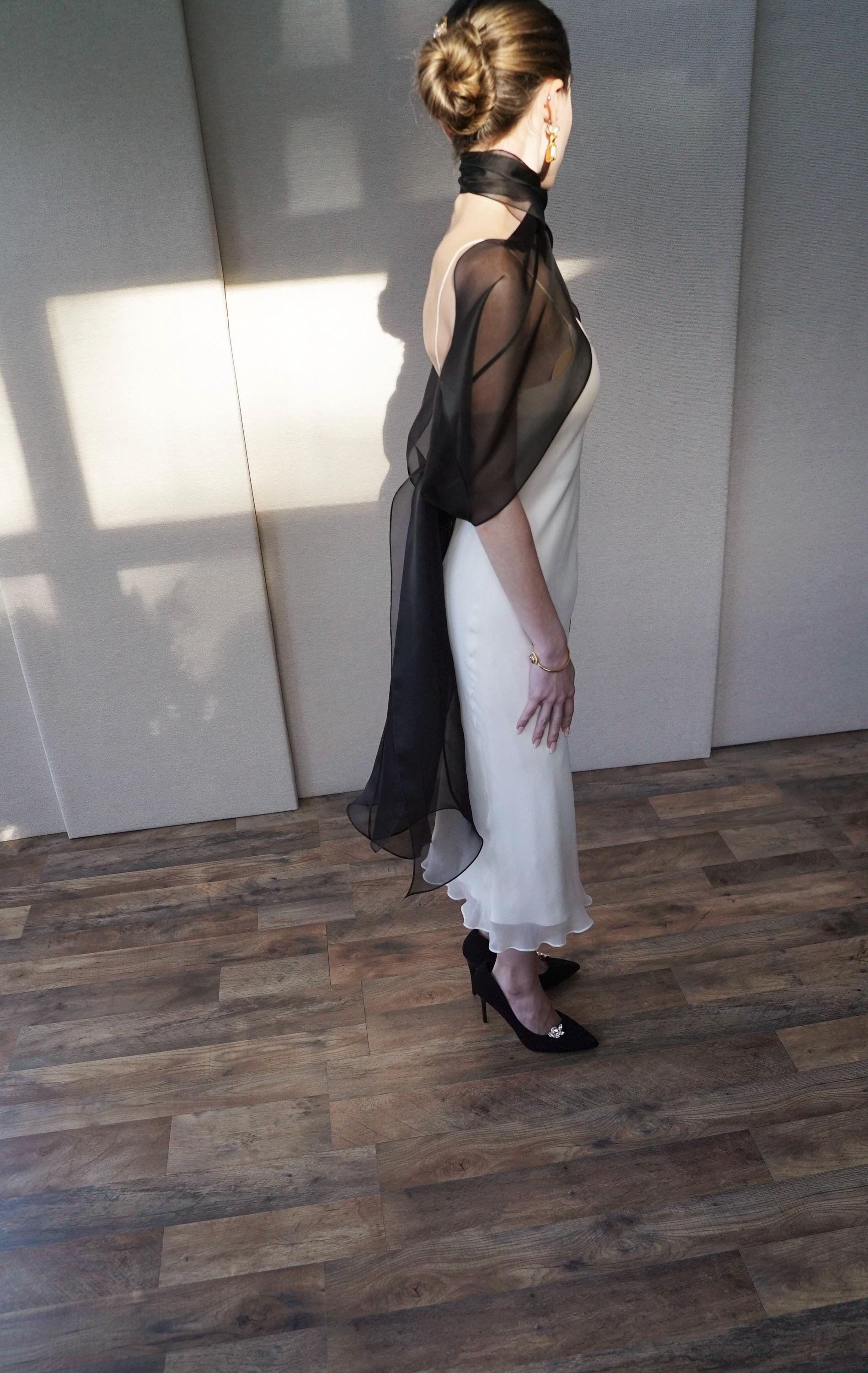 This delicate bridal scarf features flattering thin criss-cross design at the neck and a cascading fluttery sides down your back. The shawl is hand made in pure silk organza trimmed with delicate rolled edge stitch. You can wear this elegant shawl several different ways. Shown in black organza in the photos. Different colors and lengths available. The scarf shown measures 132" long in total length. Custom colors available as well, please inquire.