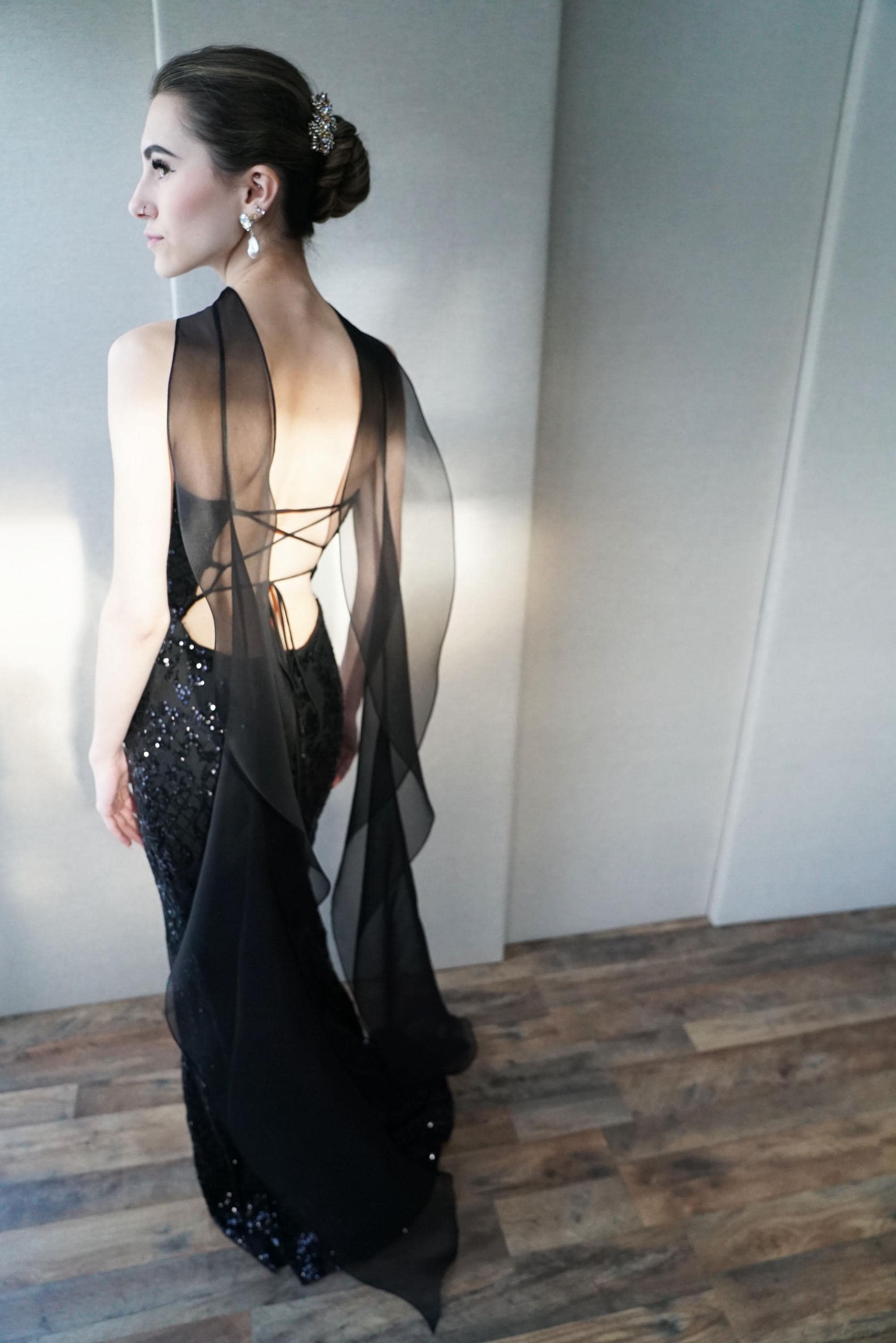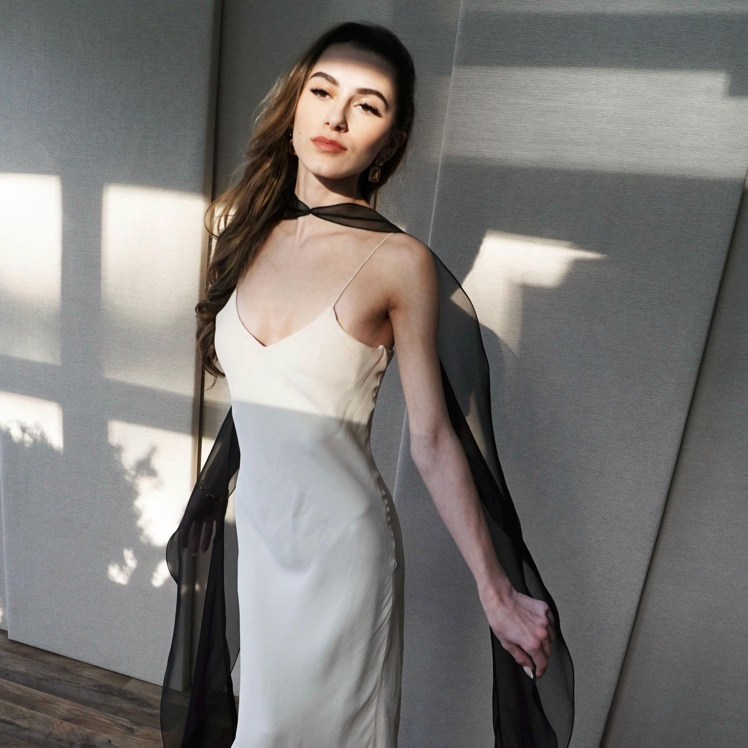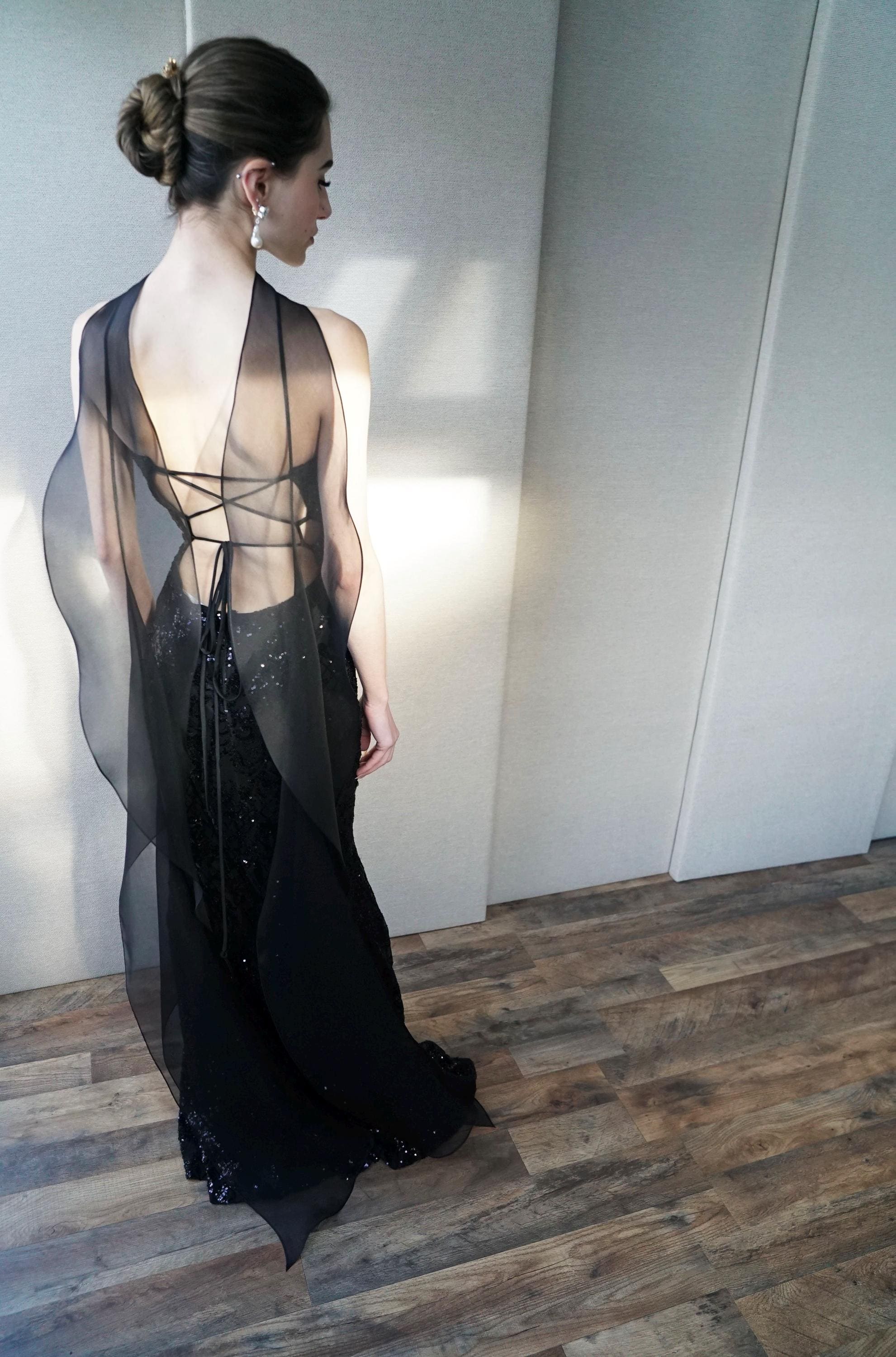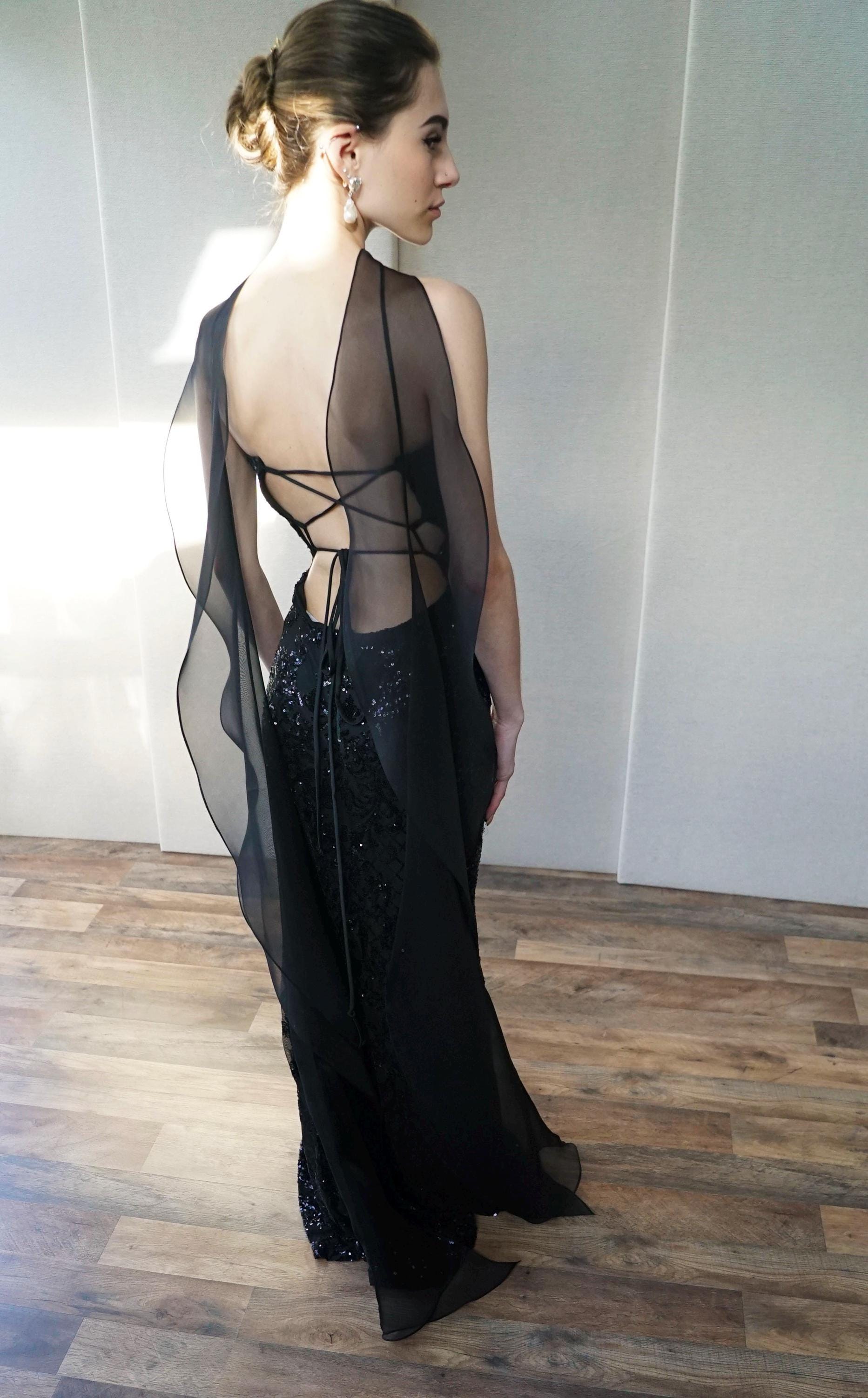 This delicate bridal scarf features flattering thin criss-cross design at the neck and a cascading fluttery sides down your back. The shawl is hand made in pure silk organza trimmed with delicate rolled edge stitch. You can wear this elegant shawl several different ways. Shown in black organza in the photos. Different colors and lengths available. The scarf shown measures 132" long in total length. Custom colors available as well, please inquire.