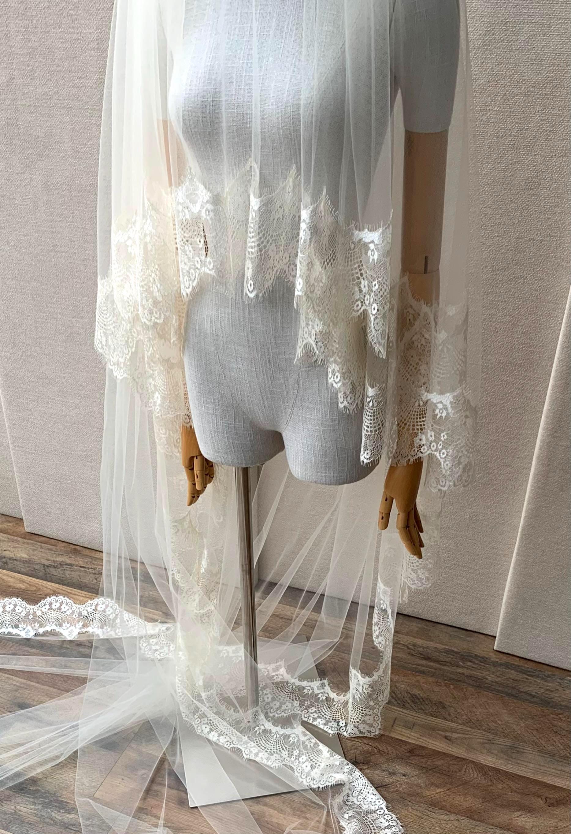 Champagne wedding veil, Long cascading veil with delicate Chantilly lace and scalloped edge, white, ivory, cream