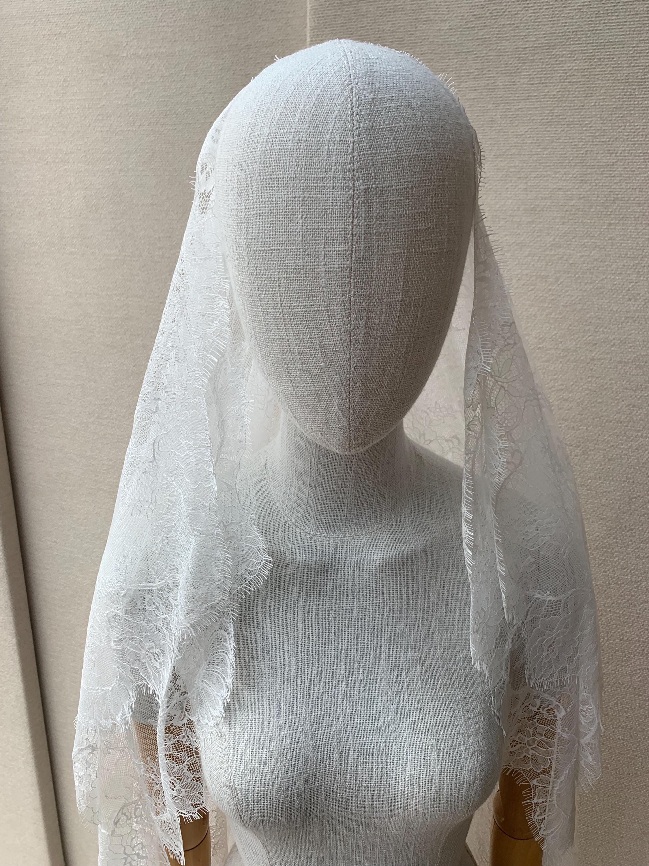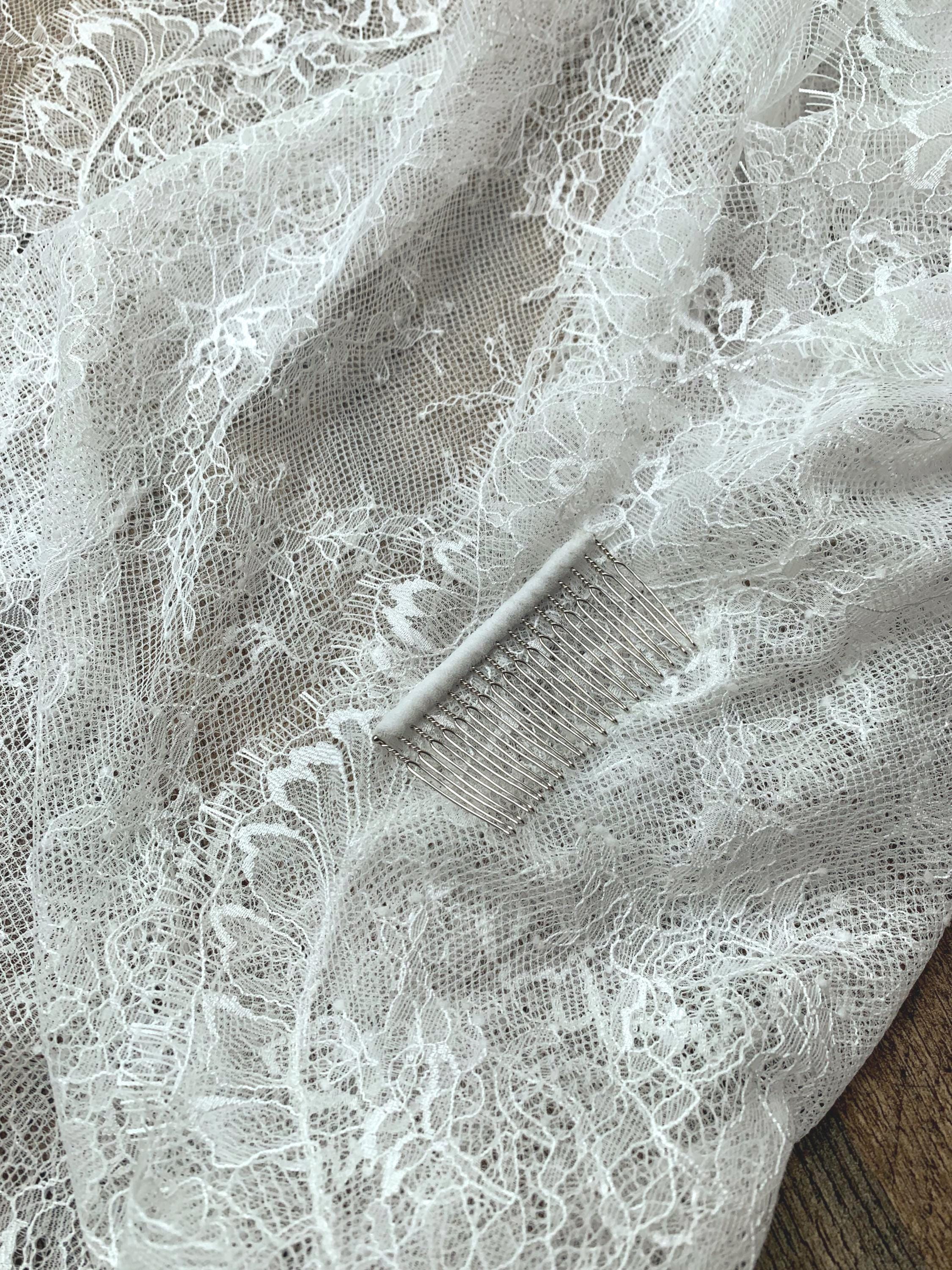 This gorgeous veil with super delicate Chantilly lace will add a soft romantic touch to your wedding look. Hand made entirely with beautiful floral soft high-quality lace. The veil is secured in your hair with the comb on top of your head. This Cathedral length veil measures 1104" long from the hair comb to the bottom of the veil while the blusher is 30" long. The color of the veil is soft white and will work with white or diamond white/light ivory dresses. Also available in ivory.