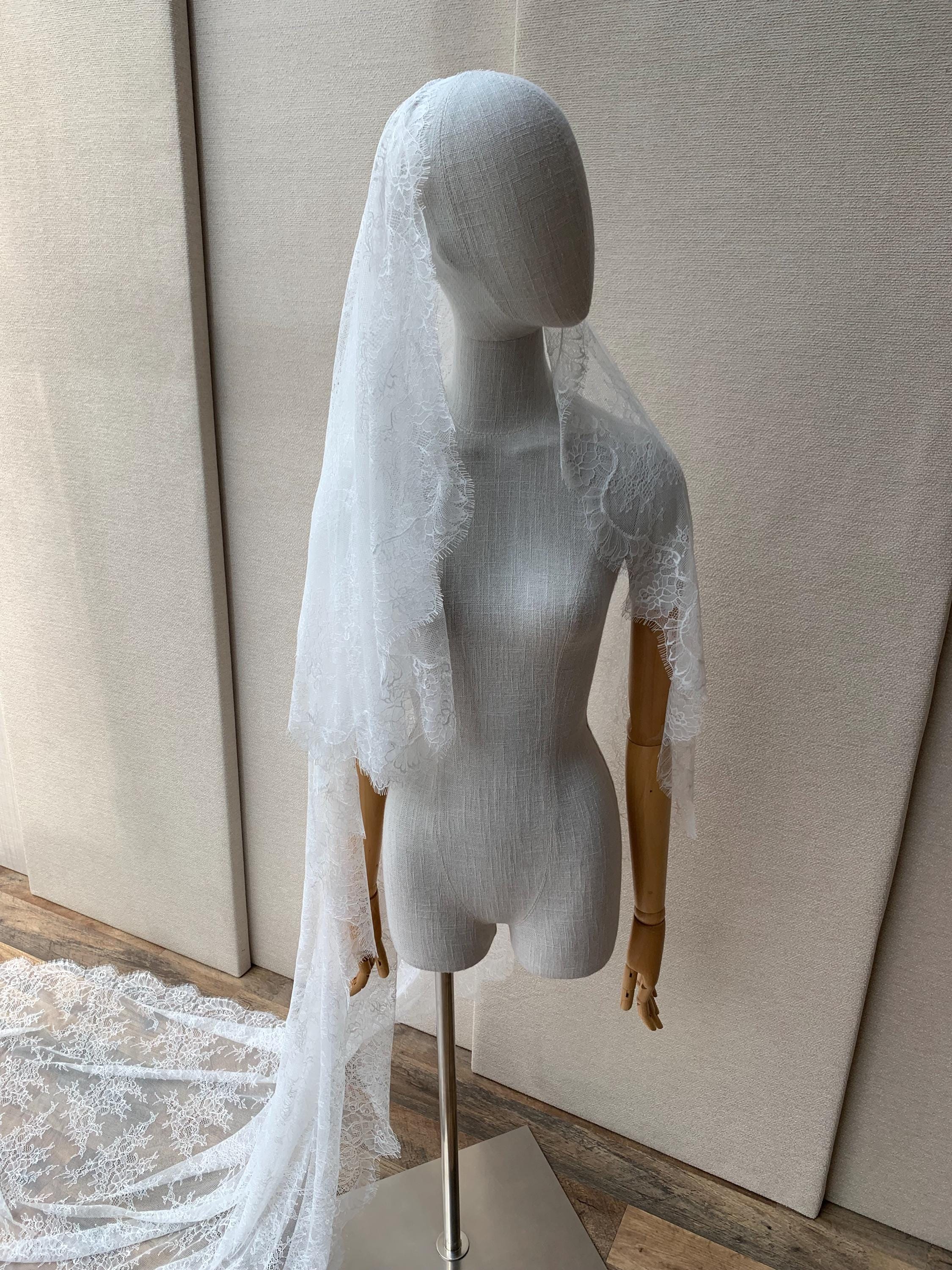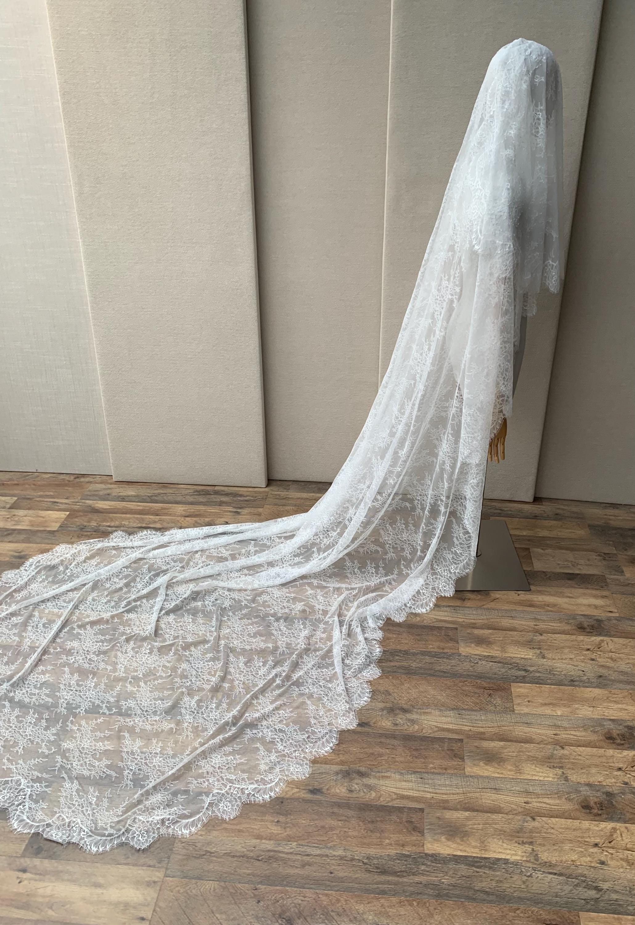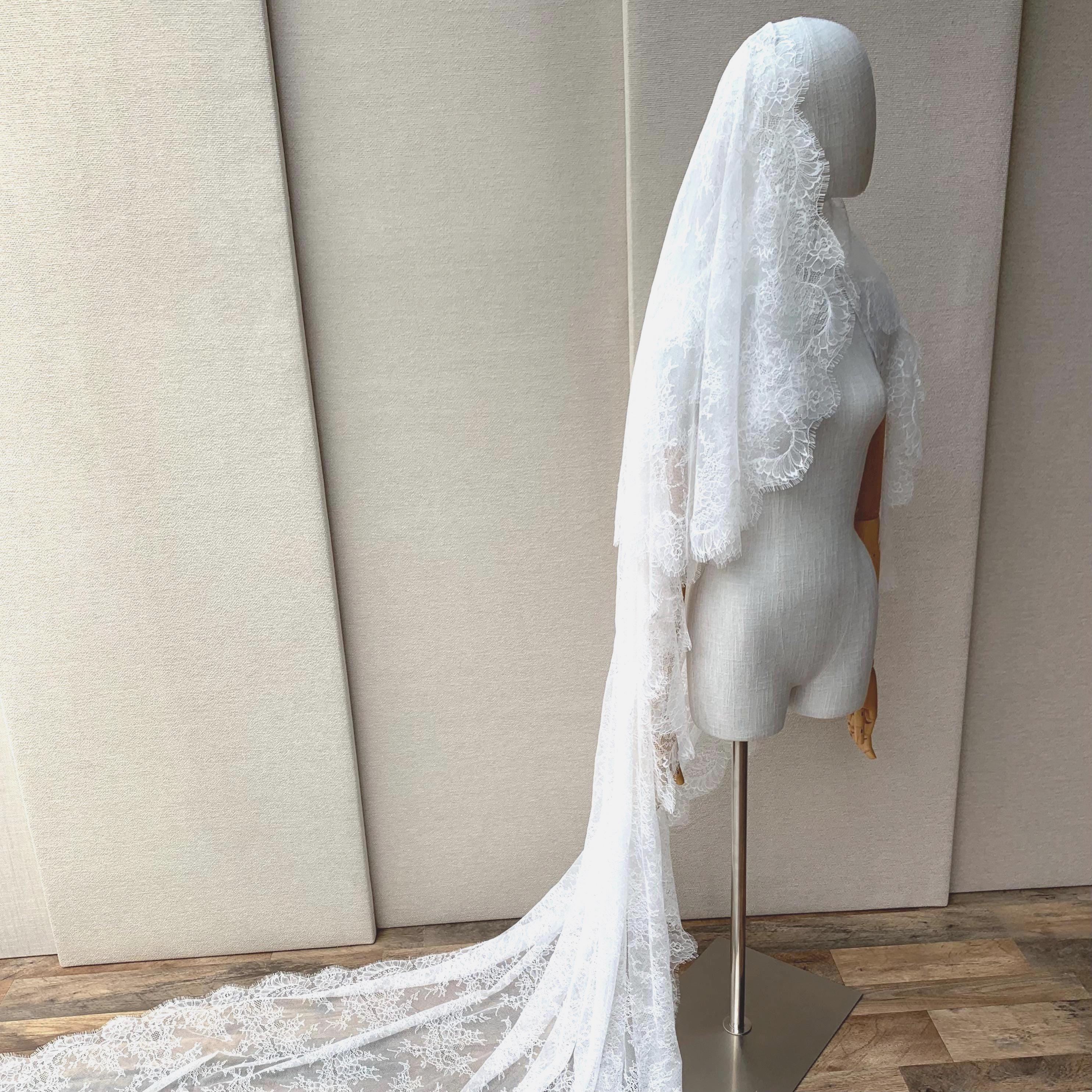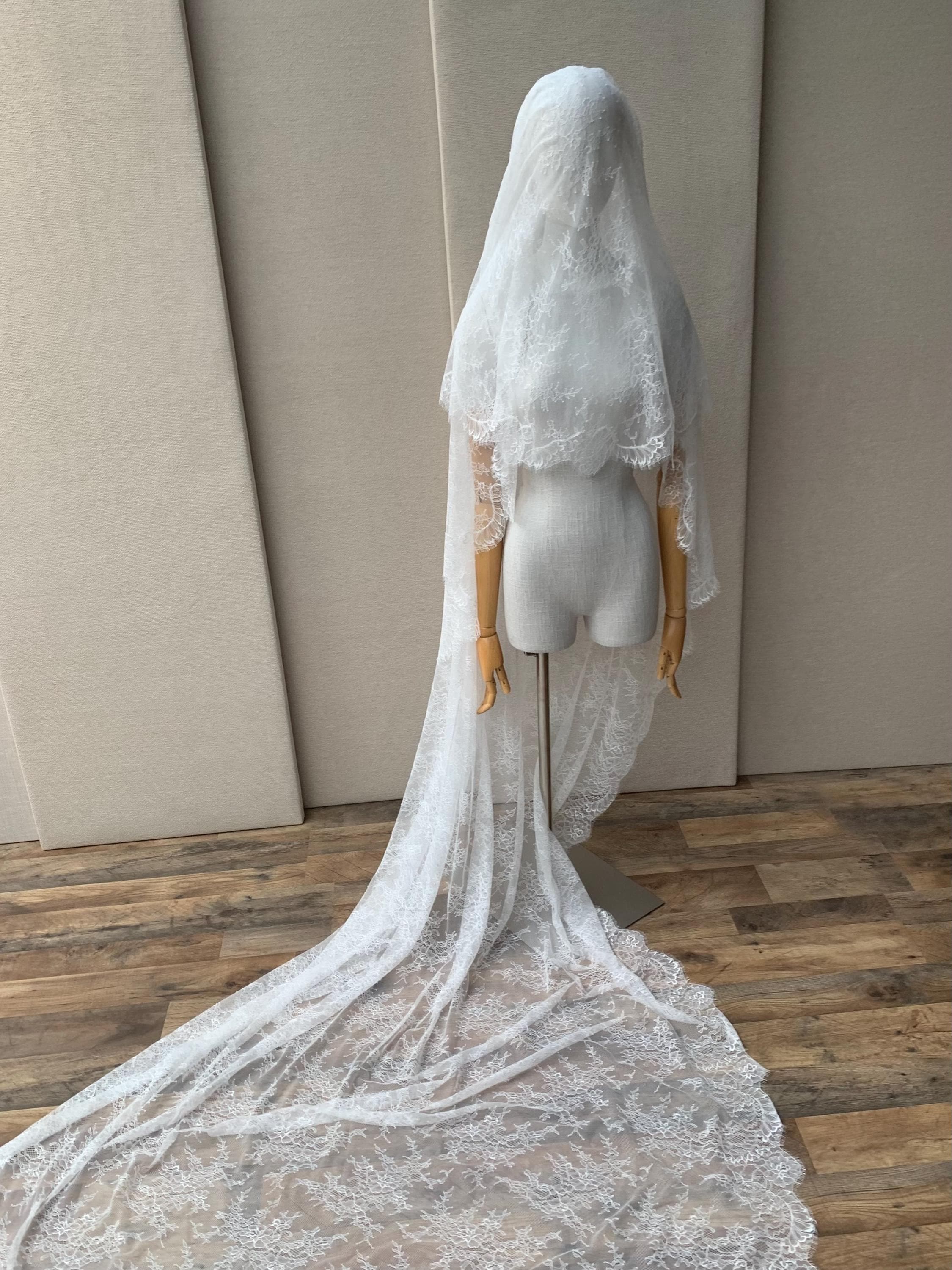 Lace veil in cathedral length with blusher, Delicate Chantilly lace veil long, two tier