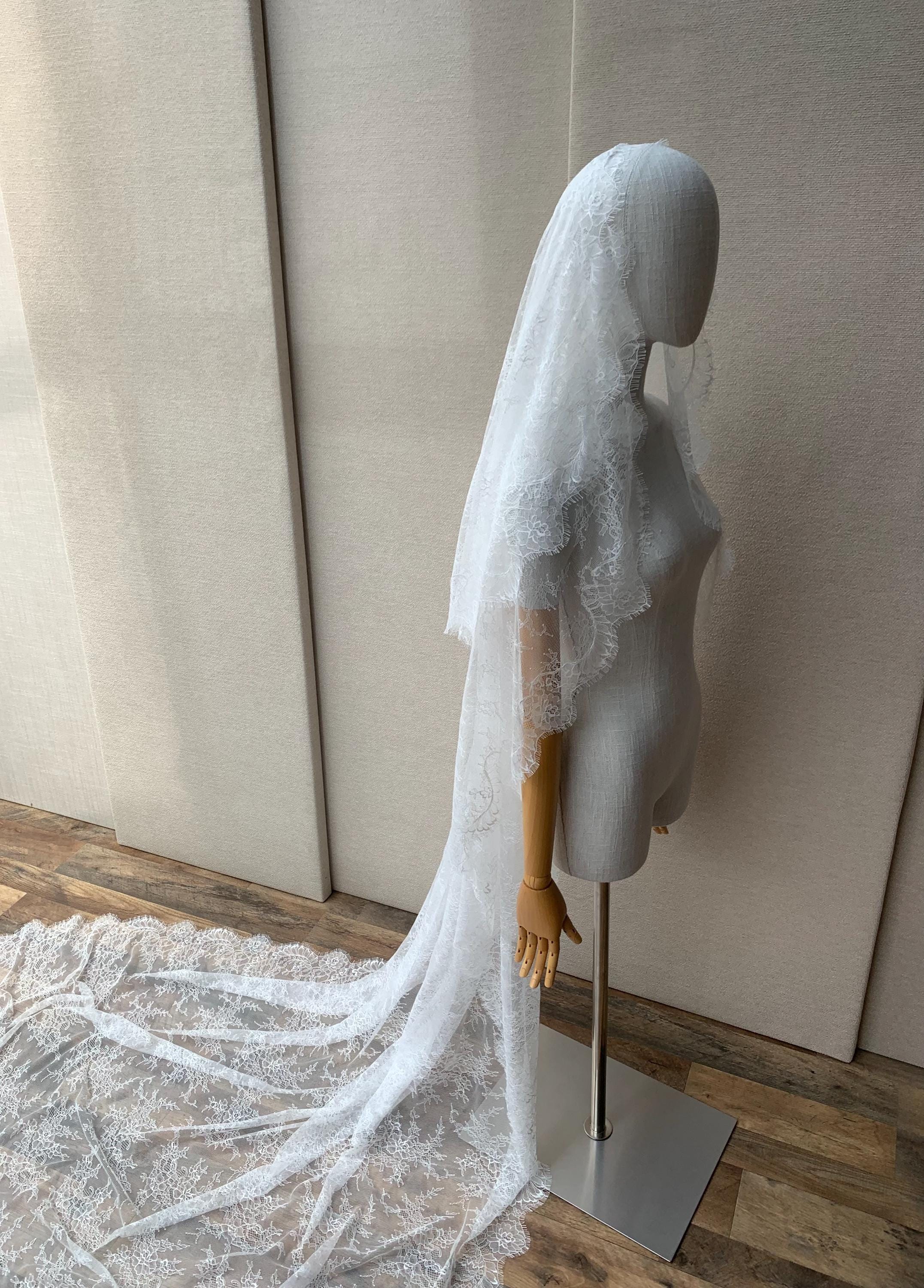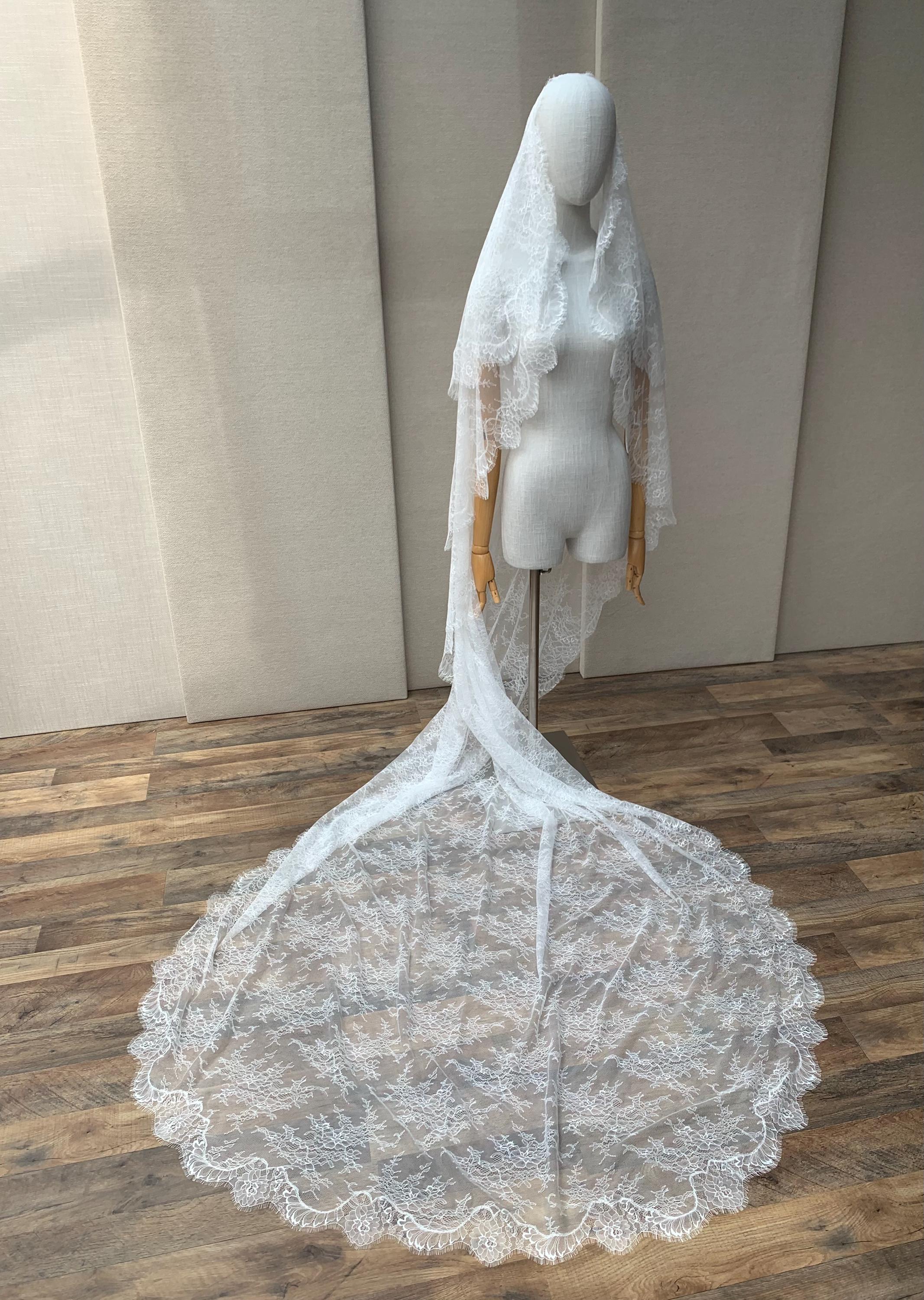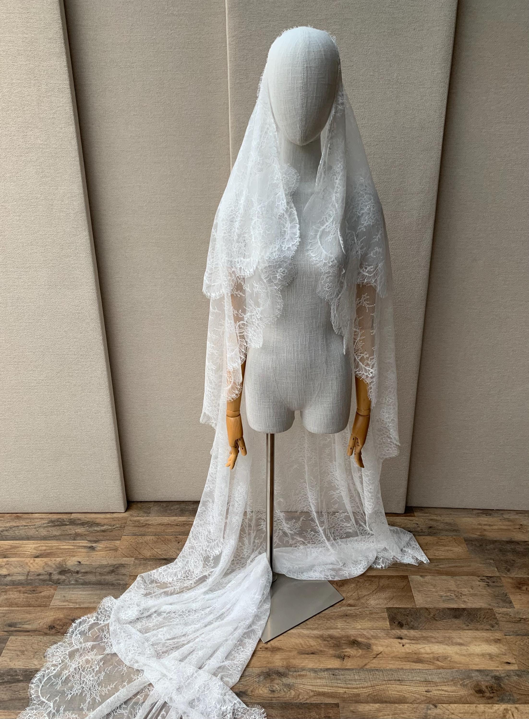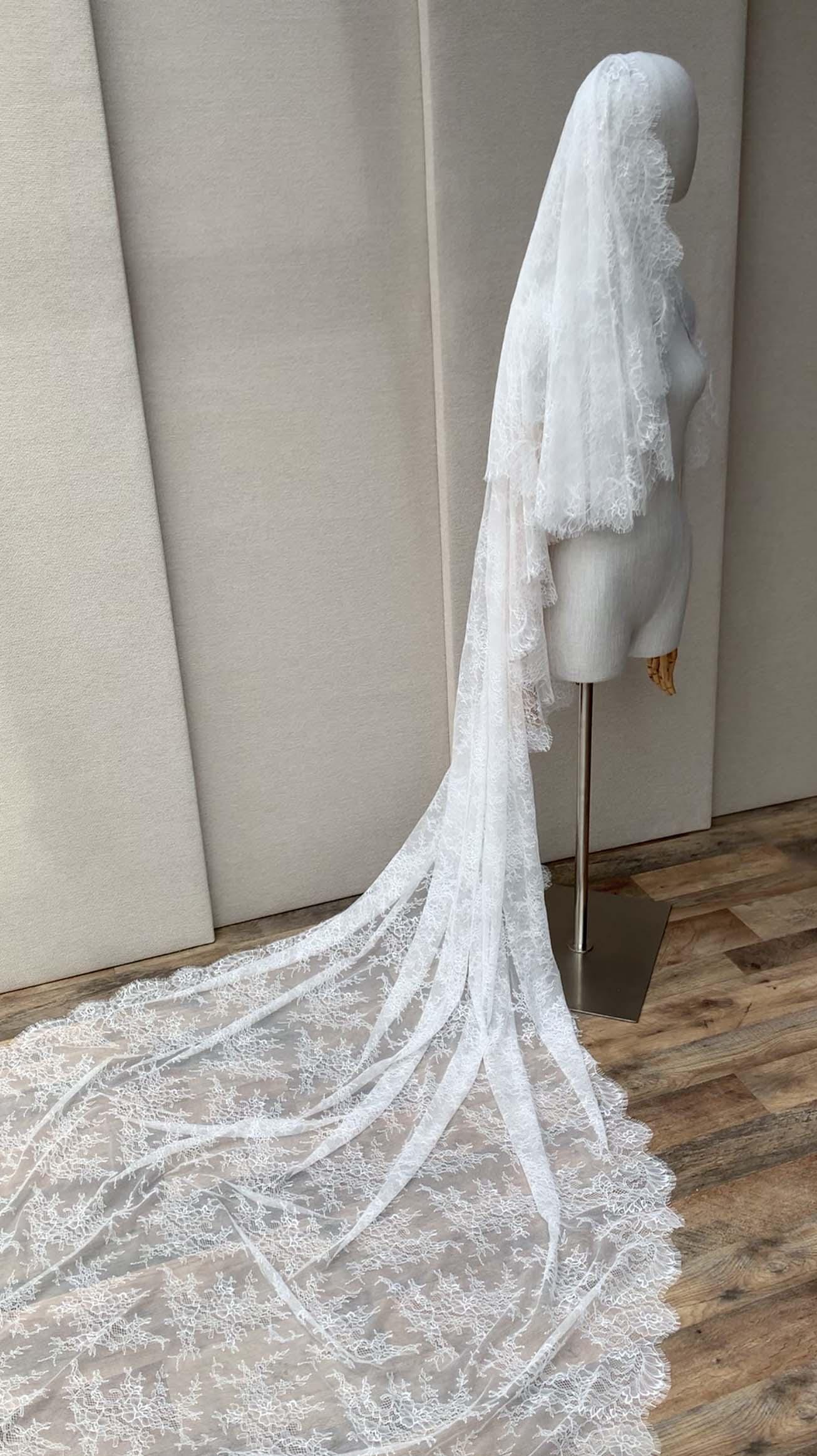 Lace veil in cathedral length with blusher, Delicate Chantilly lace veil long, two tier