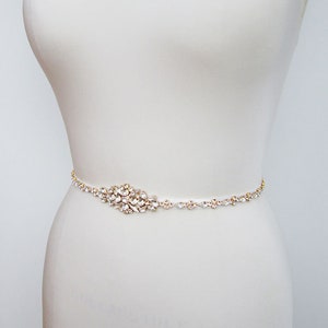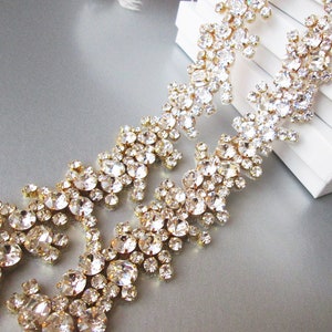 This sparkly bridal belt is made with fancy the Premium European Crystal beaded on 3/8" wide organza ribbon. The crystal part of the belt measures 23" long and 3/8" wide. The entire sash measures 150" long. Available in gold, silver or rose gold finish.