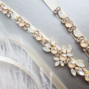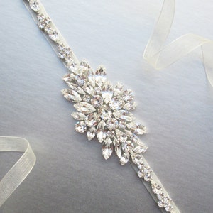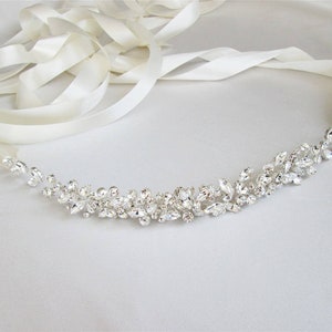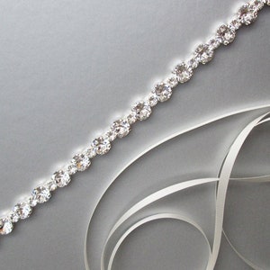 This elegant bridal belt is made with the Premium Quality European Crystal beaded on 5/8" wide double face satin ribbon. The crystal part of the belt measures 3 1/2" long and 1 5/8" wide in the center. The entire sash measures 150" long. Available in gold, silver or rose gold finish.