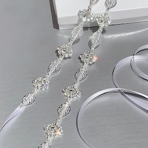This skinny bridal belt is made with the Premium Quality European Crystal and pearls. The crystal beading measures 22 1/2" long. The width of the belt measures 1" wide at the widest point and 1/8" wide at the narrowest point. The entire sash measures 150" long. Available in gold, silver and rose gold finish. Double face satin ribbon ties.