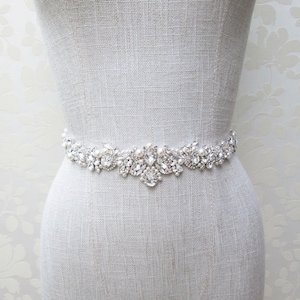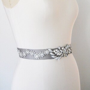 This belt is made with the Premium European Crystal and hand tarnished brass components neatly twisted to form this unique floating effect crystal belt. The belt measures 1/2" wide and 23" long and is tied in the back with four petite ribbons. The entire sash with the ribbons measures 150" long. Available with a variety of ribbon options.