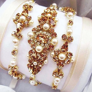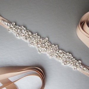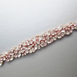 This rose gold bridal belt features elegant Premium Quality European Crystal design appliquéd on a satin ribbon sash. The crystal part of the belt measures about 15" long and 1 1/2" wide in the center. The ribbon measures 3/8" wide and 150" long. Available is gold, silver or rose gold finish.