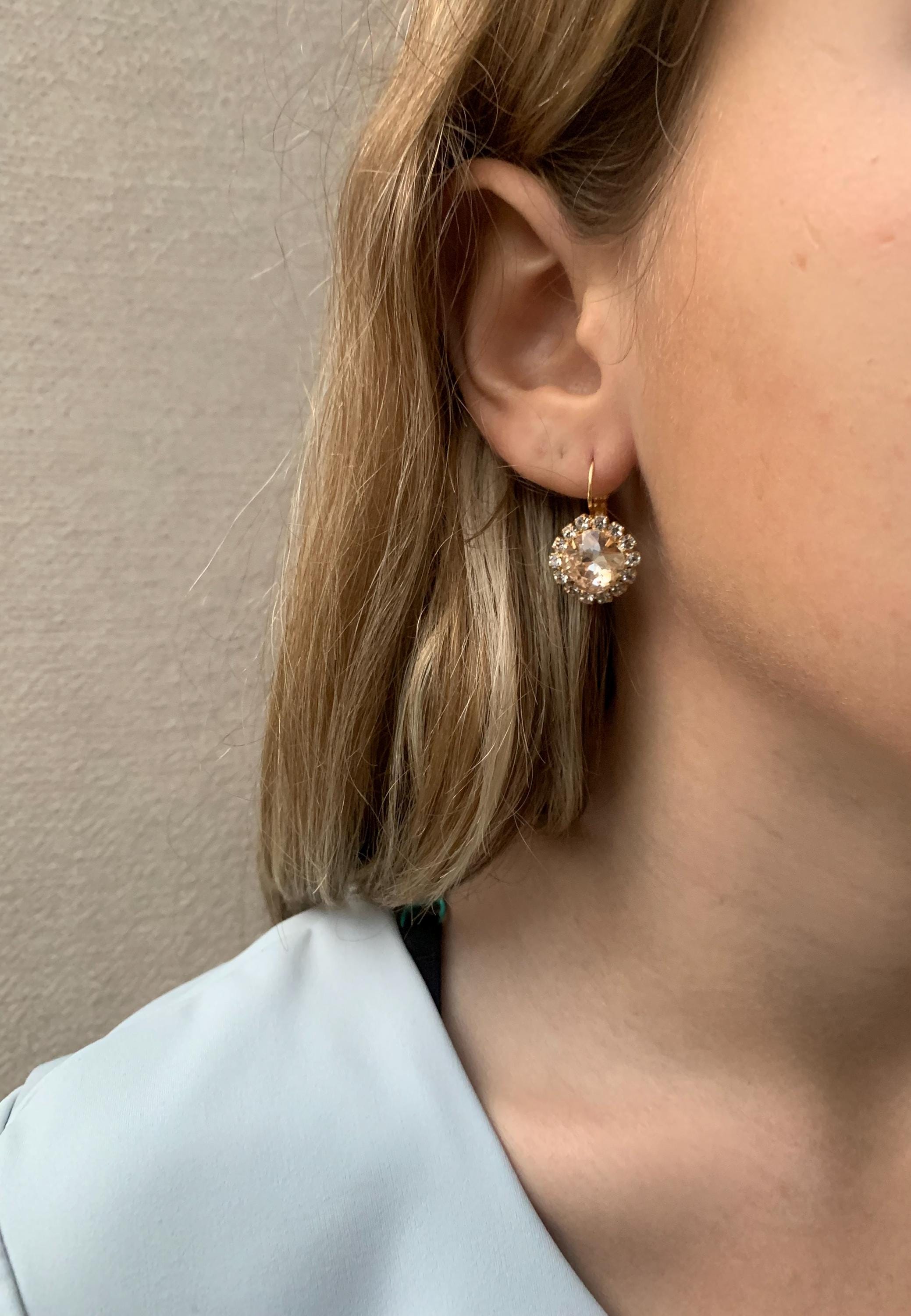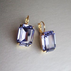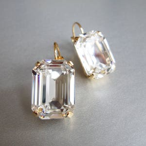 These sparkly earrings are made with fancy cushion cut Premium European Crystal and come in gold or silver finish.