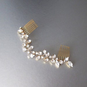 This flirty hair vine can be used with a variety of hair styles. Made with the Premium Quality European Crystal set in fancy settings. Very sparkly, flexible and easy to use. This hair vine measures about 8 1/2" long and about 2" wide at the widest point. Available in gold, silver or rose gold finish. Shown in rose gold finish.