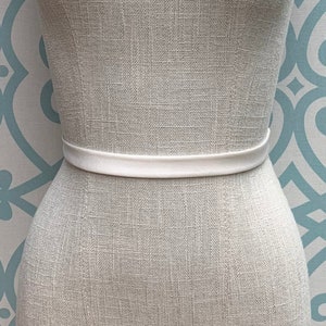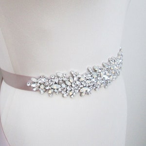 This sparkly skinny bridal belt is made with the Premium Quality European Crystal beaded on 3/8" wide double face satin ribbon. The crystal design measures 3" long and 1 1/4" wide in the center. The entire sash measures 150" long. Available in gold, silver or rose gold finish. Shown in the photos in rose gold finish with blush satin ribbon.